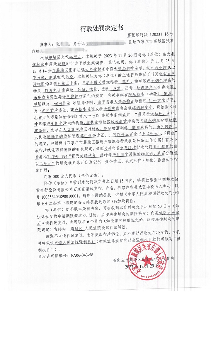 藁张综罚决〔2023〕16号大丰化村张秋芬露天焚烧案