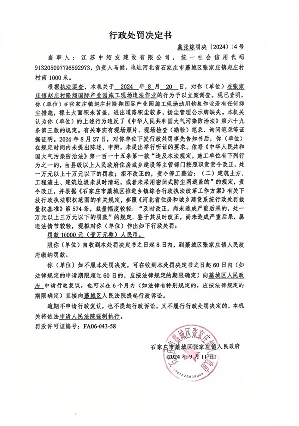 藁张综罚决〔2024〕14号石家庄市藁城区张家庄镇人民政府关于江苏中绍友建设有限公司施工现场违法作业案