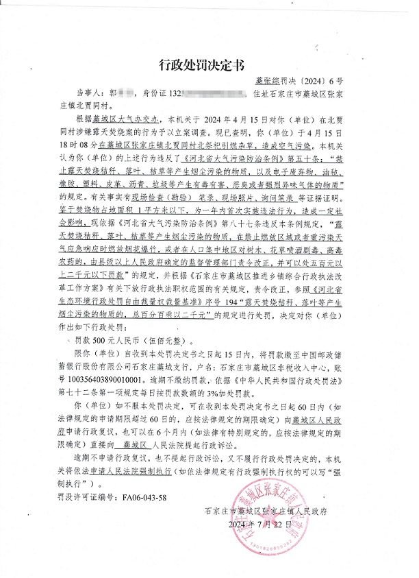 藁张综罚决〔2024〕6号北贾同村郭贵房露天焚烧案