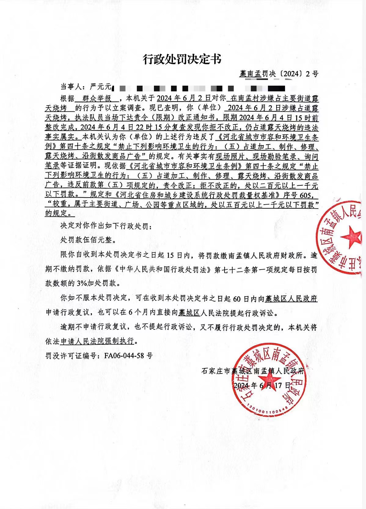 石家庄市藁城区南孟镇人民政府关于严元元占道露天烧烤案