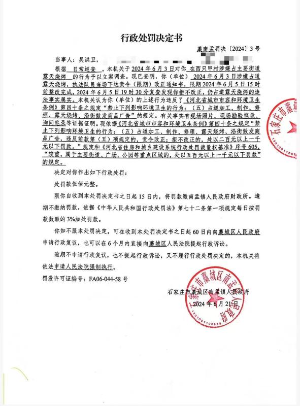 石家庄市藁城区南孟镇人民政府关于吴洪卫占道露天烧烤案