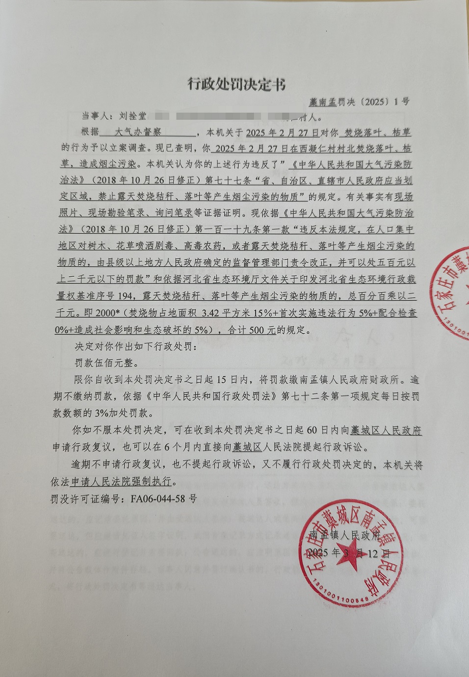 石家庄市藁城区南孟镇人民政府关于刘拴堂露天焚烧案