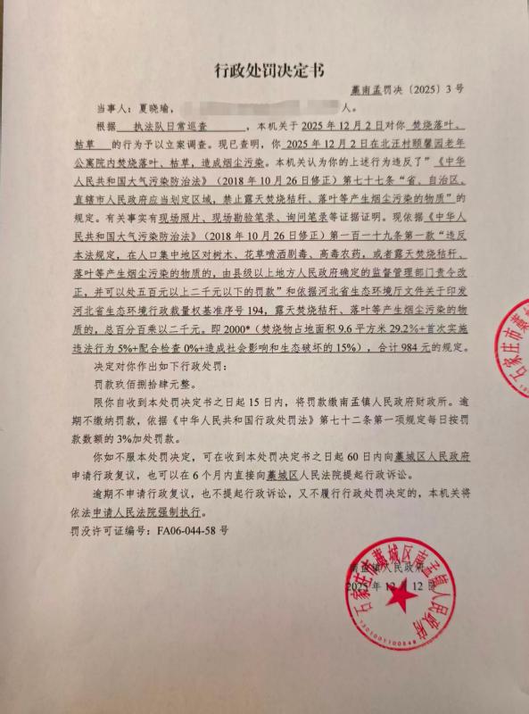 石家庄市藁城区南孟镇人民政府关于夏晓瑜露天焚烧案