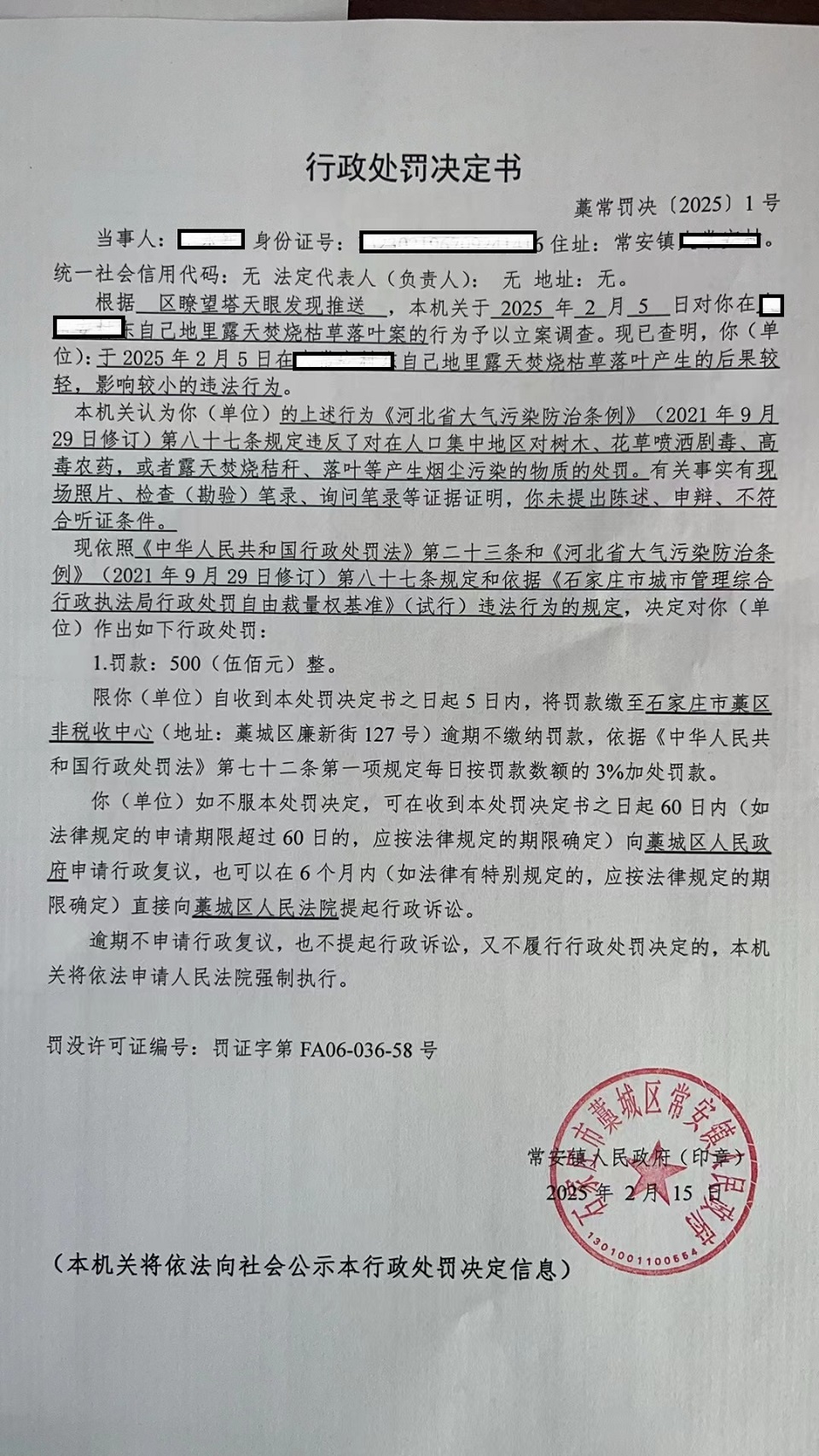 行政处罚藁常罚{2025}1号处罚决定书