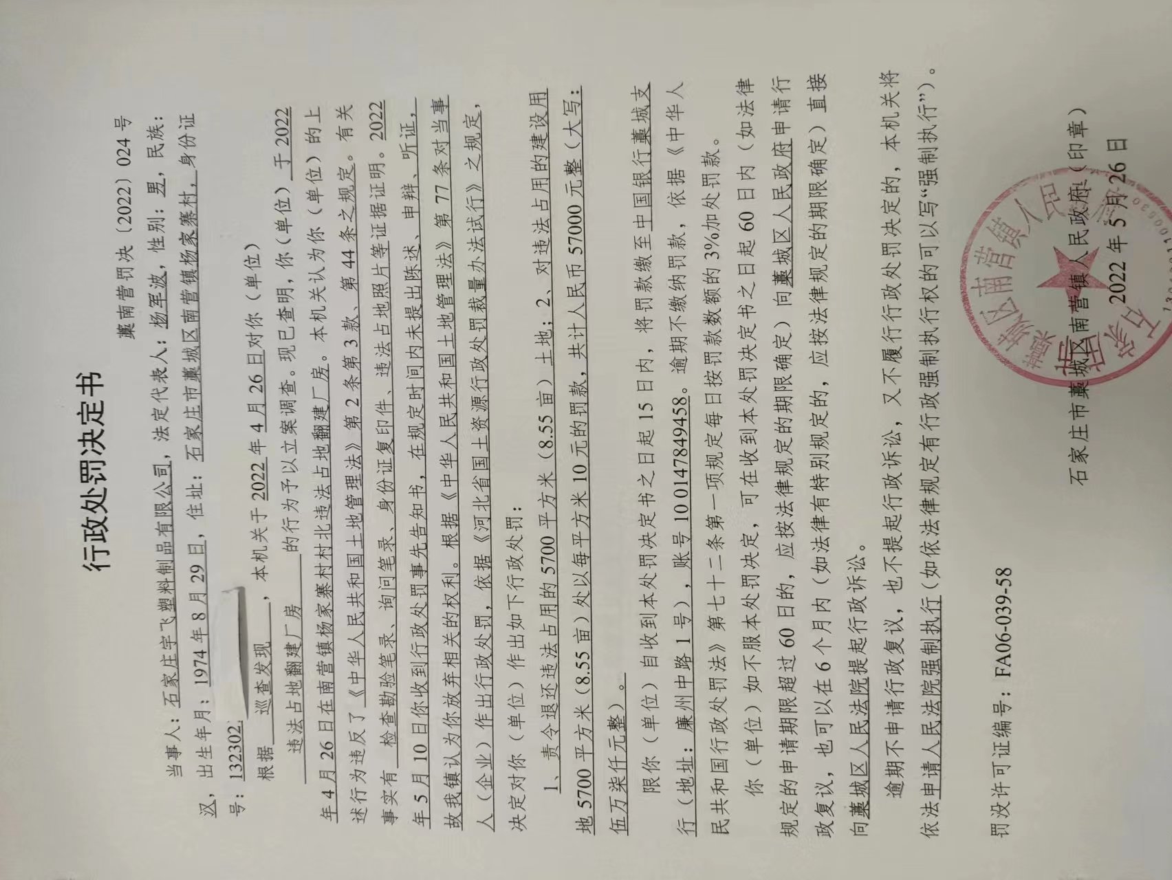 藁南营罚决[2022]024号