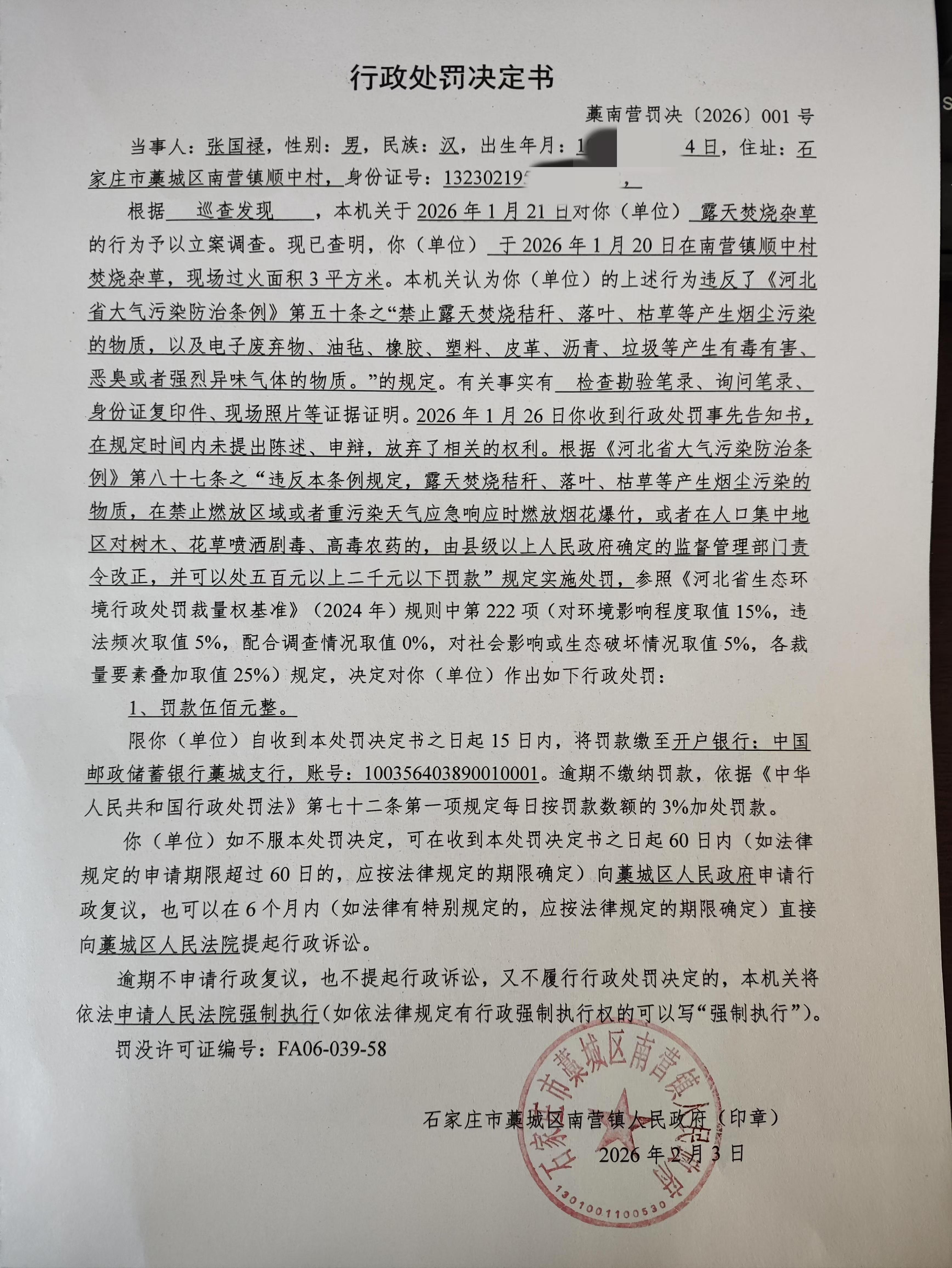 南营罚决〔2026〕001号