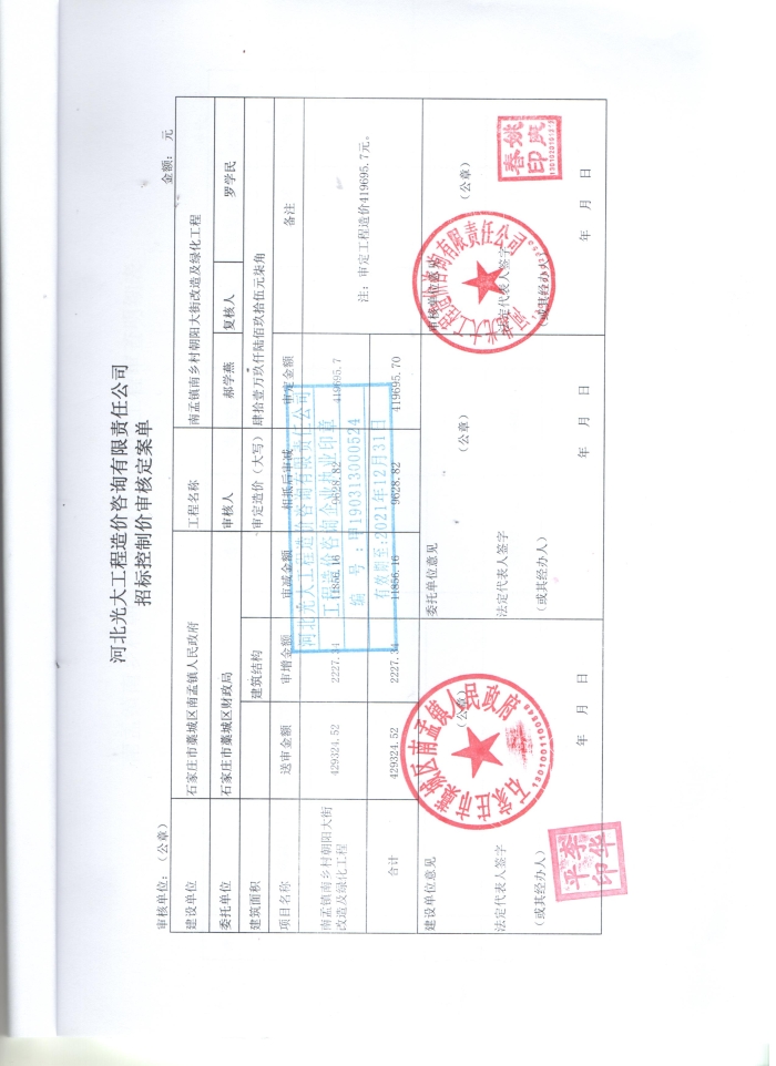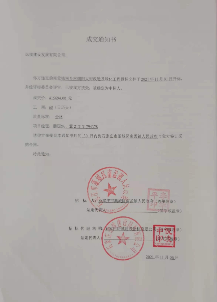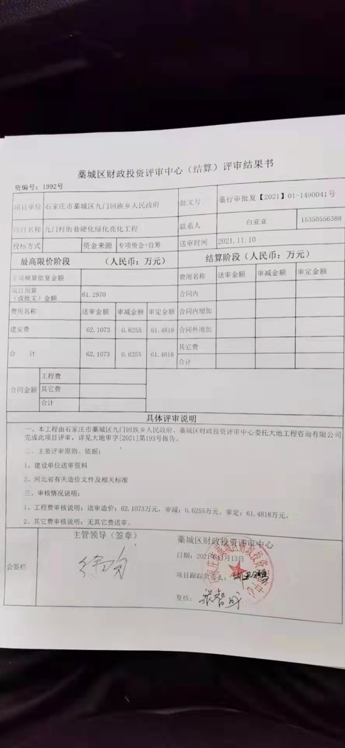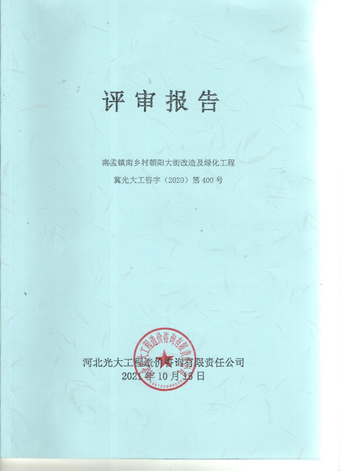 九门村街巷硬化绿化亮化工程评审报告、南乡村朝阳大街改造及绿化工程评审报告和中标通知书