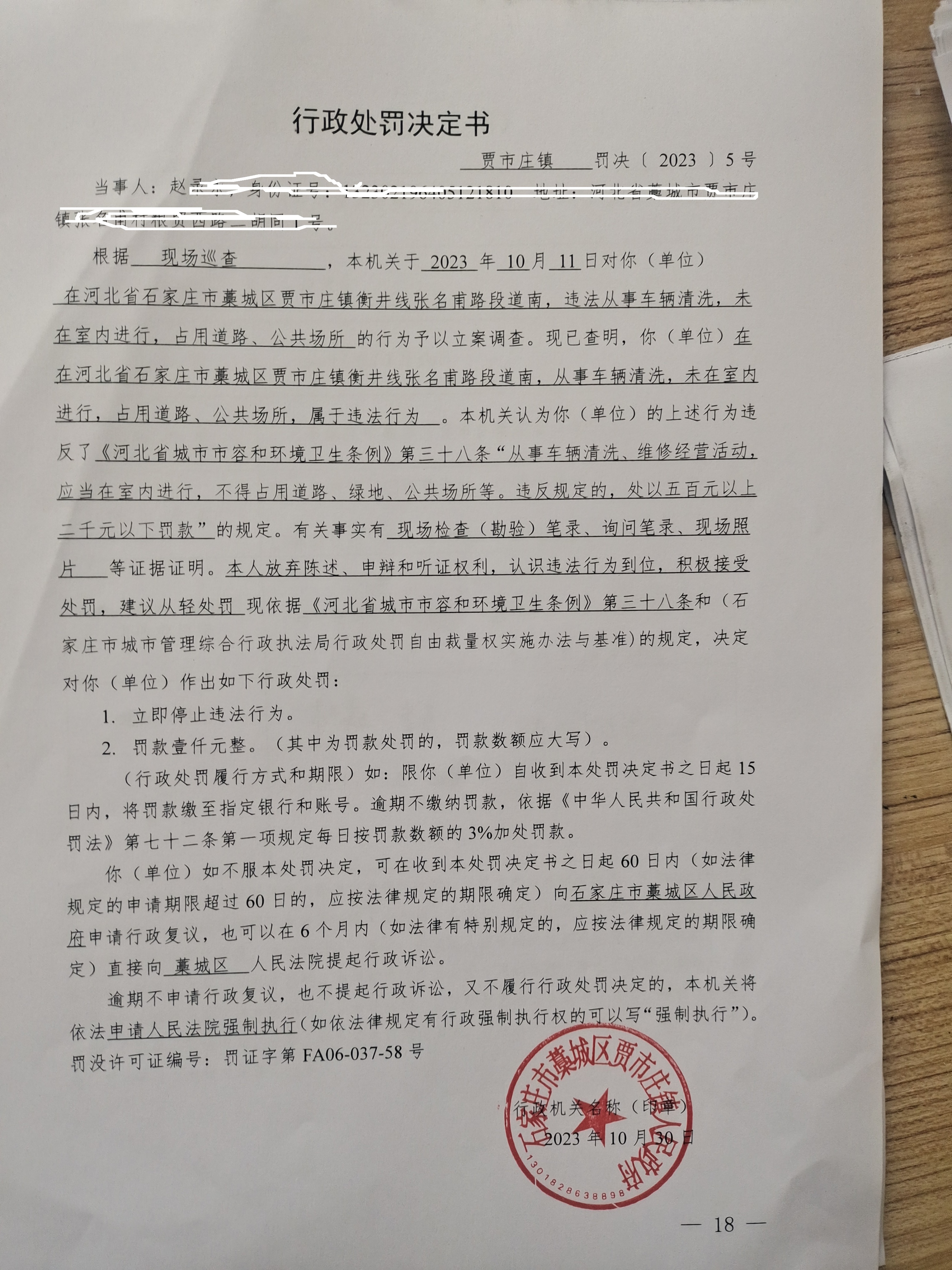 贾市庄镇罚决〔 2023〕5号