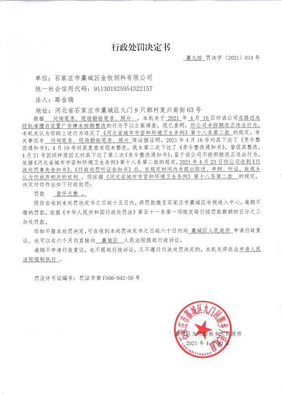 石家庄市藁城区金牧饲料有限公司未经批准擅自设置广告牌案