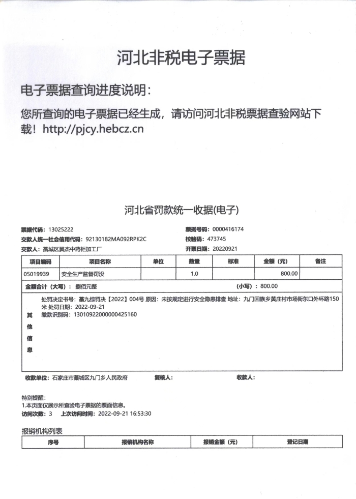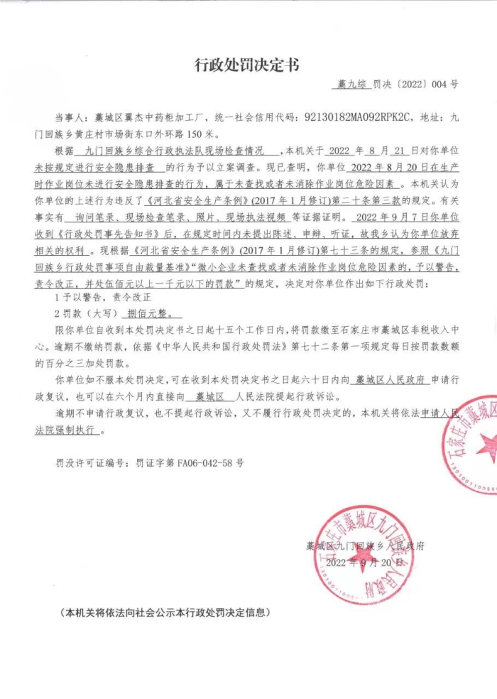 藁城区翼杰中药柜加工厂未按规定进行安全隐患排查案