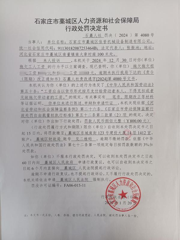 石家庄市藁城区佳誉机械设备制造有限公司拖欠工资处罚决定书