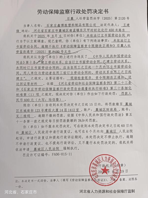 石家庄市鑫博胜塑料制品有限公司未依法订立书面劳动合同行政处罚决定书