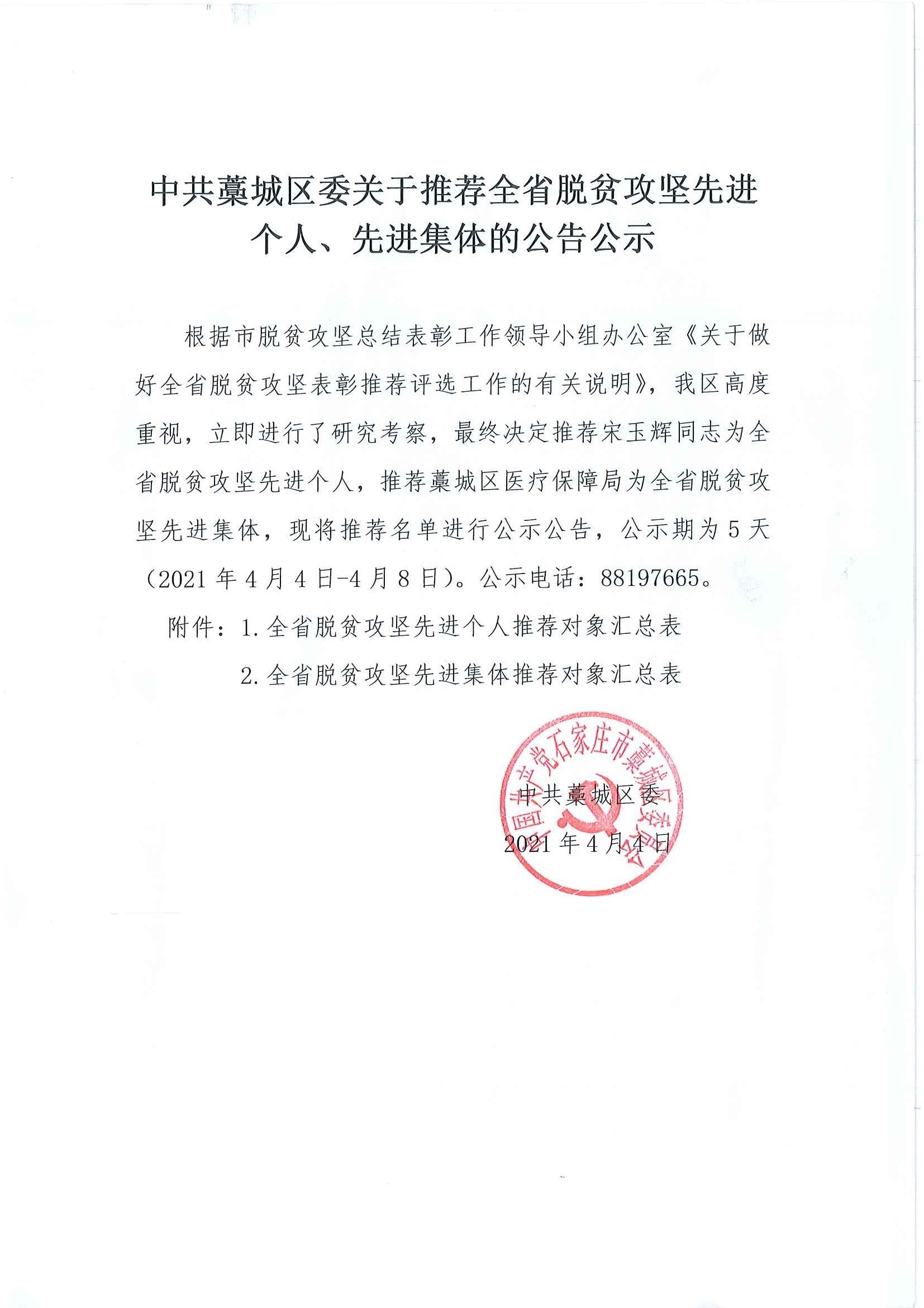 中共藁城区委关于推荐全省脱贫攻坚先进个人、先进集体的公告公示