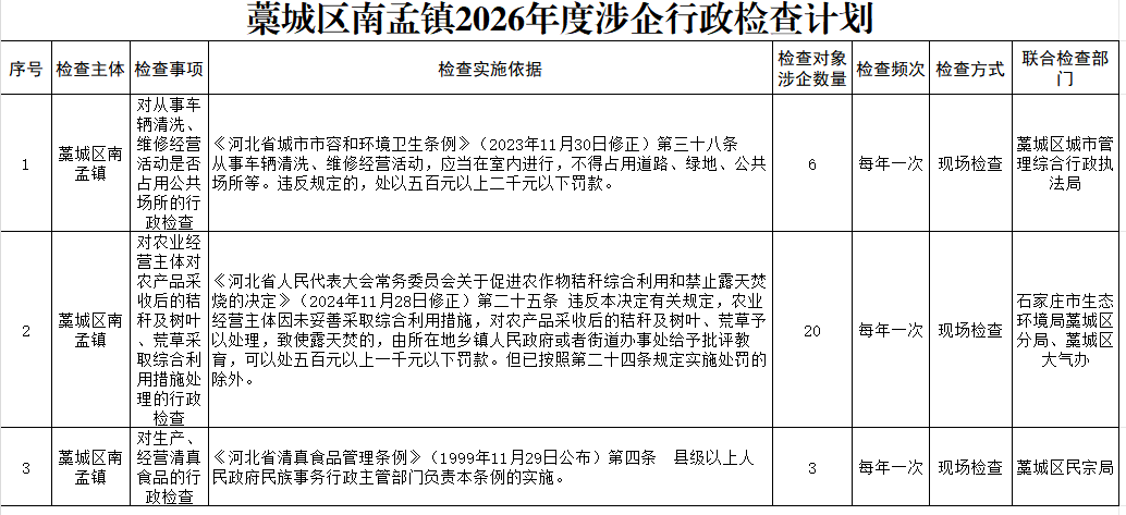 藁城区南孟镇2026年度涉企行政检查计划