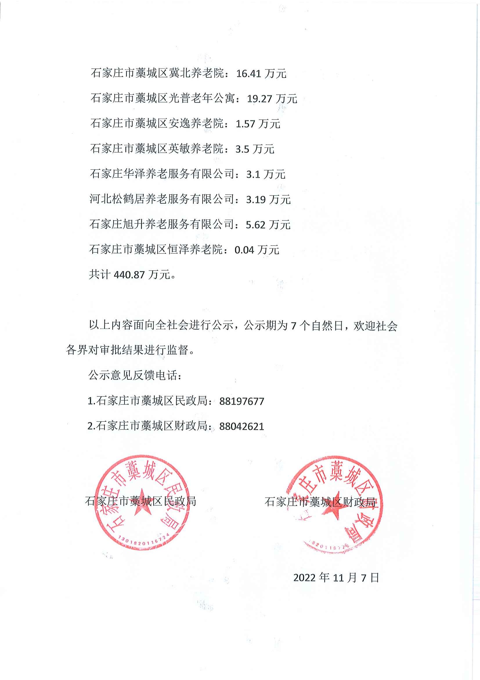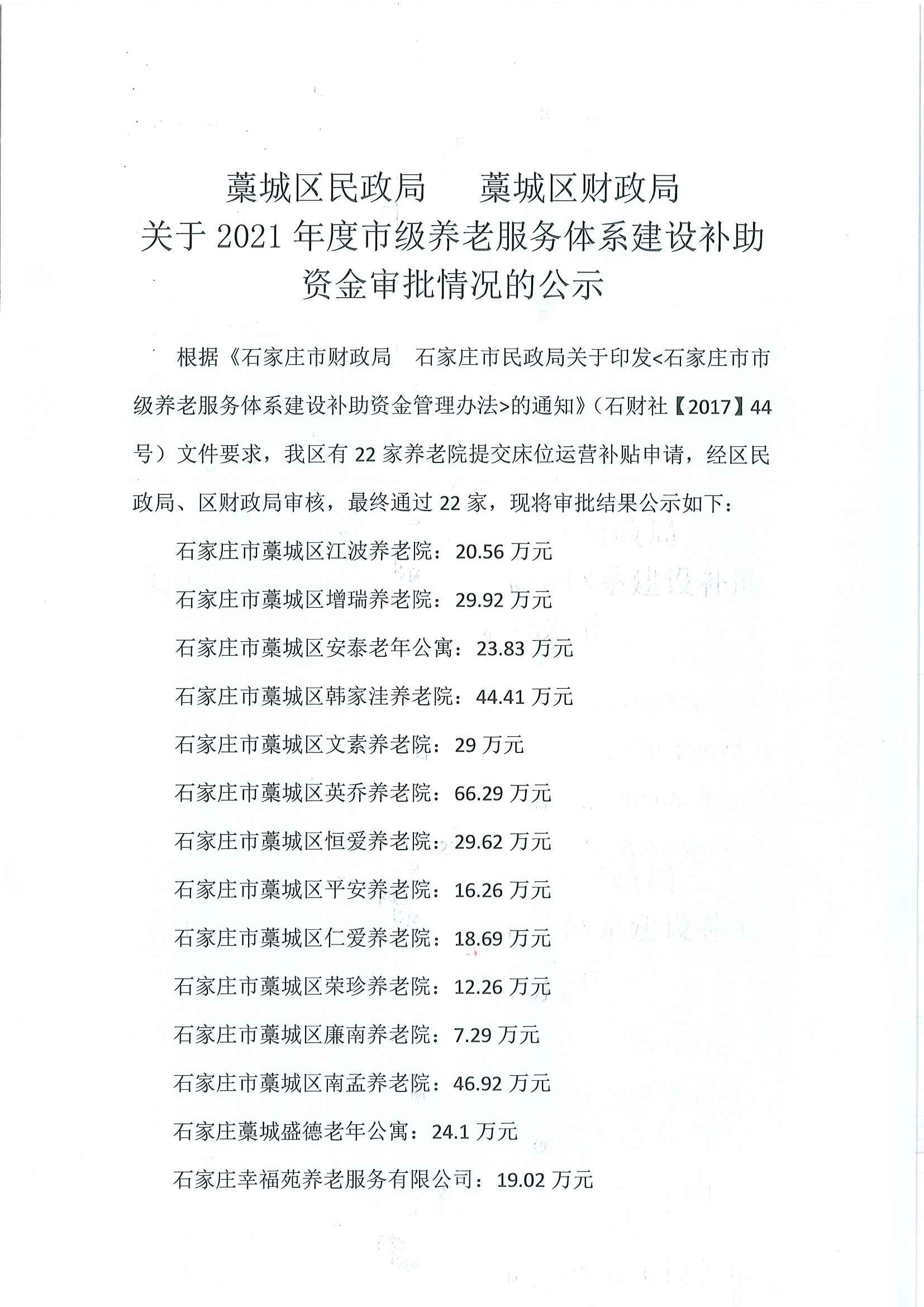 藁城区民政局 藁城区财政局关于2021年度市级养老服务体系建设补助资金审批情况的公示