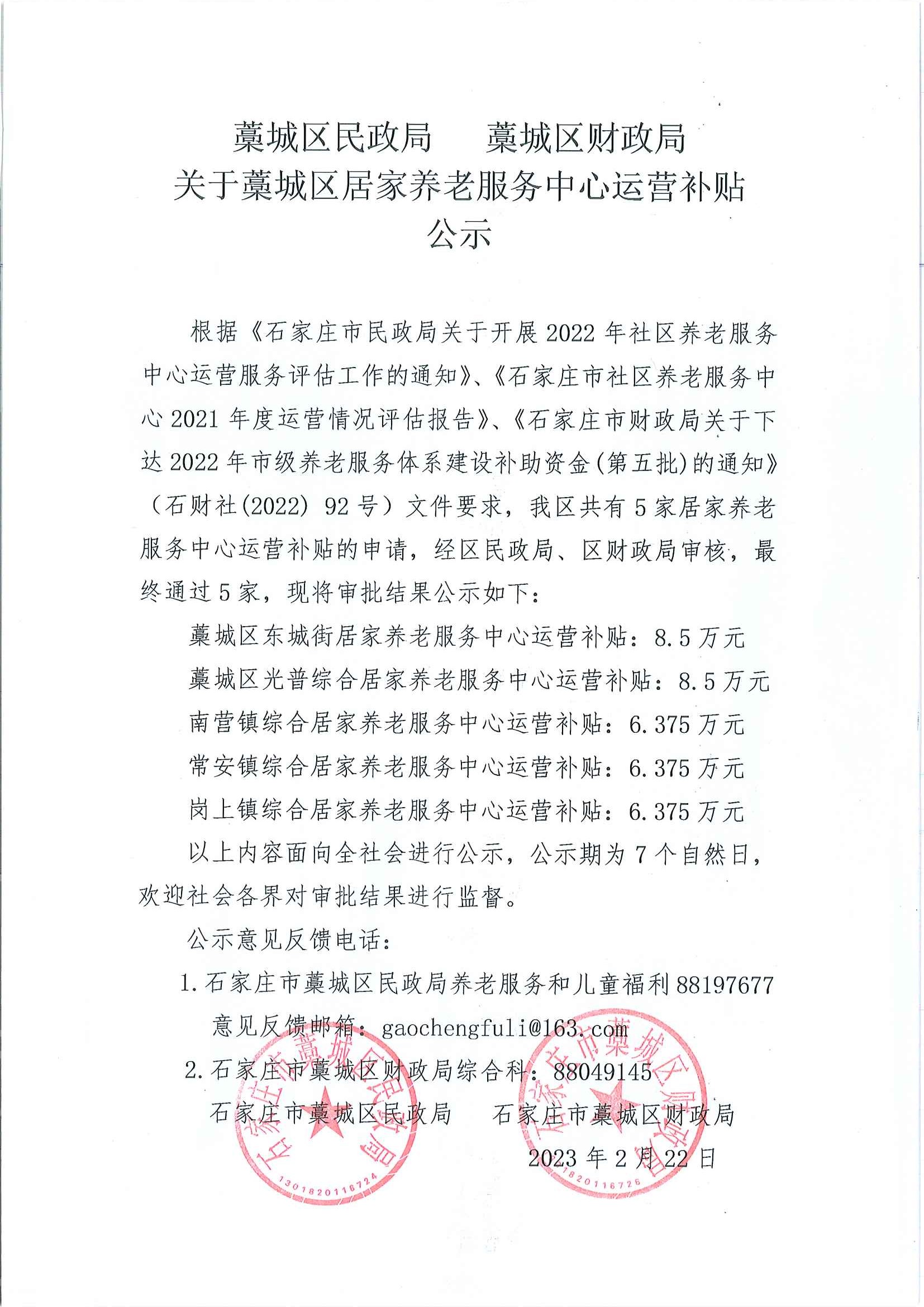 藁城区民政局 藁城区财政局关于藁城区居家养老服务中心运营补贴公示