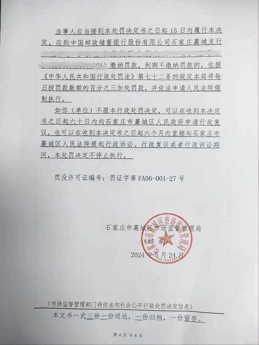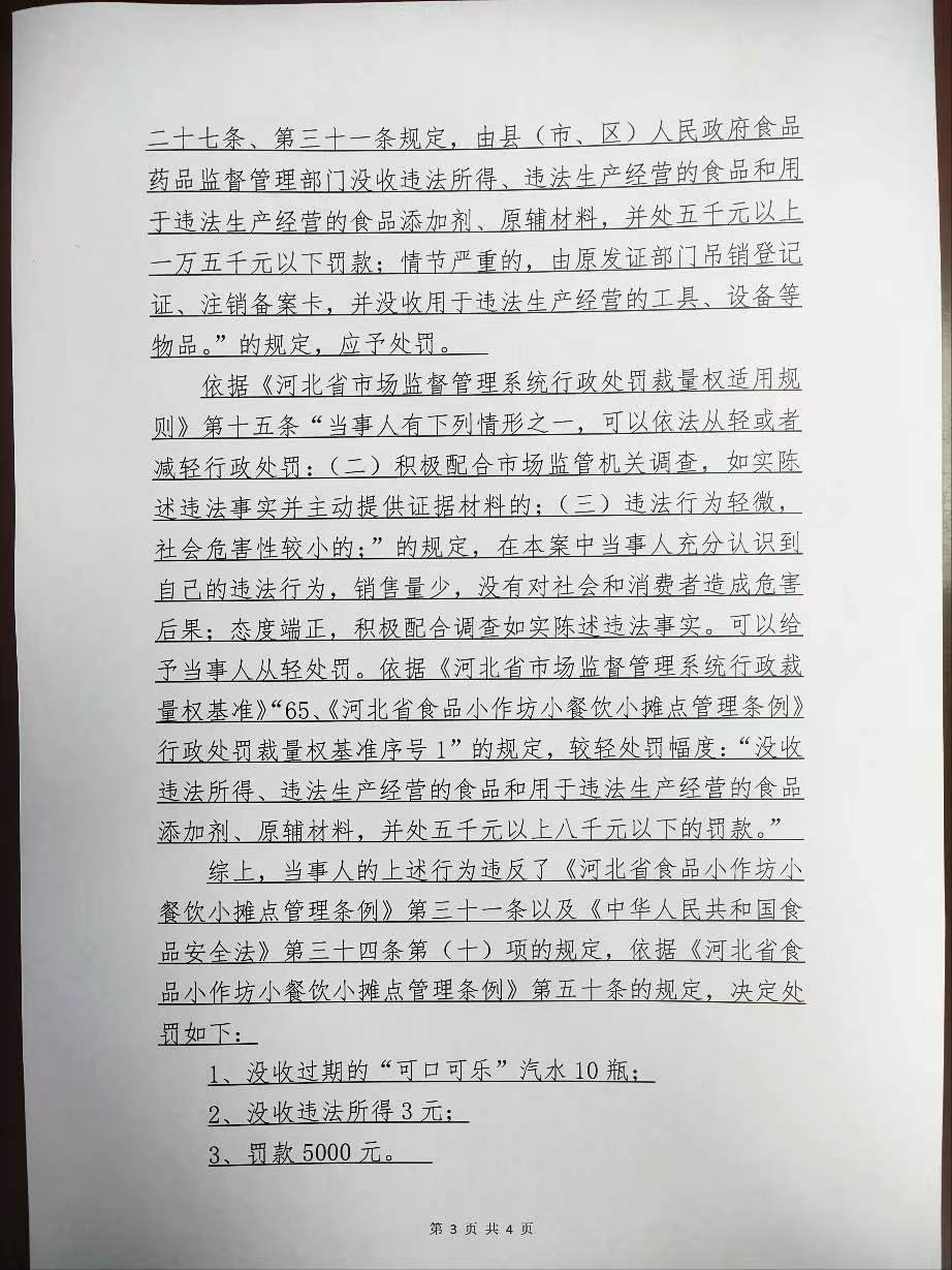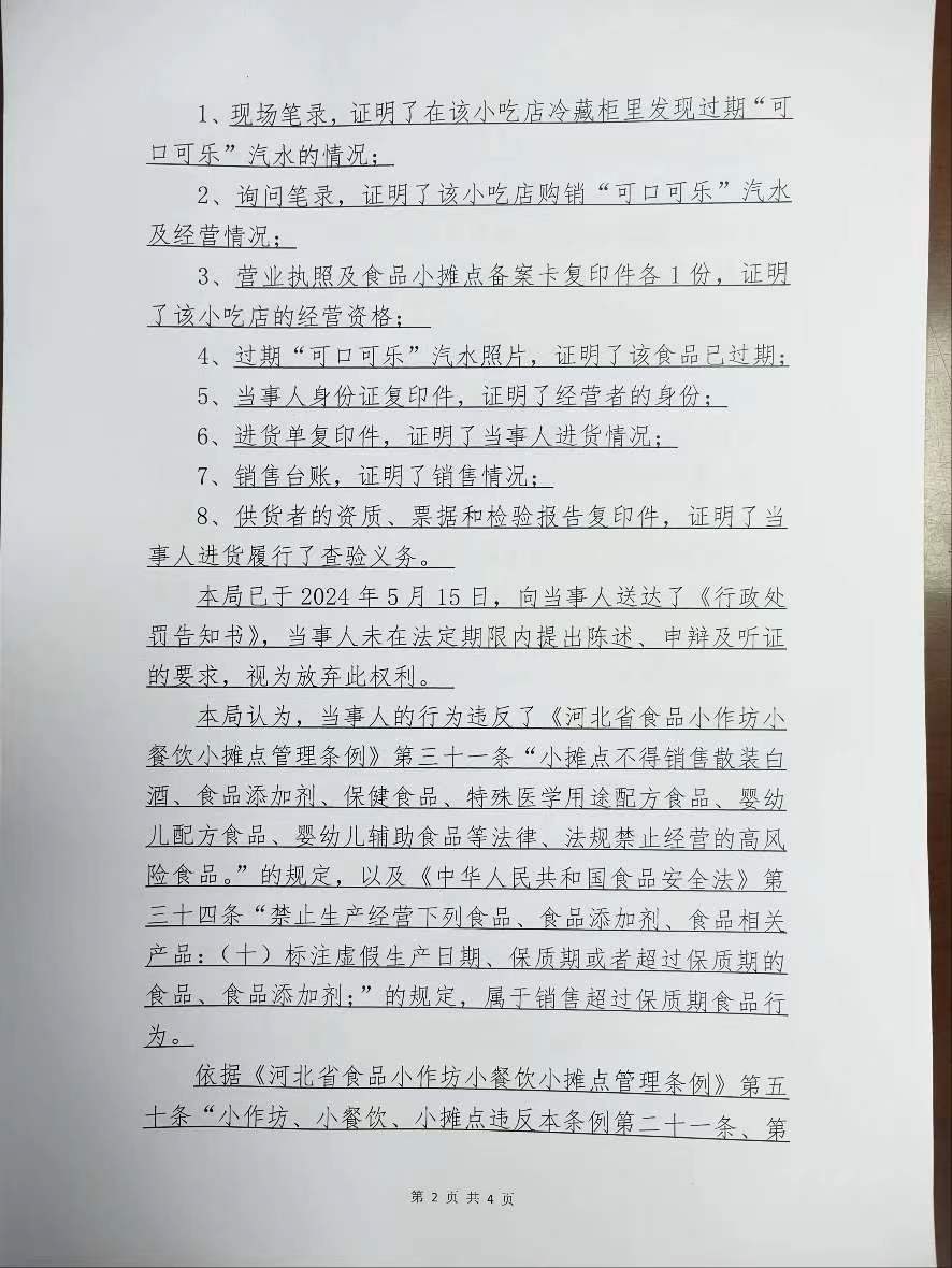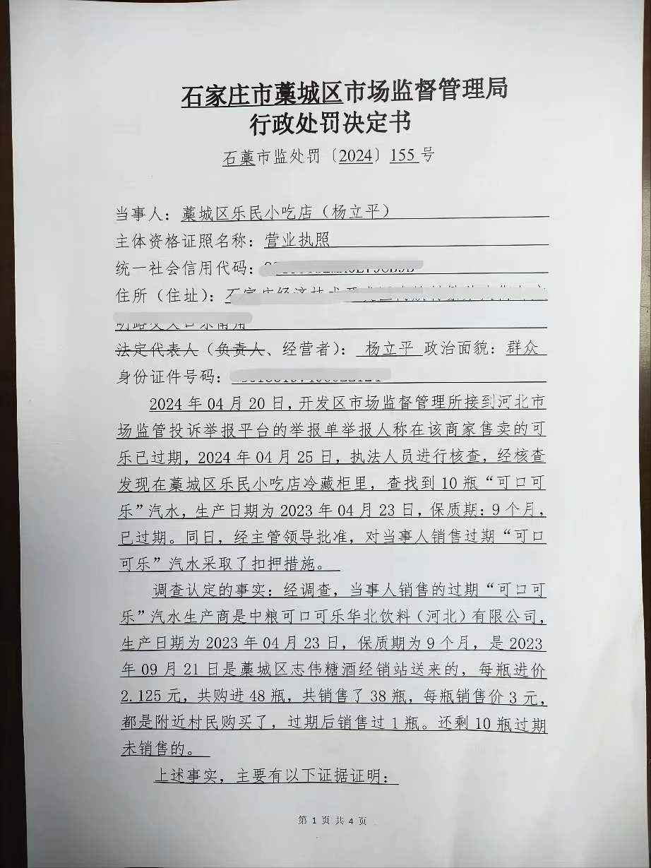 藁城区乐民小吃店(杨立平)销售过期“可口可乐”汽水案 石藁市监处罚〔2024〕155号