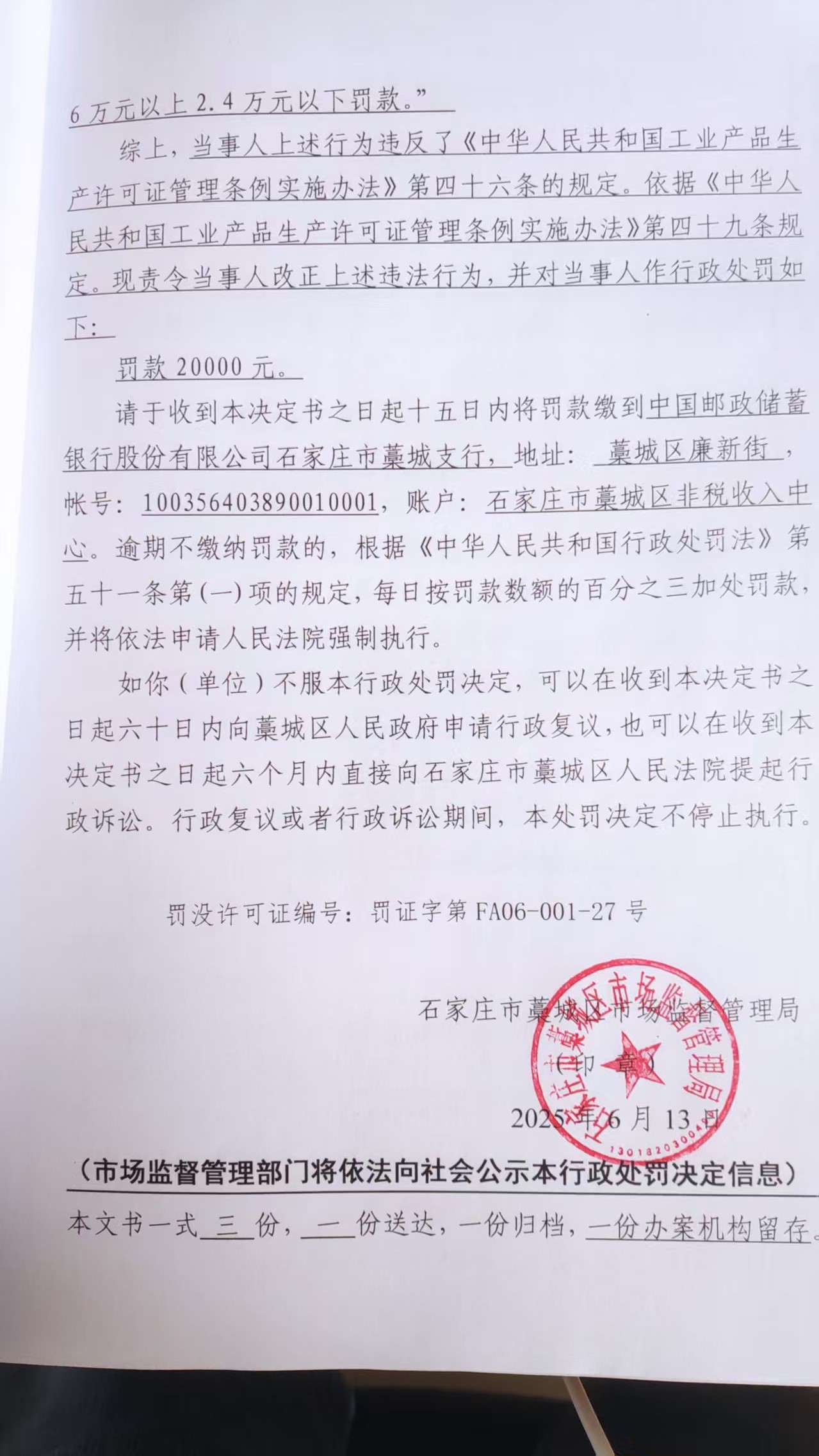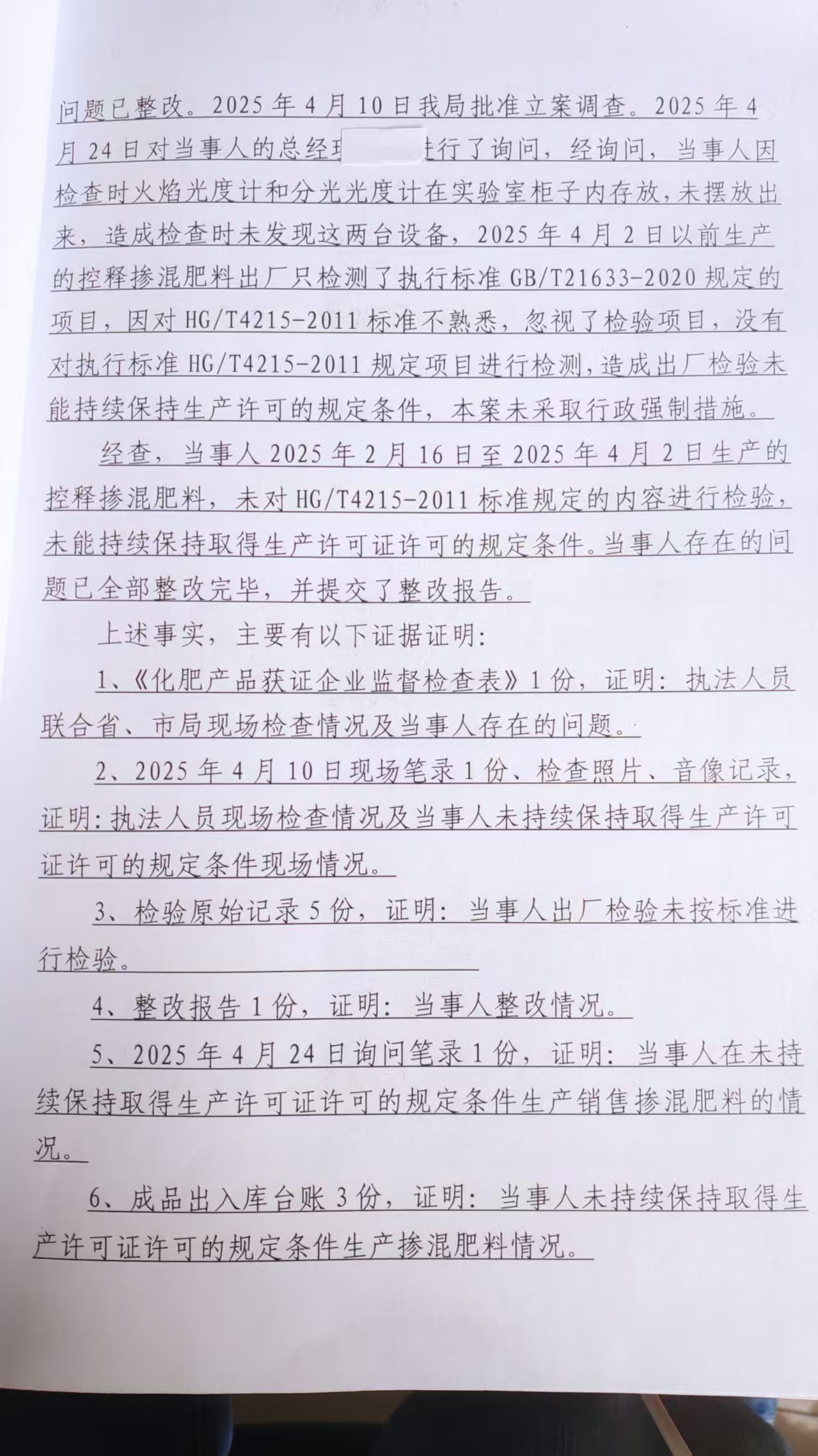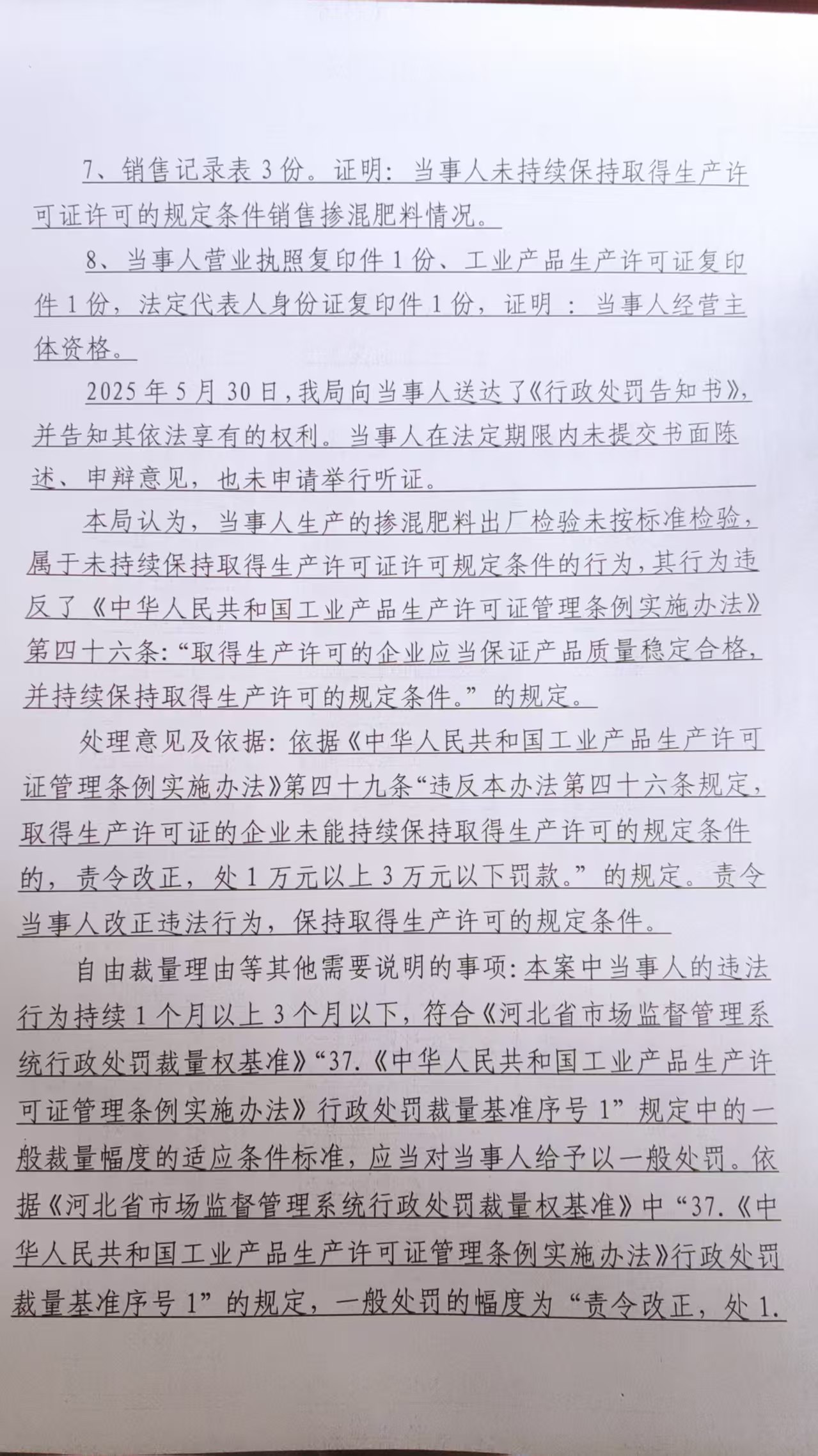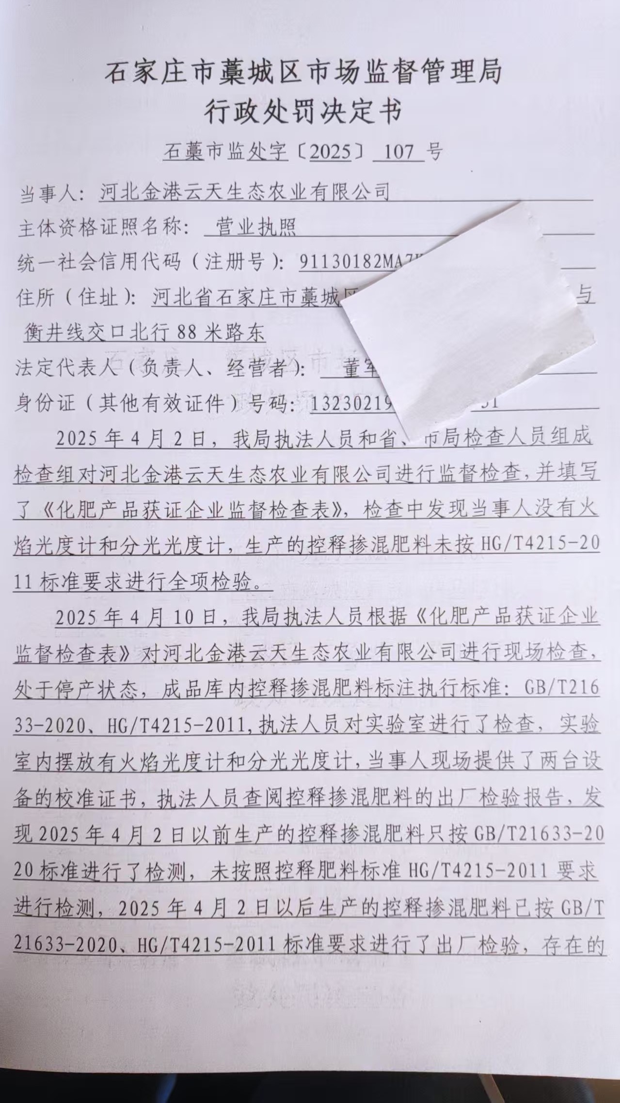 河北金港云天生态农业有限公司未持续保持生产许可规定条件生产销售掺混肥料案 石藁市监处字(2025)107号