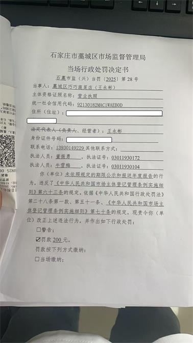 藁城区巧巧蔬菜店(王永彬)未依照规定的期限公示和报送2023年度报告 当罚{2028}第28号