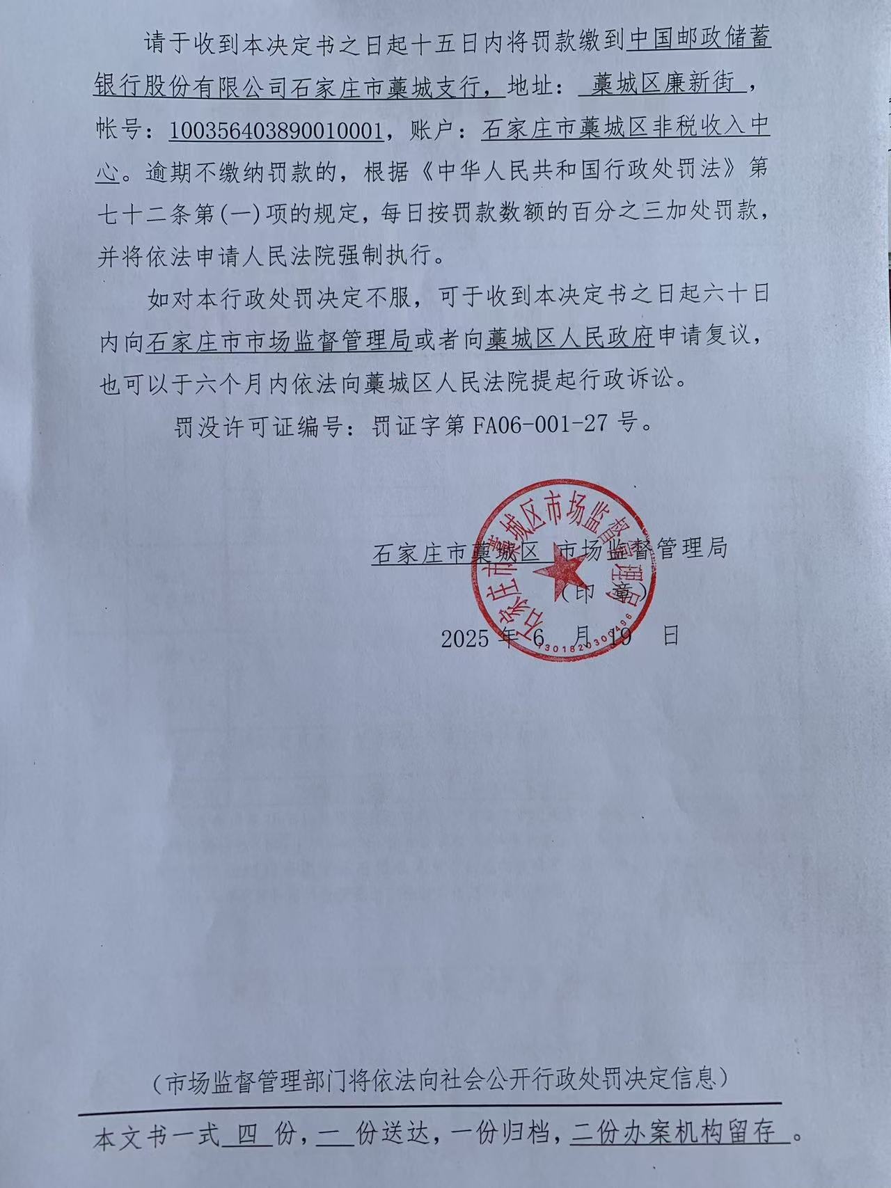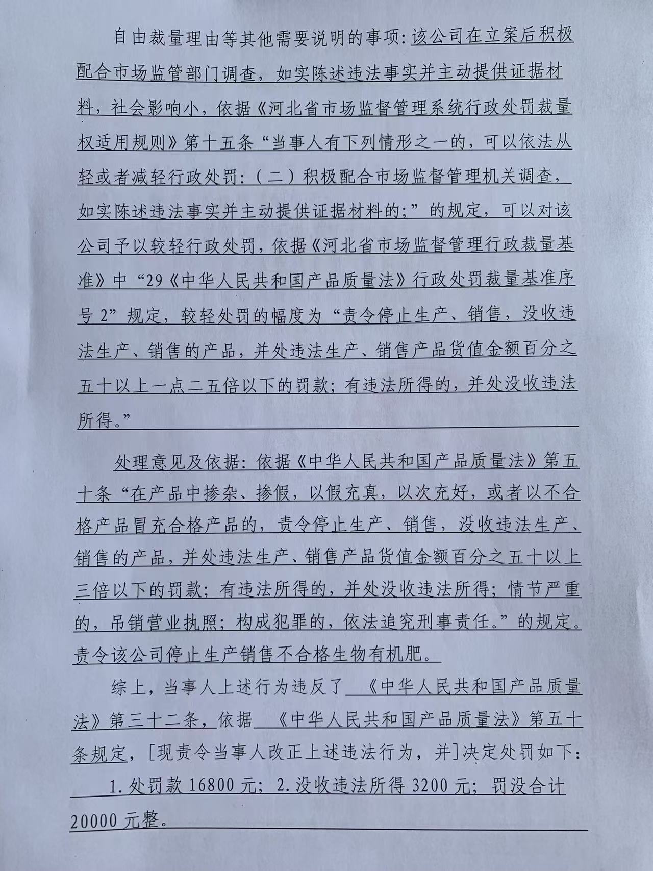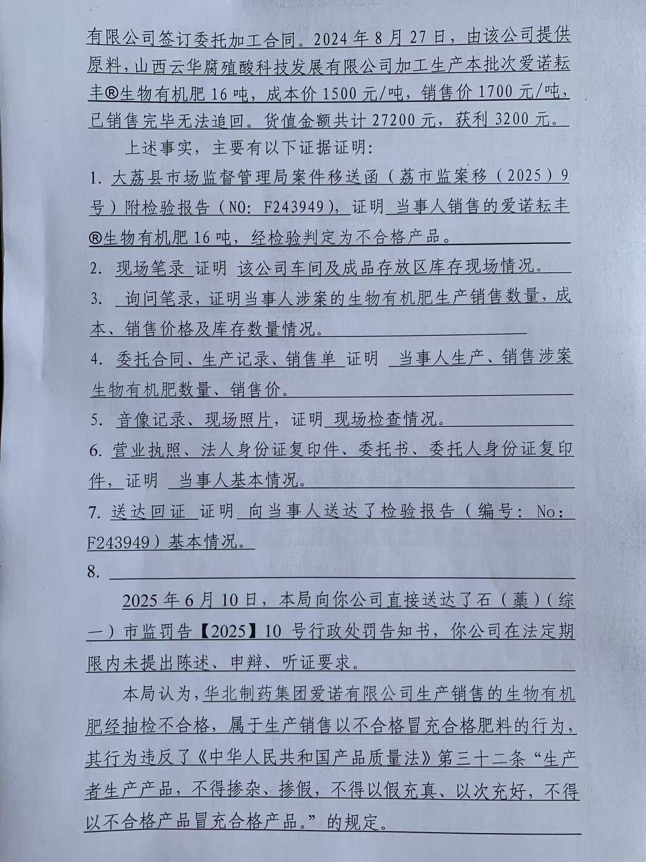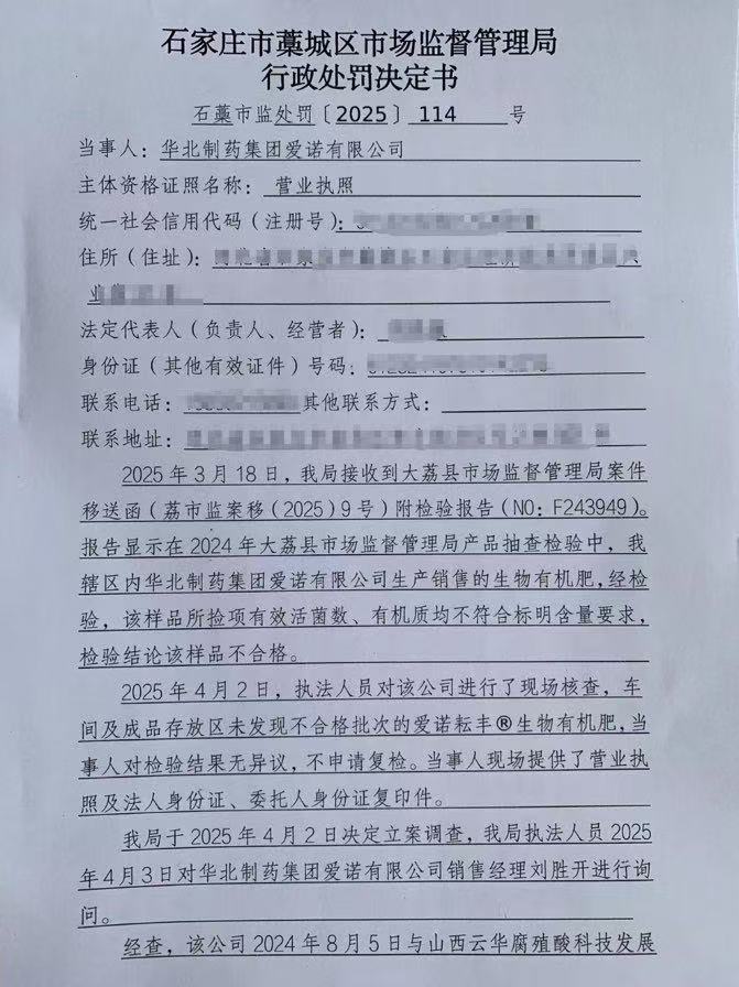 华北制药集团爱诺有限公司生产销售以不合格冒充合格生物有机肥案 石藁市监处罚【2025】114号