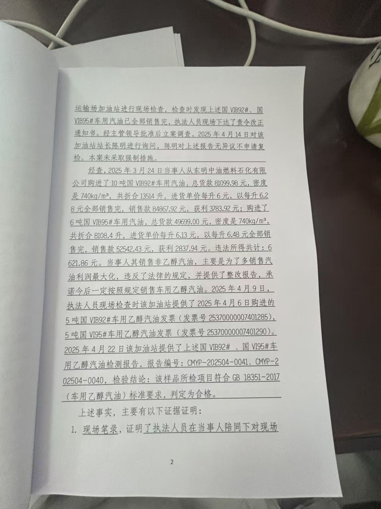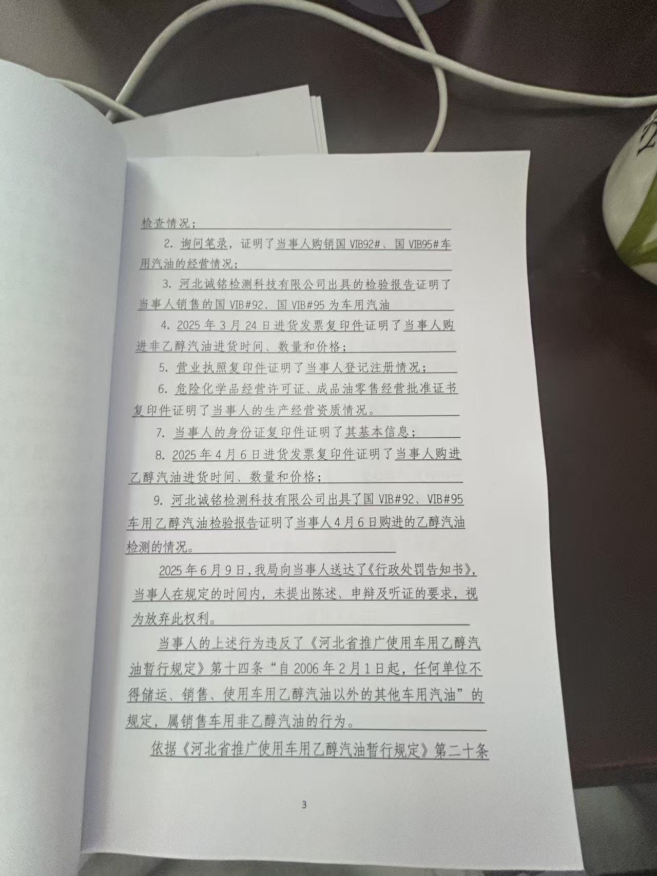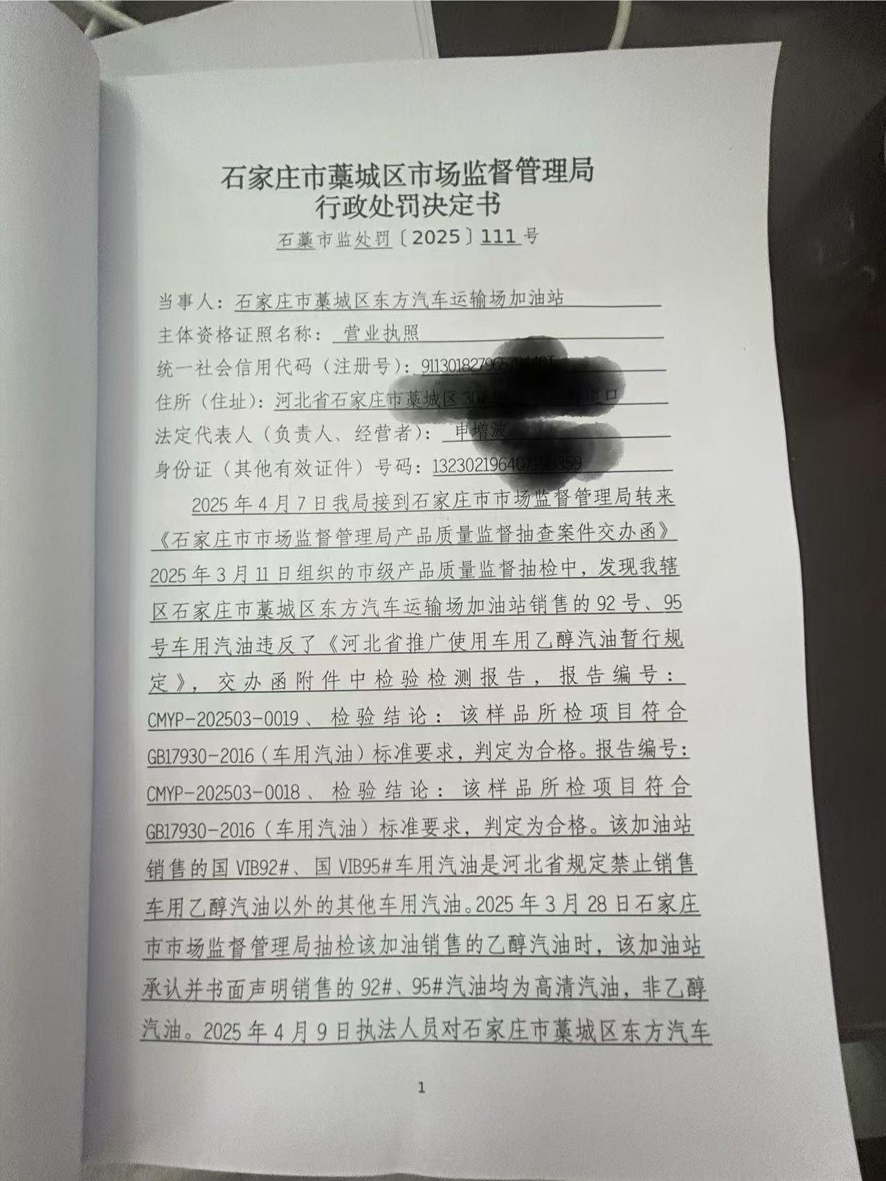 石家庄市藁城区东方汽车运输场加油站涉嫌销售国VIB92#、国VIB95#车用非乙醇汽油案 石藁市监处罚〔2025〕111号