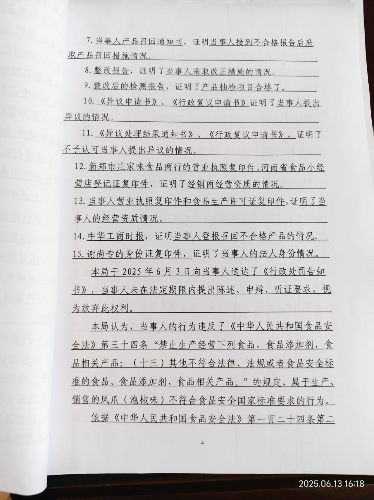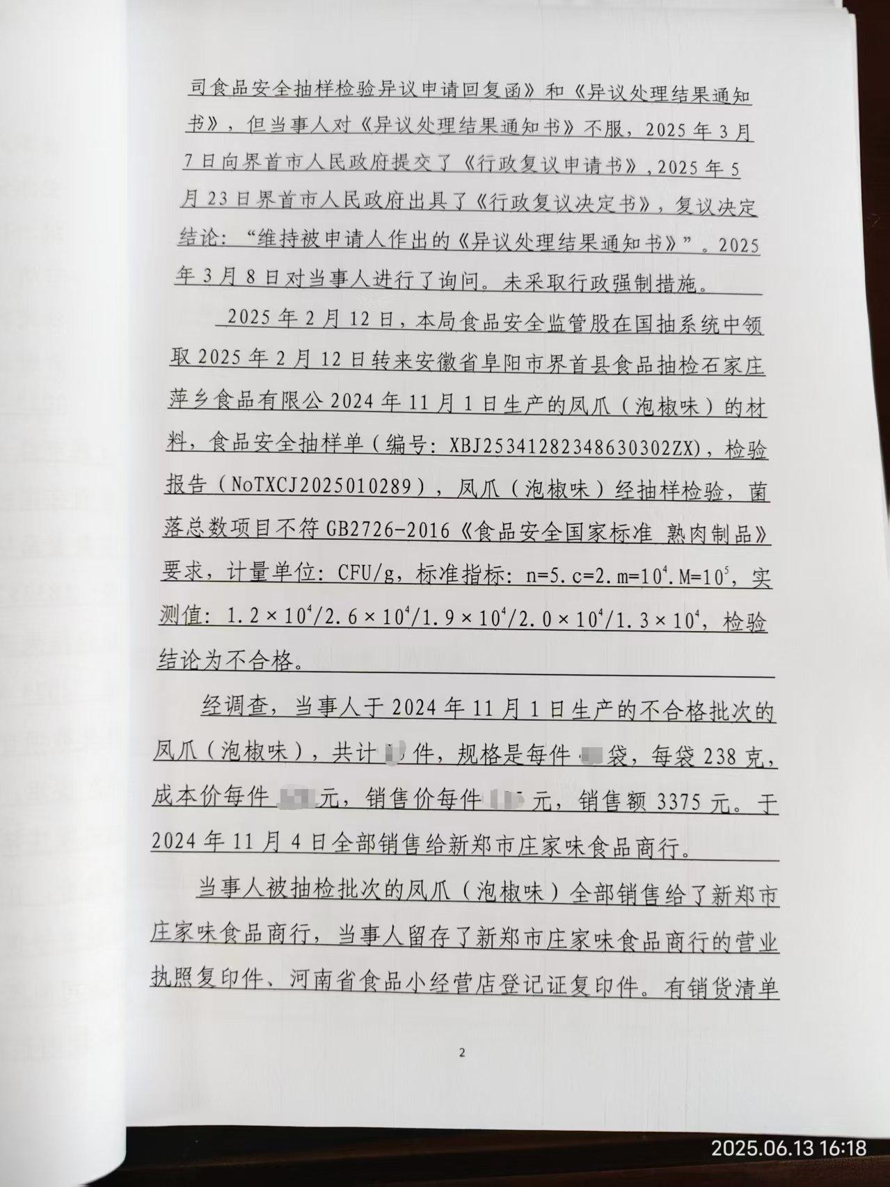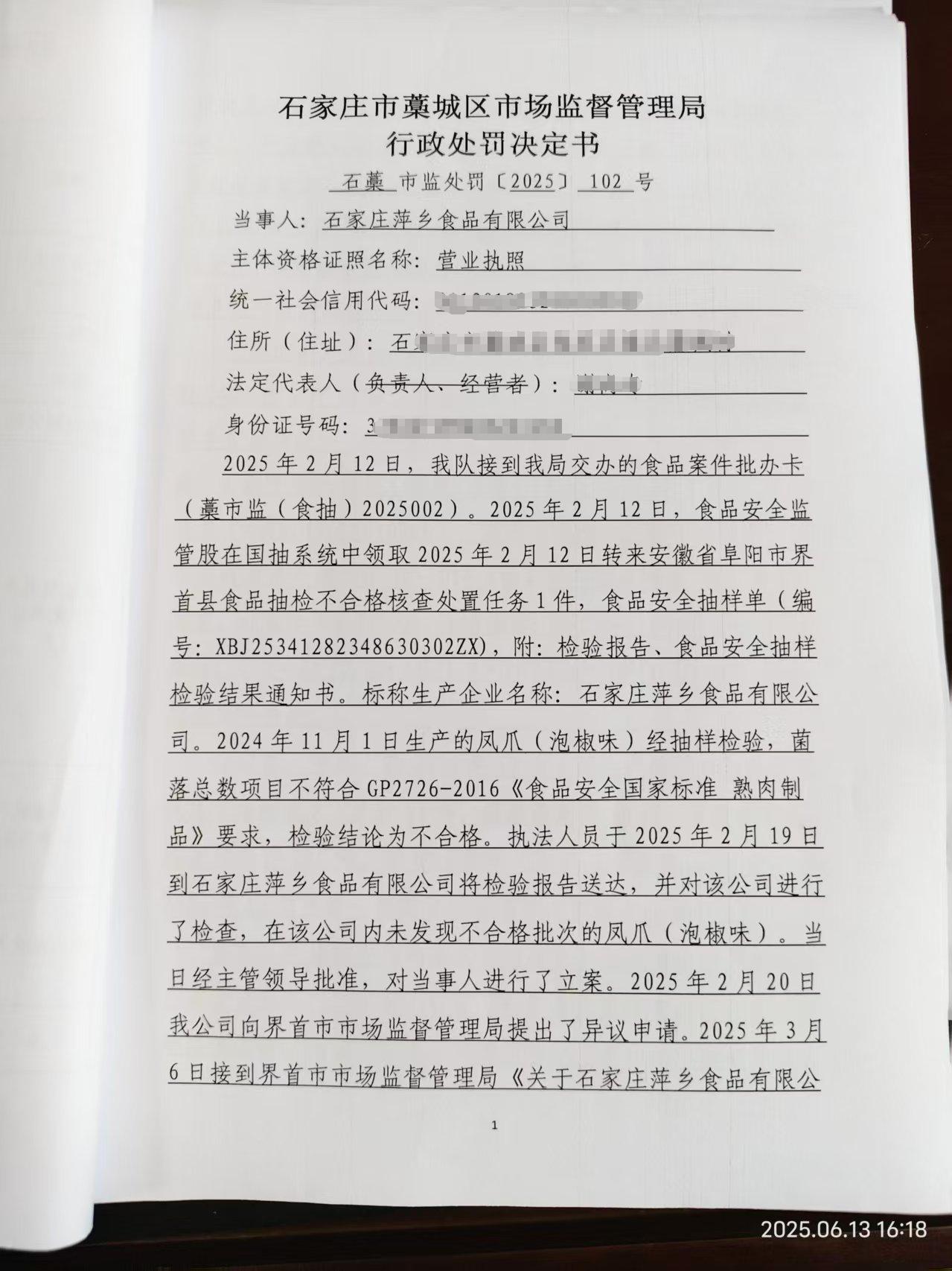 石家庄萍乡食品有限公司生产、销售不符合食品安全标准的凤爪(泡椒味)案 石藁市监处罚 〔2025〕102号