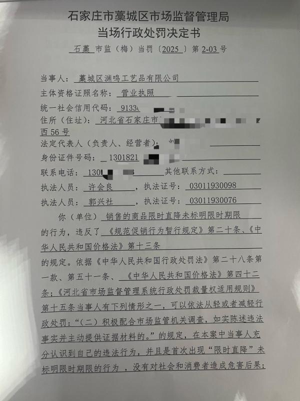 藁城区渊鸣工艺品有限公司(刘晓广)价格违法销售手持礼炮案 当场行政处罚决定书 石藁市监(梅)当罚﹝2025﹞第2-03号