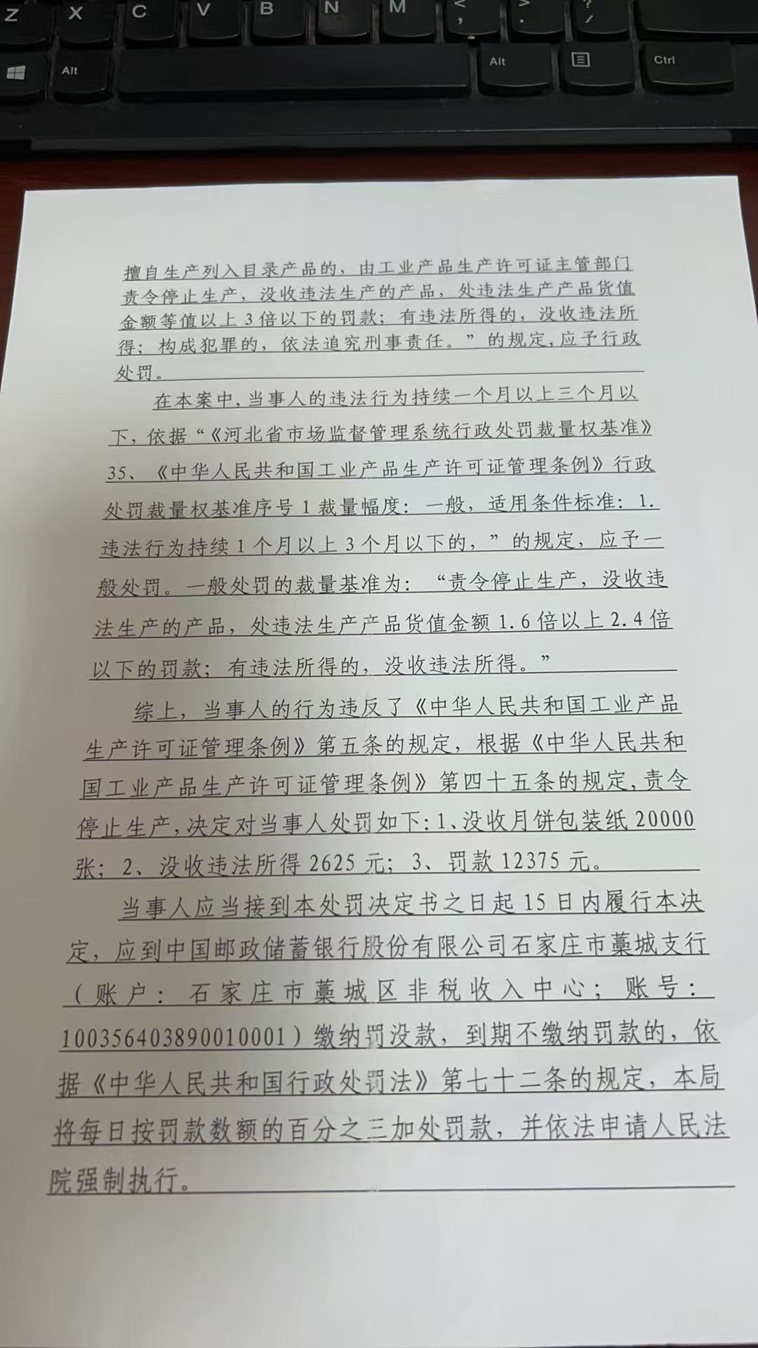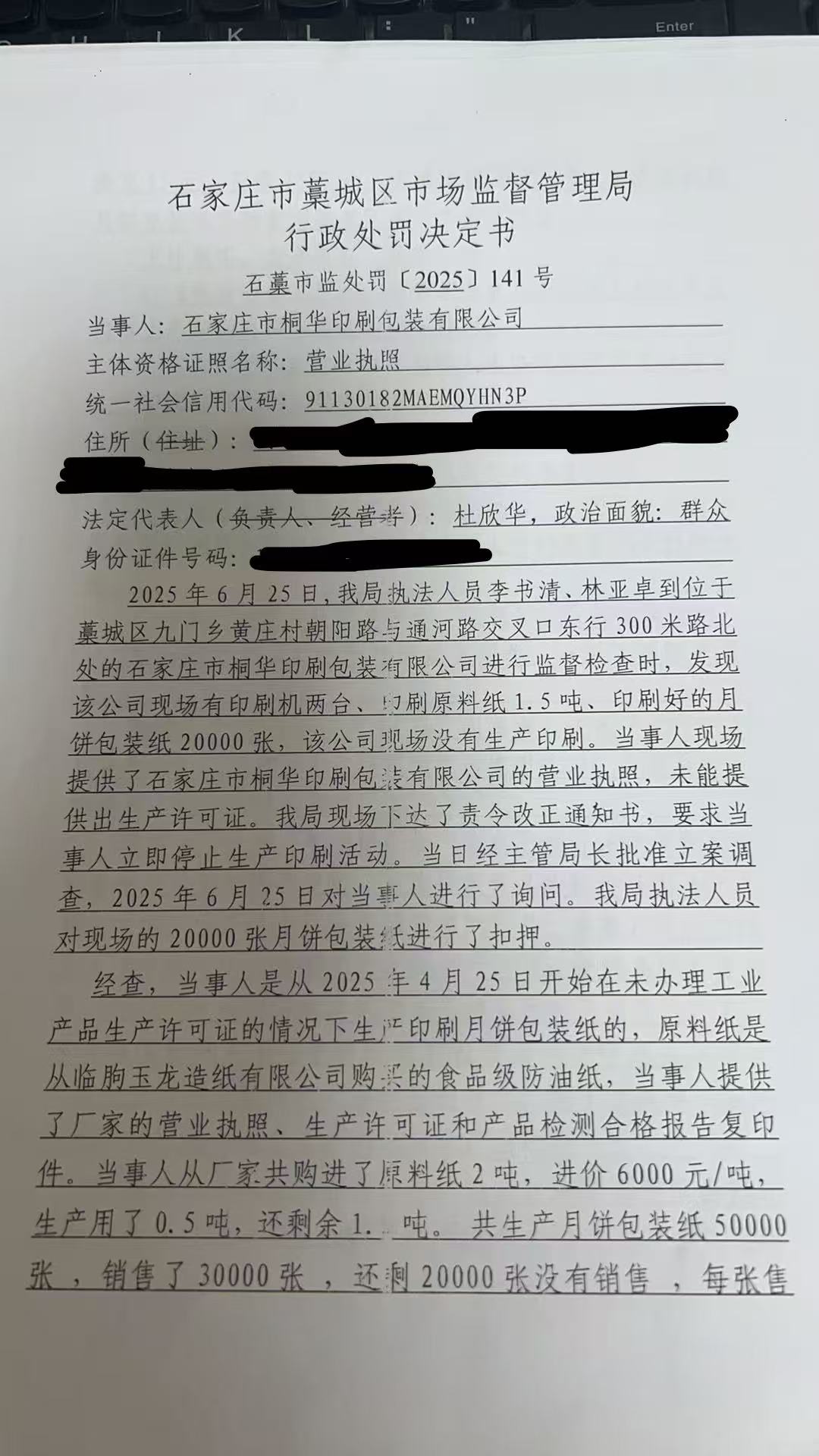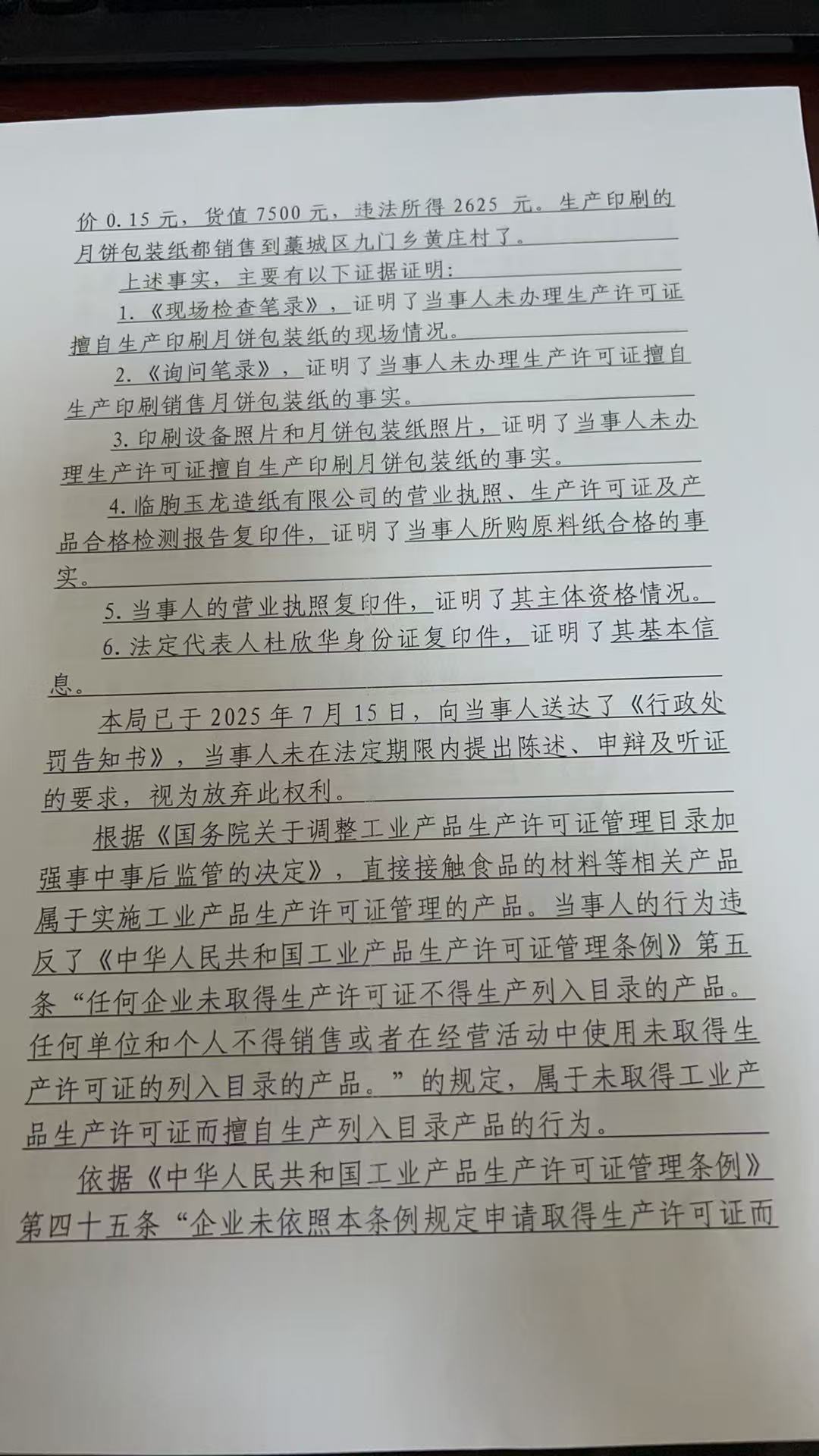 石家庄市桐华印刷包装有限公司未取得生产许可证擅自生产销售月饼包装纸案
