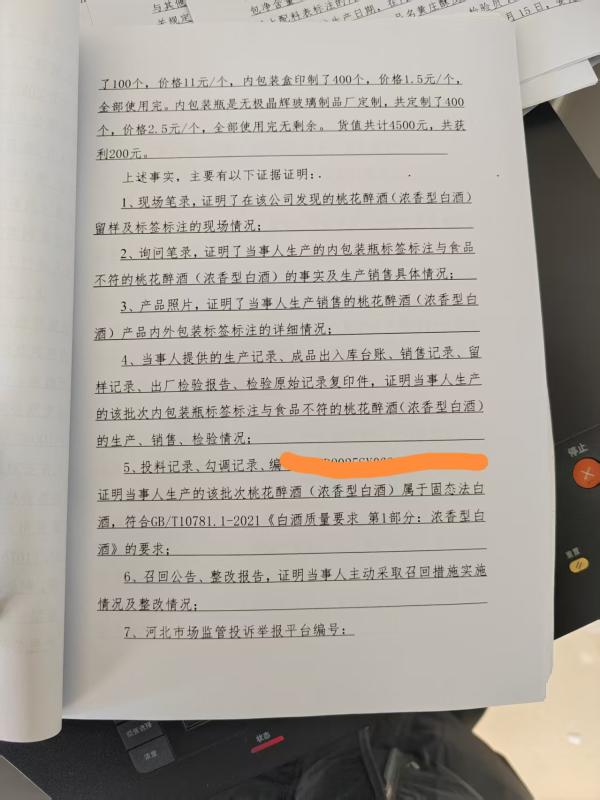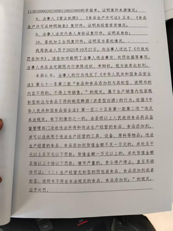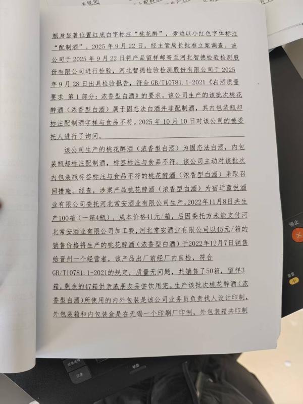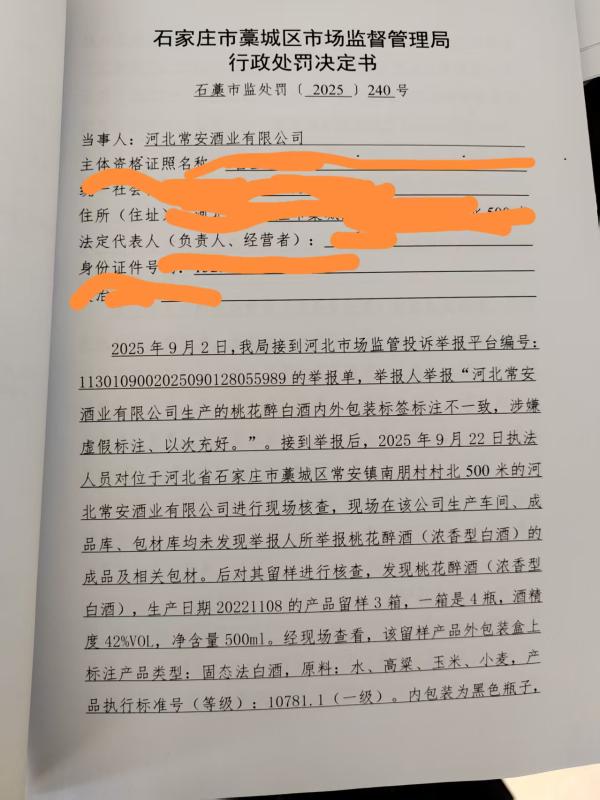 河北常安酒业有限公司生产销售内包装瓶标签标注与食品不符的桃花醉酒(浓香型白酒)案(石藁市监处罚【2025】240号)