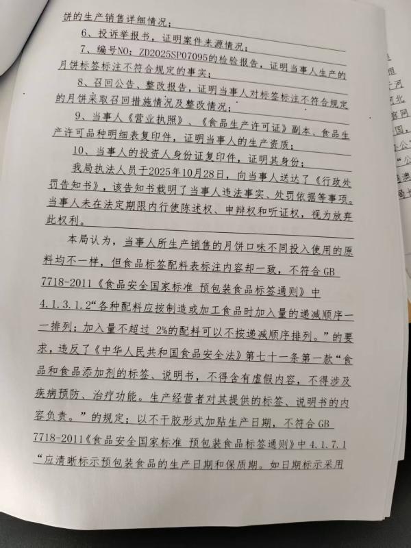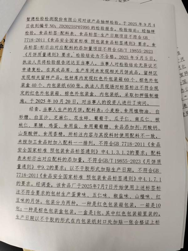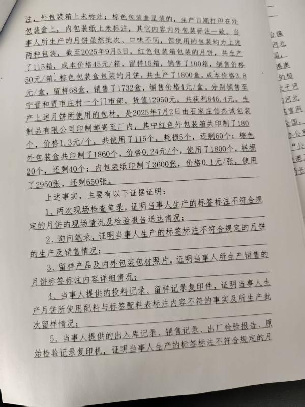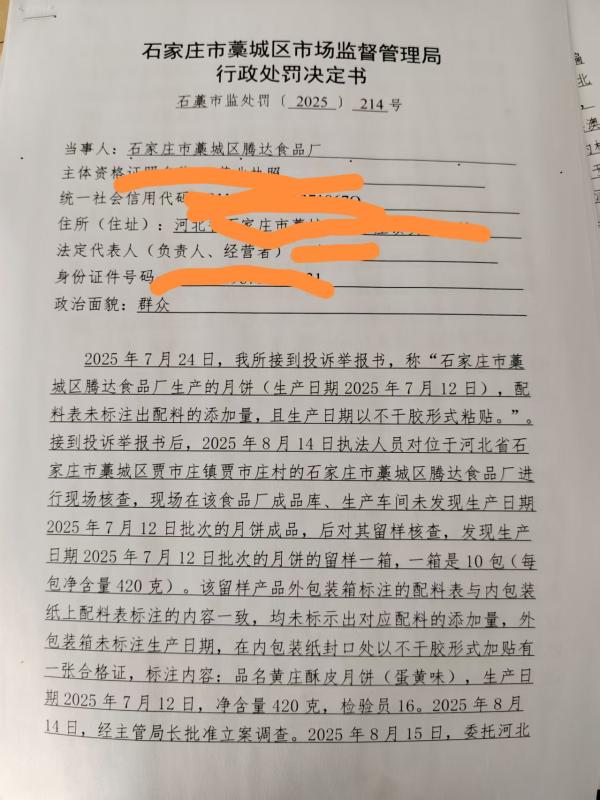 石家庄市藁城区腾达食品厂生产销售标签标注不符合规定的月饼案(石藁市监处罚【2025】214号)