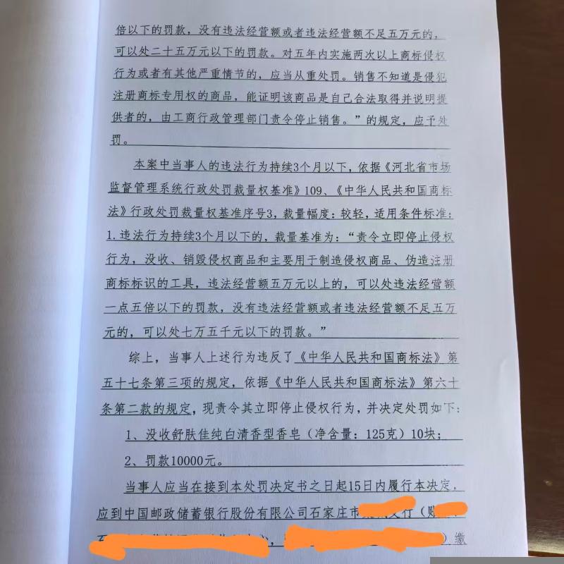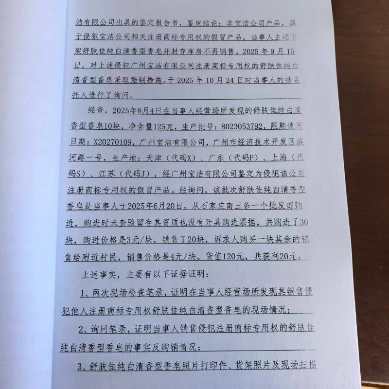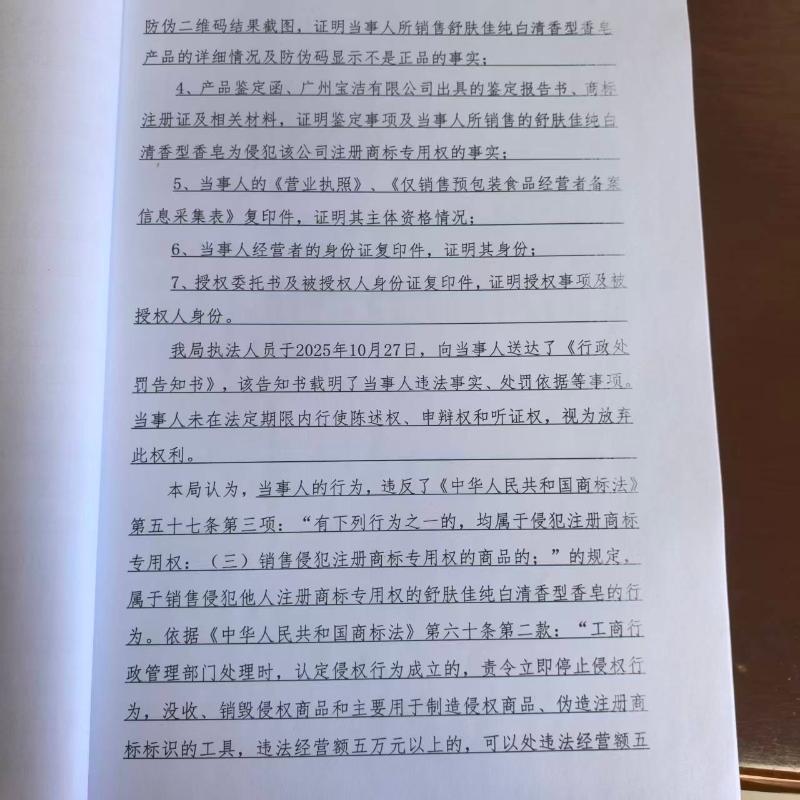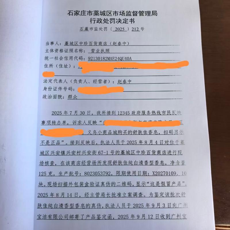 藁城区中珍百货商店(赵春中)销售侵犯他人注册商标专用权的舒肤佳纯白清香型香皂案(石藁市监处罚【2025】212号)