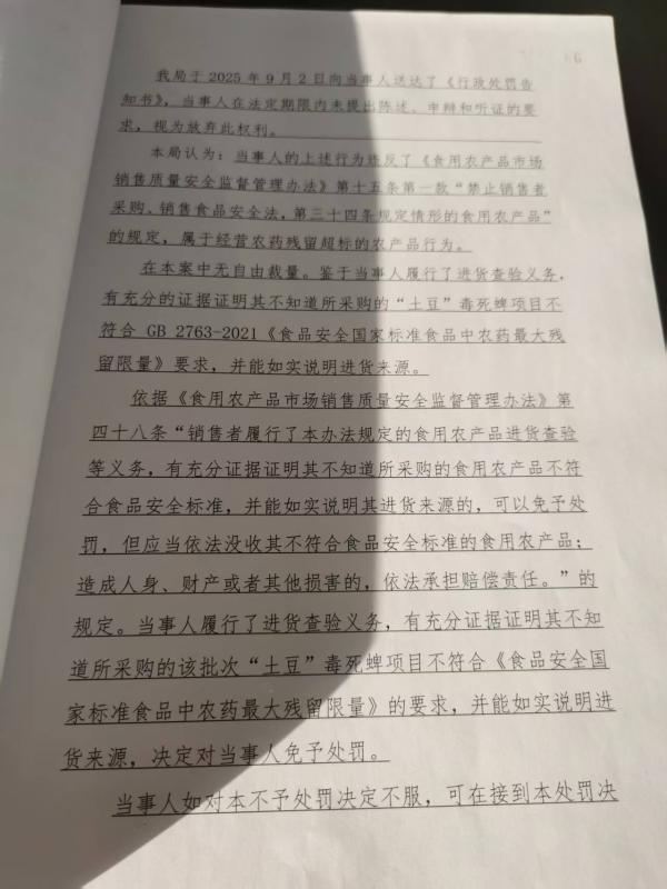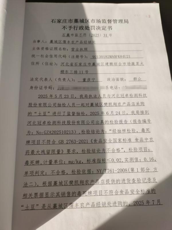 藁城区霈丰农产品经销处(董彦宁)销售毒死蜱项目不符合食品安全标准的“土豆”案