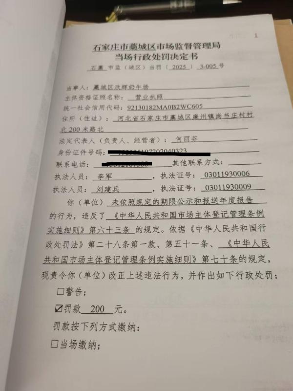 藁城区欣辉奶牛场未按规定公示和报送2024年年度报告案