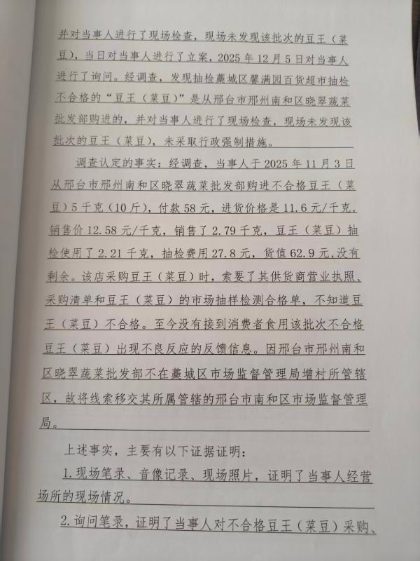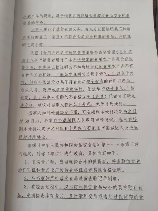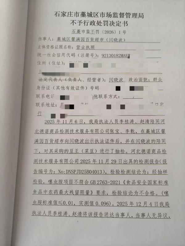 藁城区馨漫园百货超市(闫晓波)涉嫌销售噻虫胺农药残留量超过食品安全标准限量的豆王(菜豆)案