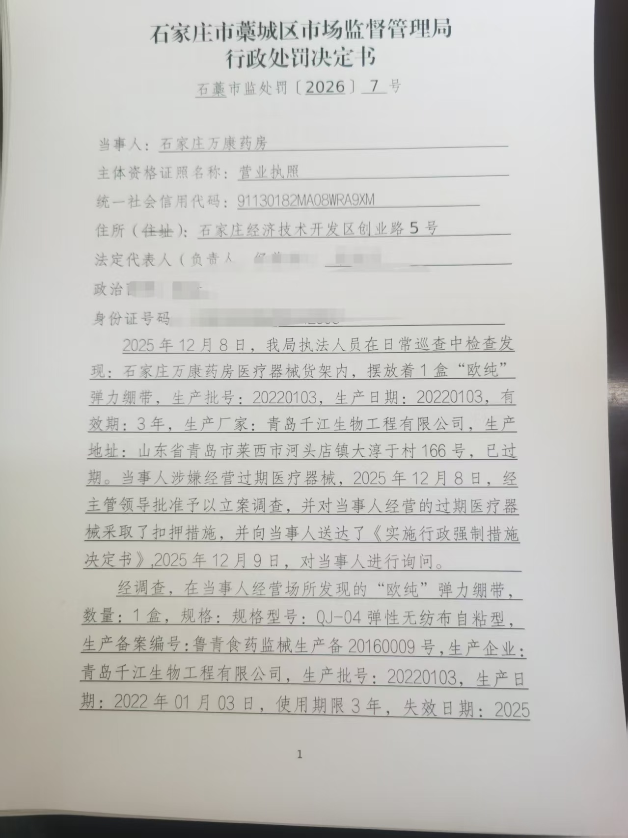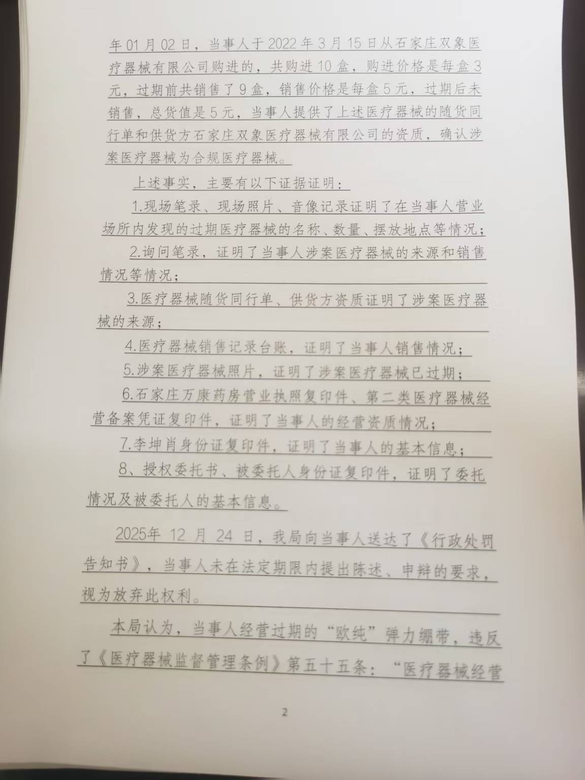 石家庄万康药房经营过期医疗器械案行政处罚决定书