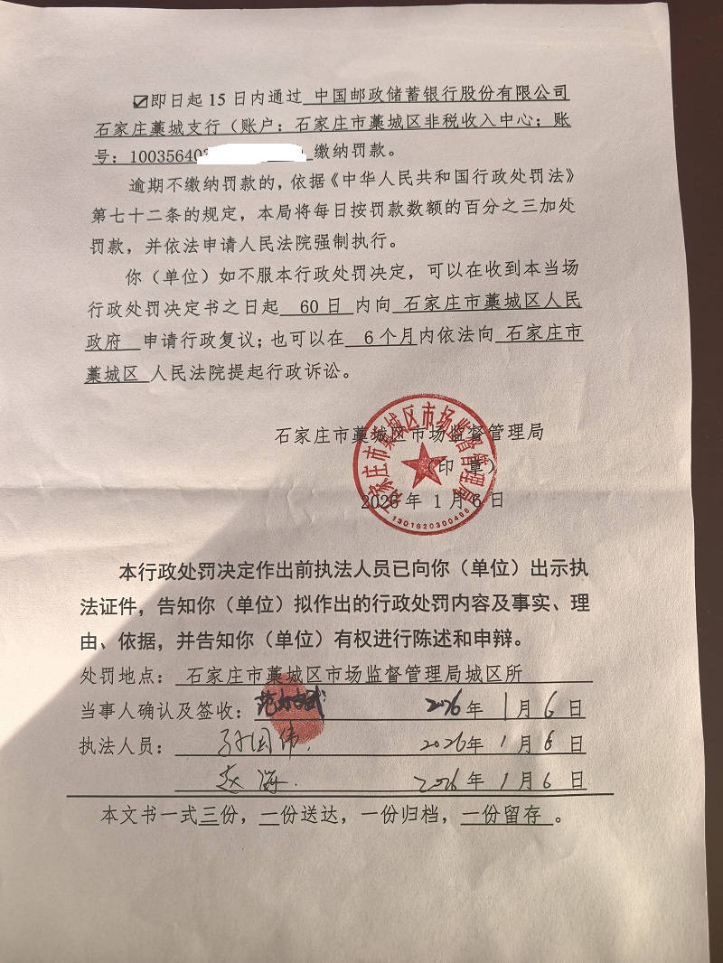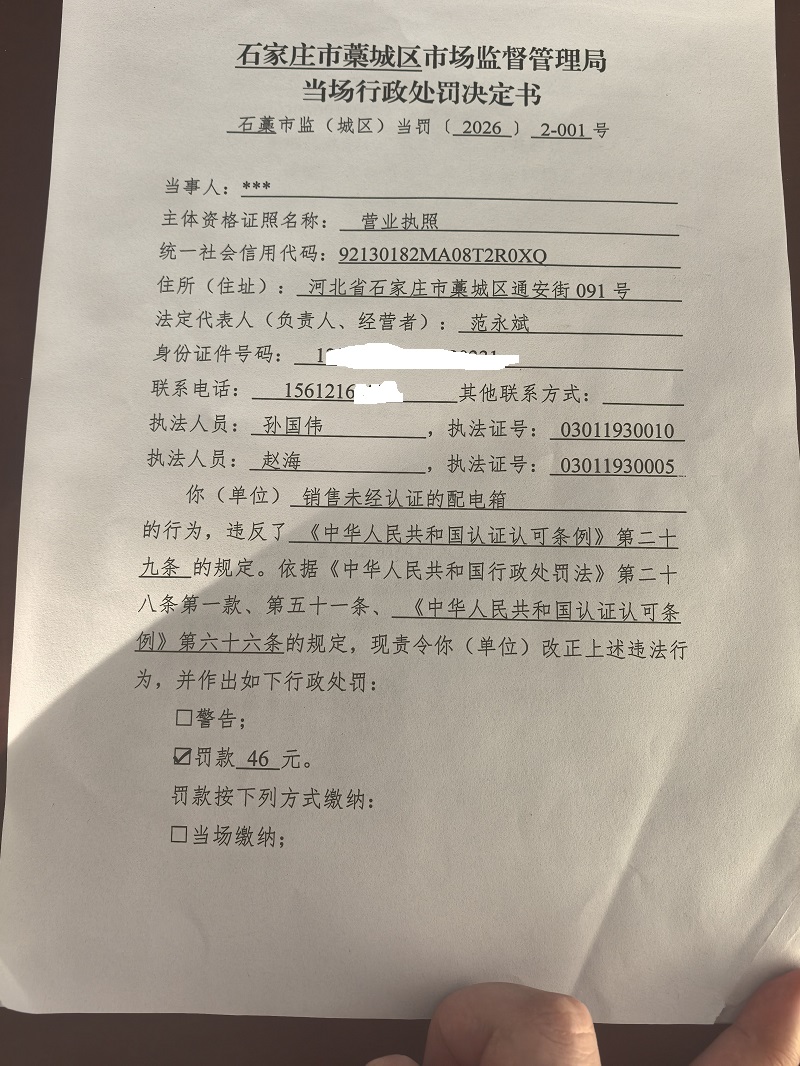 范永斌销售未经认证的配电箱案 石藁市监(城区)当罚〔2026〕2-001号