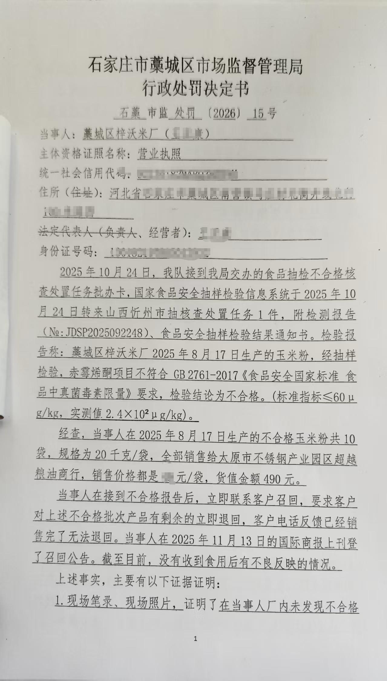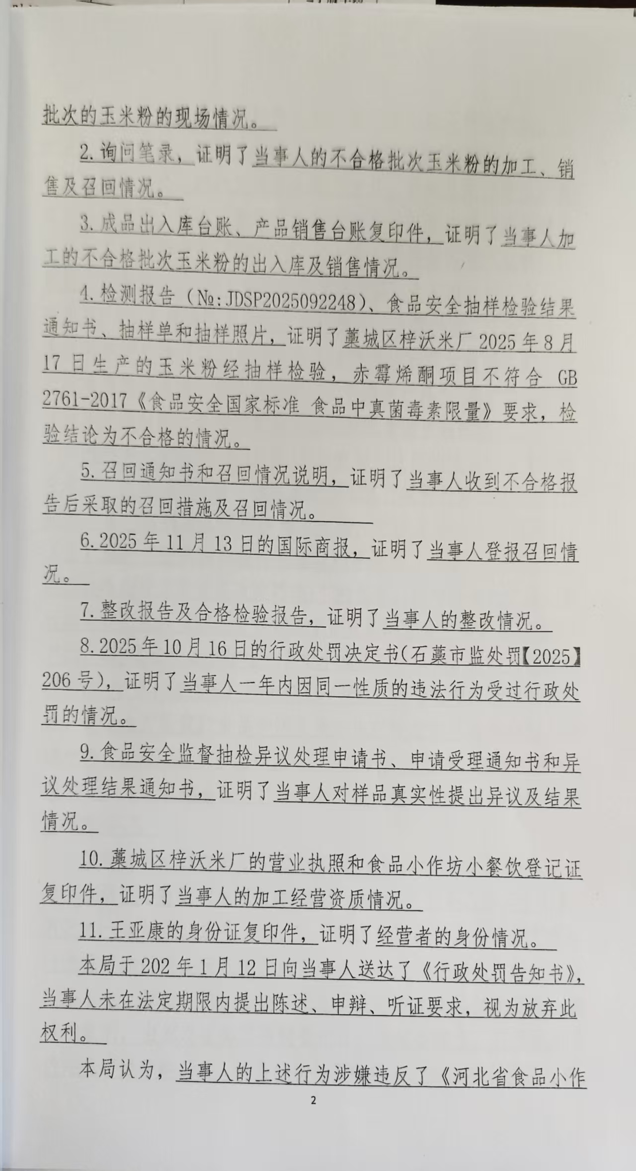 藁城区梓沃米厂(王亚康)加工、销售玉米赤霉烯酮含量超过食品安全标准限量的玉米粉案 石藁市监处罚处罚(2026)15号