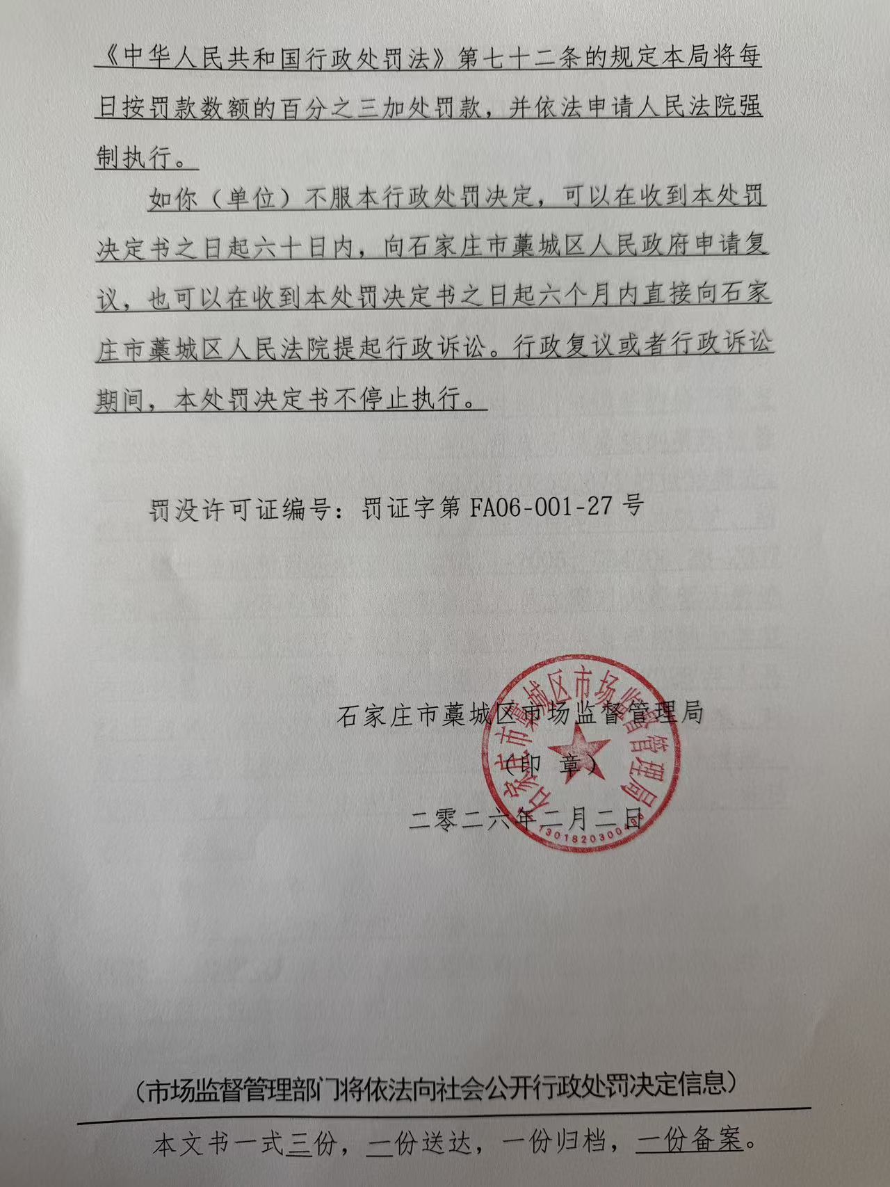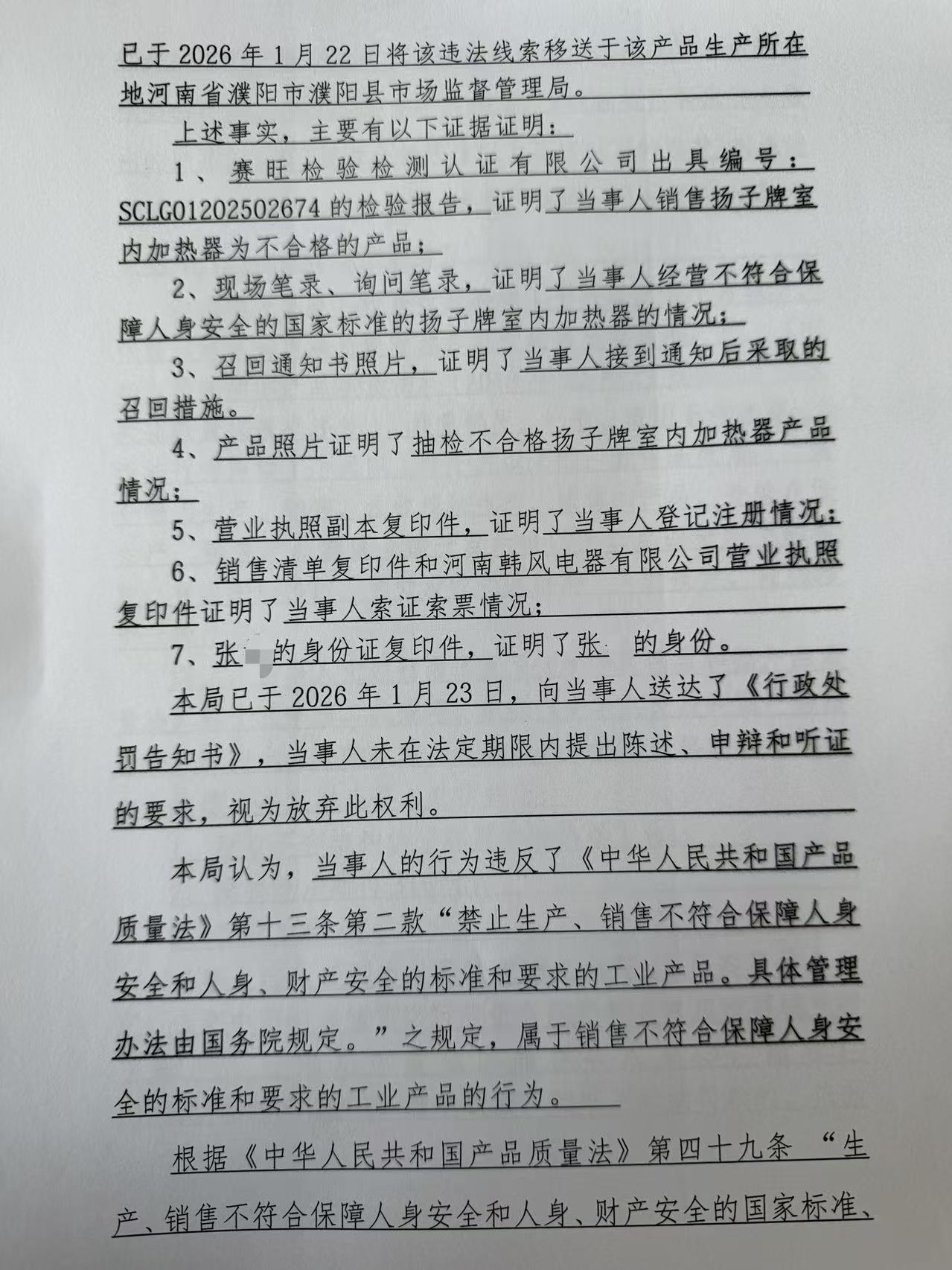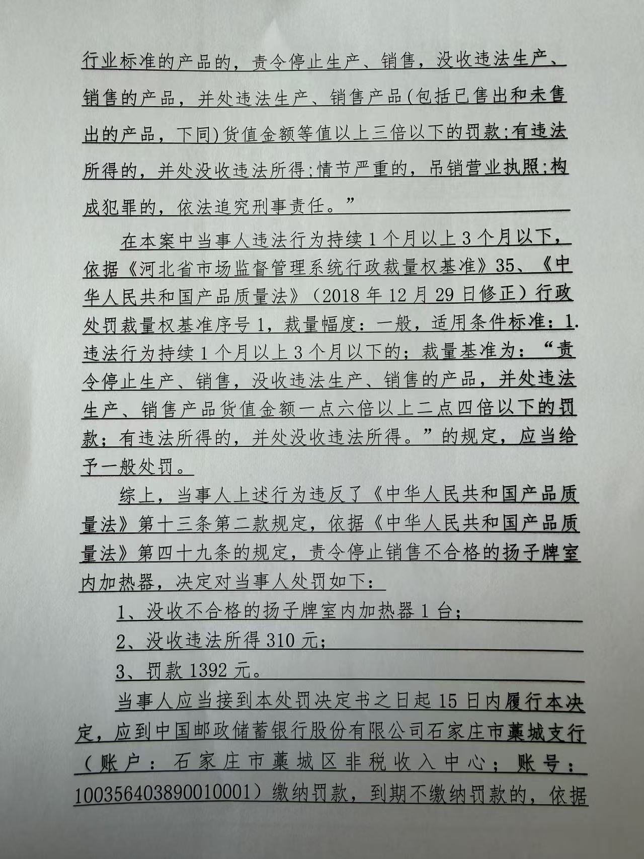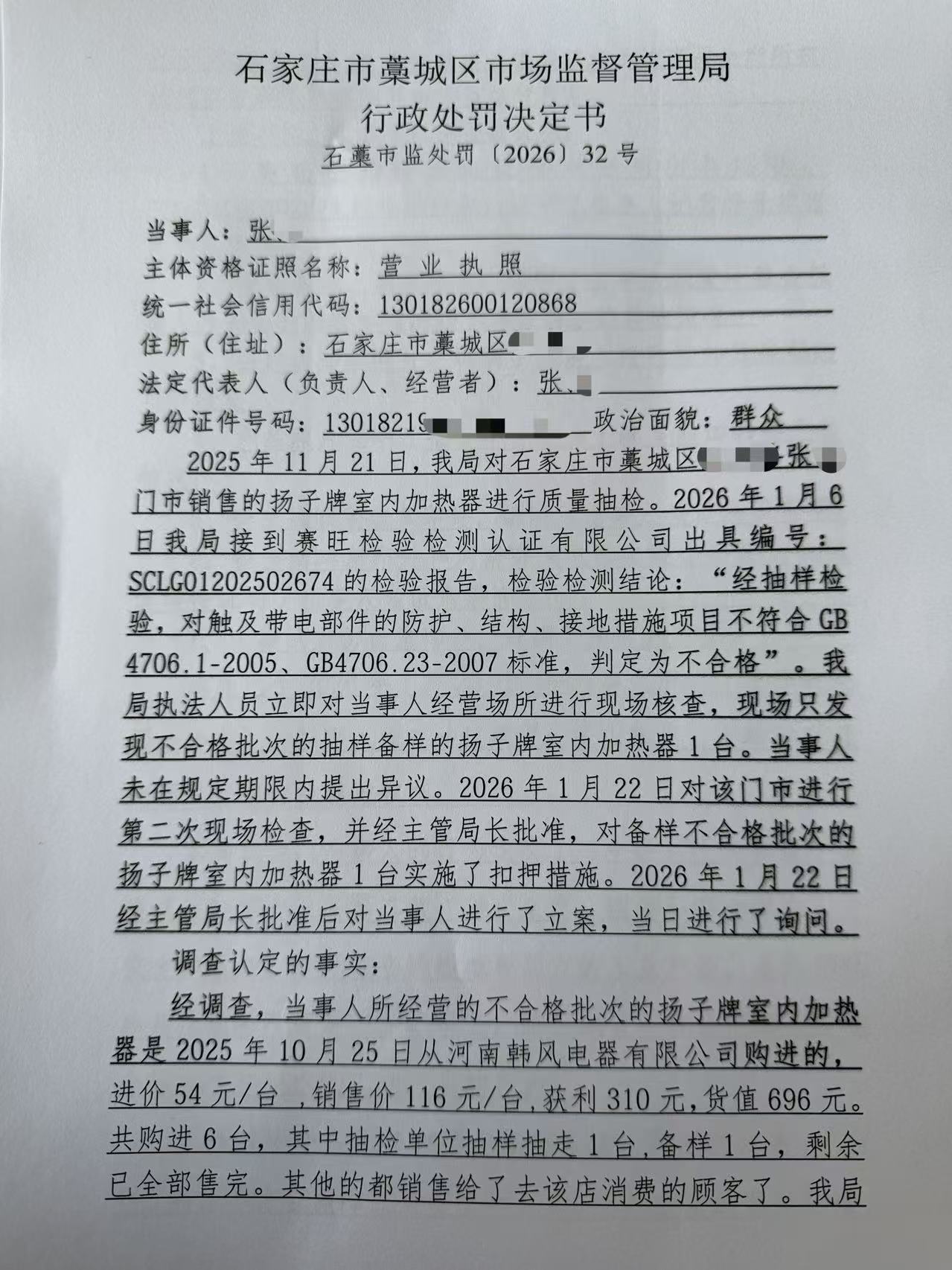 张振销售不符合保障人身安全的国家标准扬子牌室内加热器案 石藁市监处罚〔2026〕32号