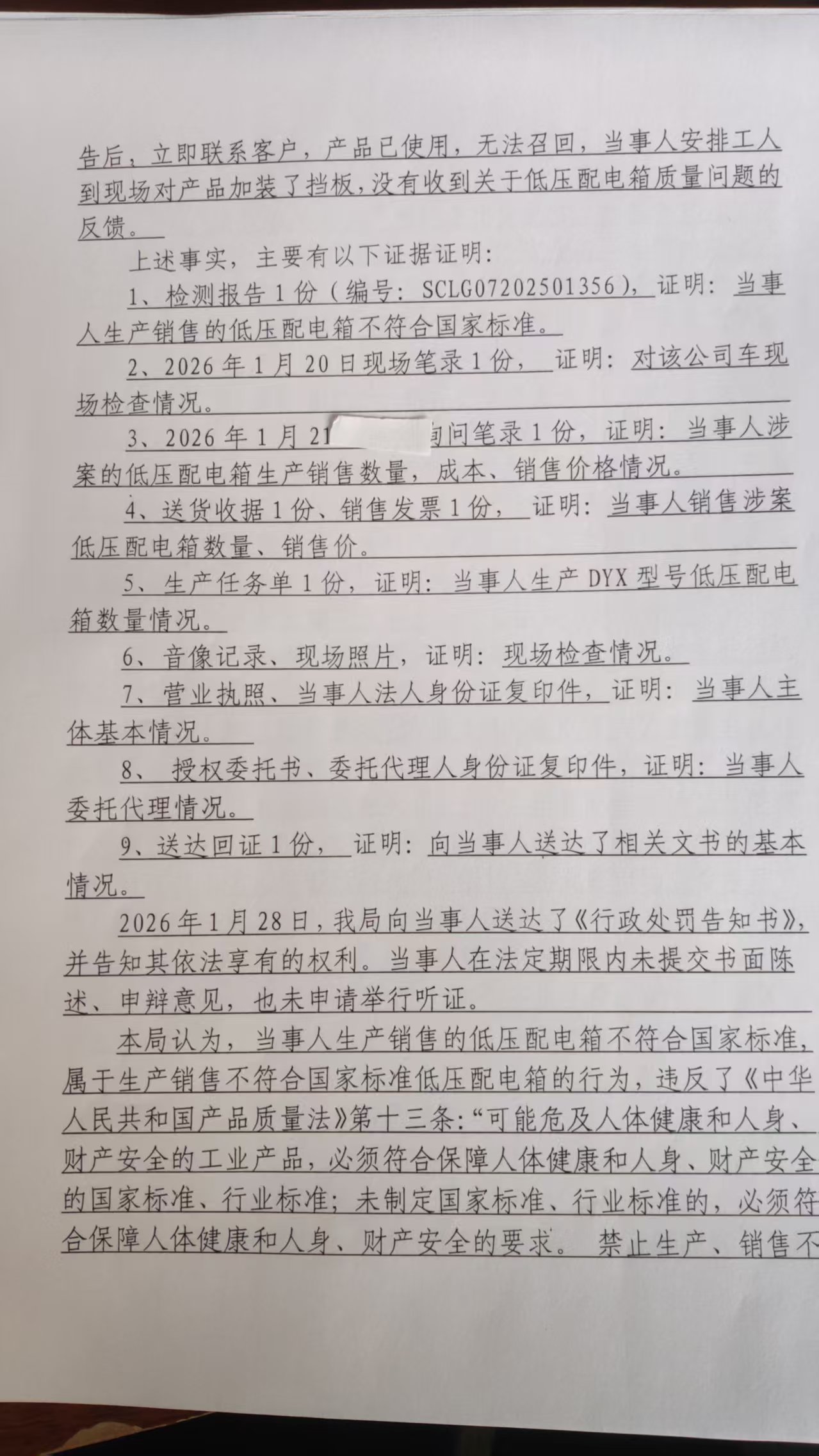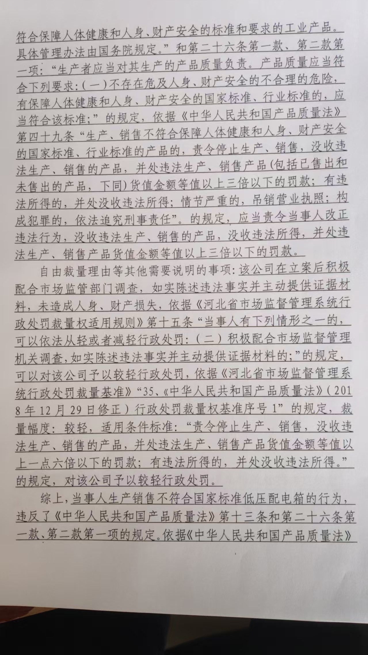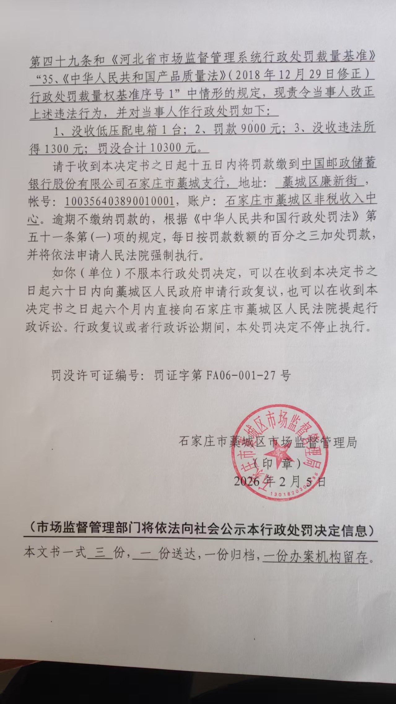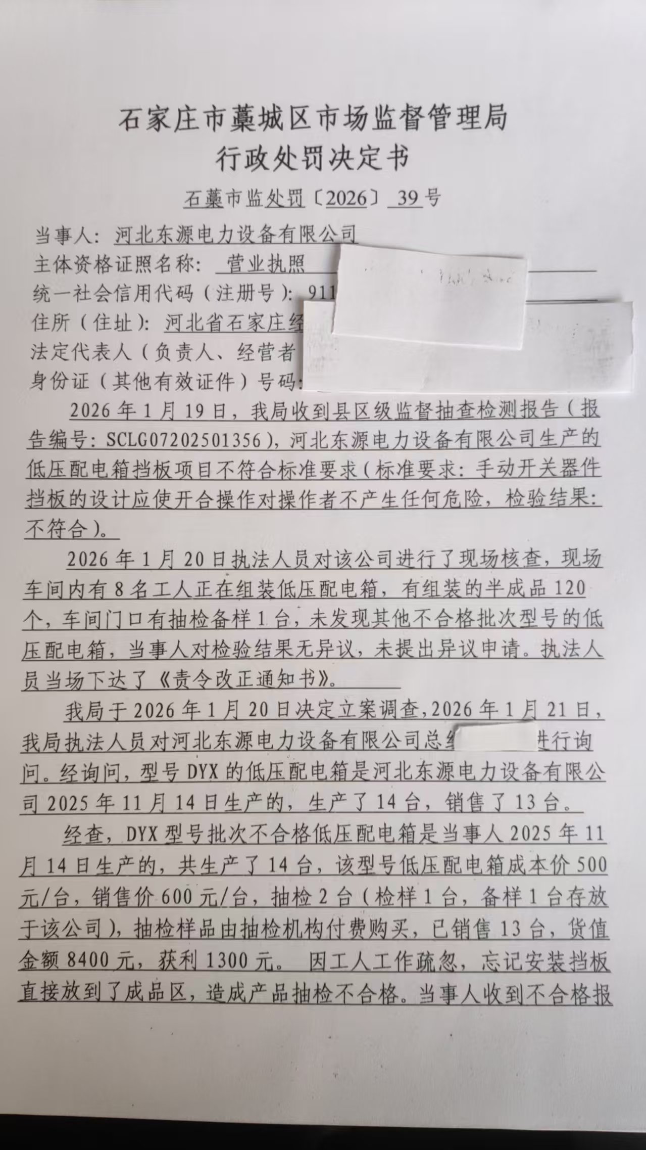河北东源电力设备有限公司生产销售不符合国家标准低压配电箱案 石藁市监处罚〔2026〕39号
