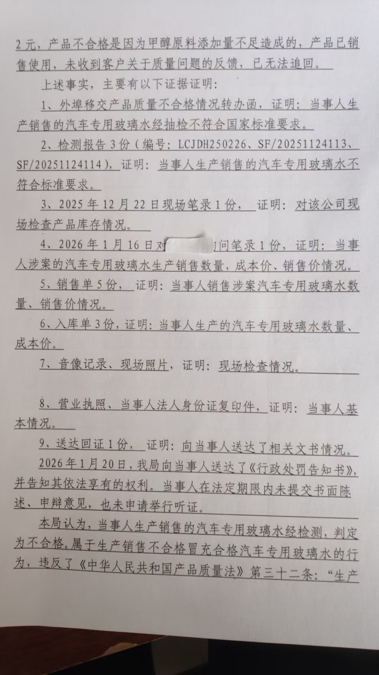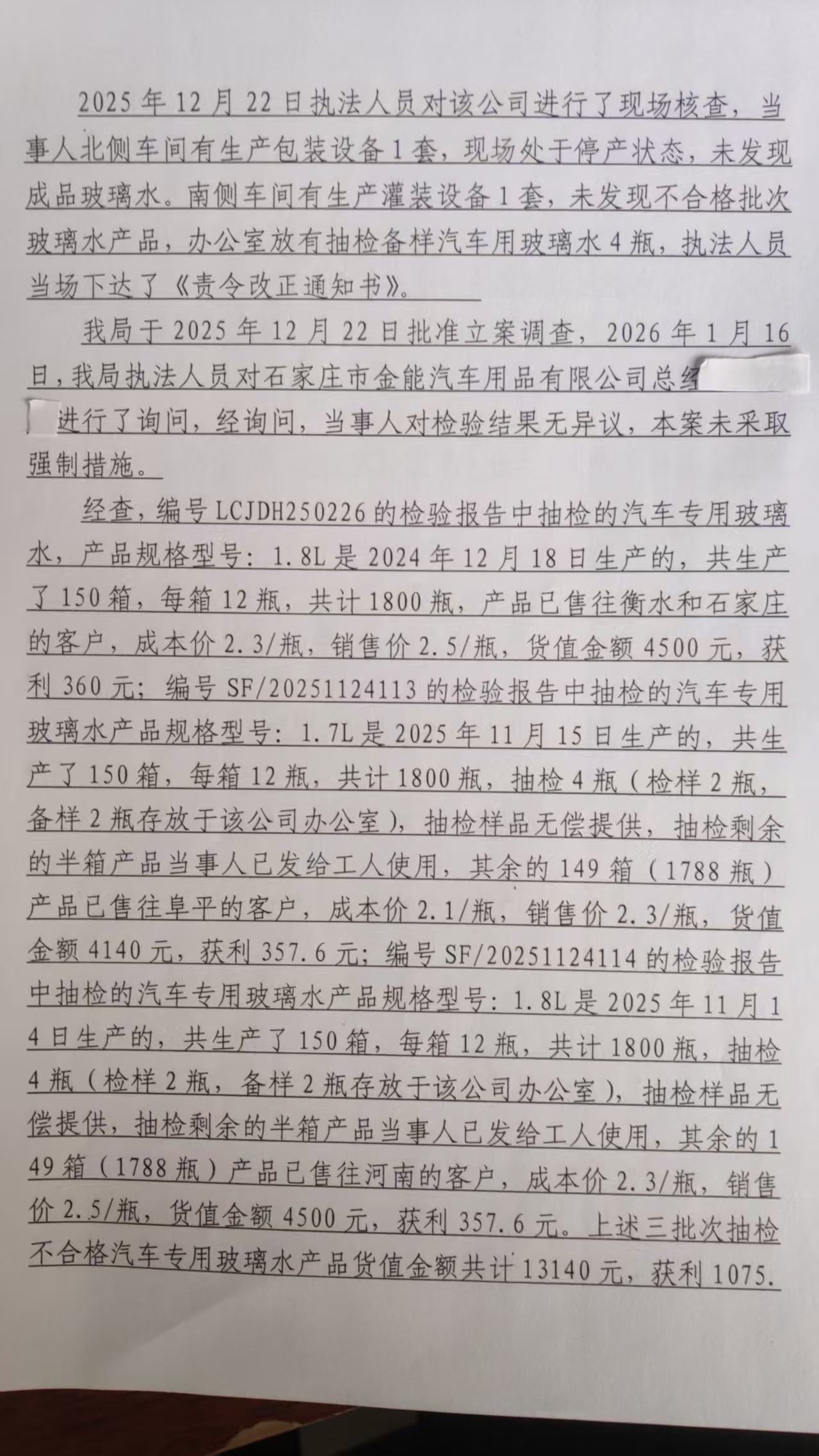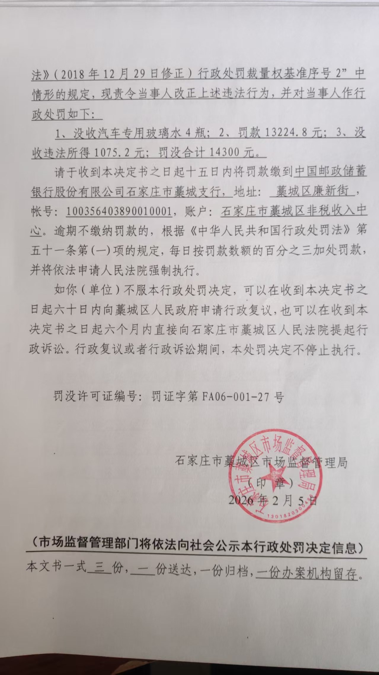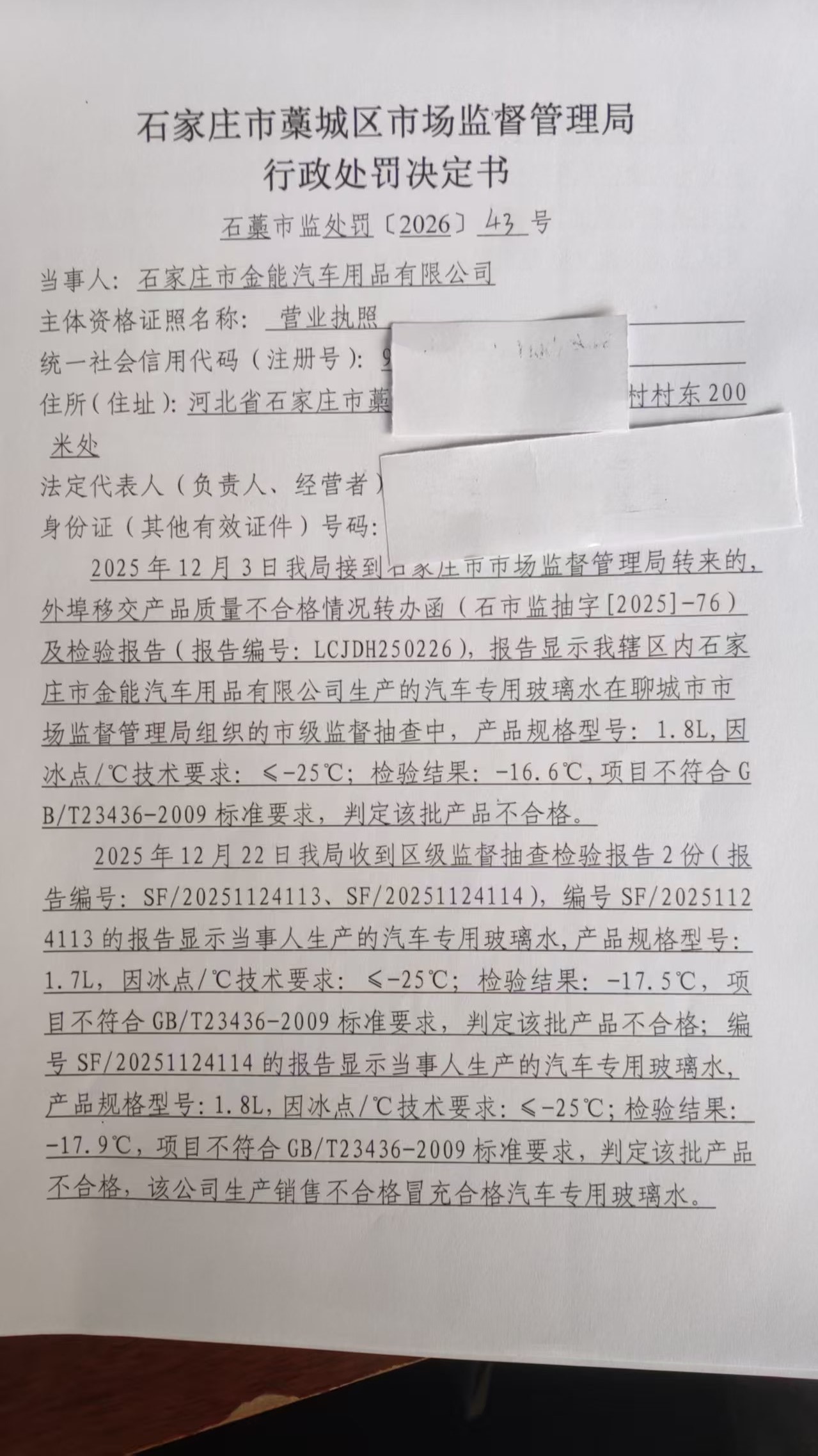 石家庄市金能汽车用品有限公司生产销售不合格冒充合格汽车专用玻璃水案 石藁市监处罚〔2026〕43号