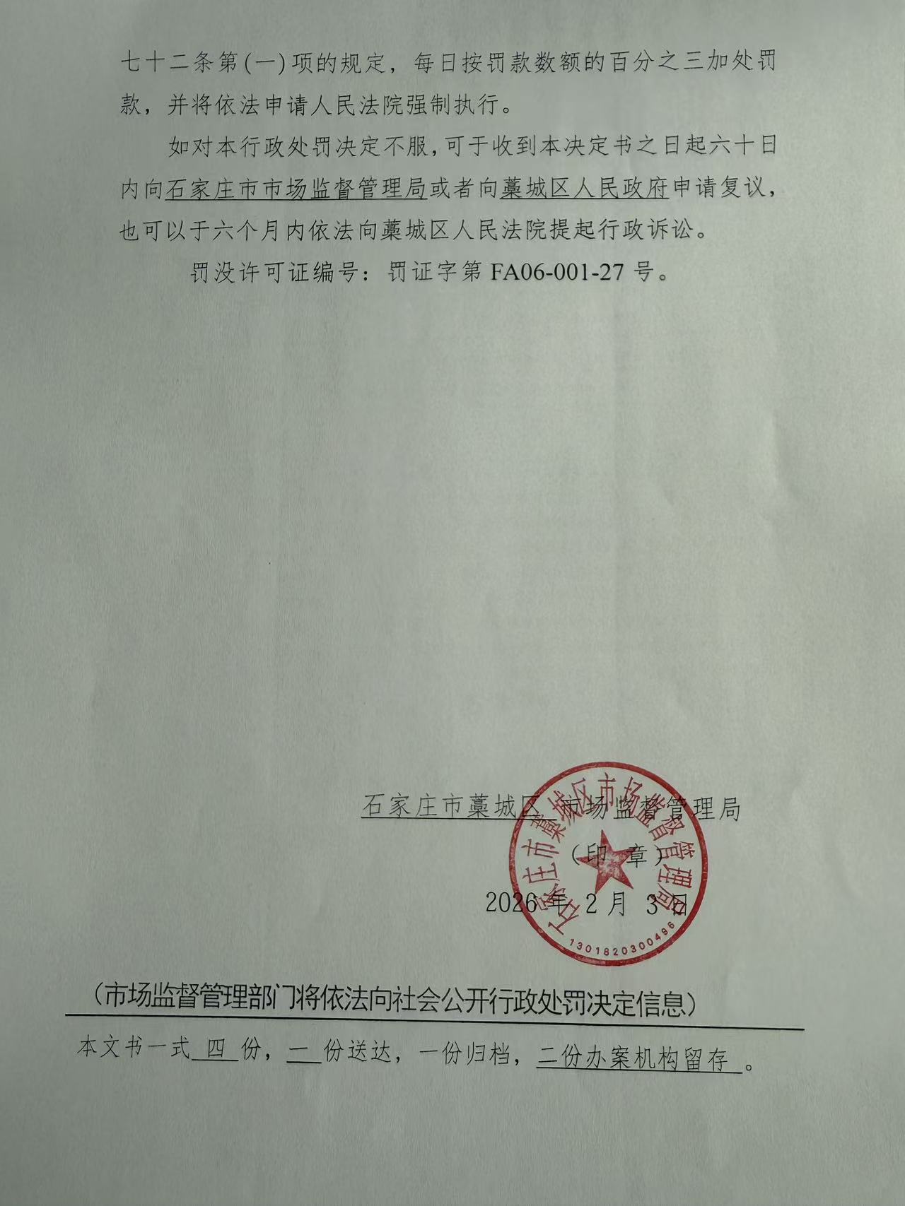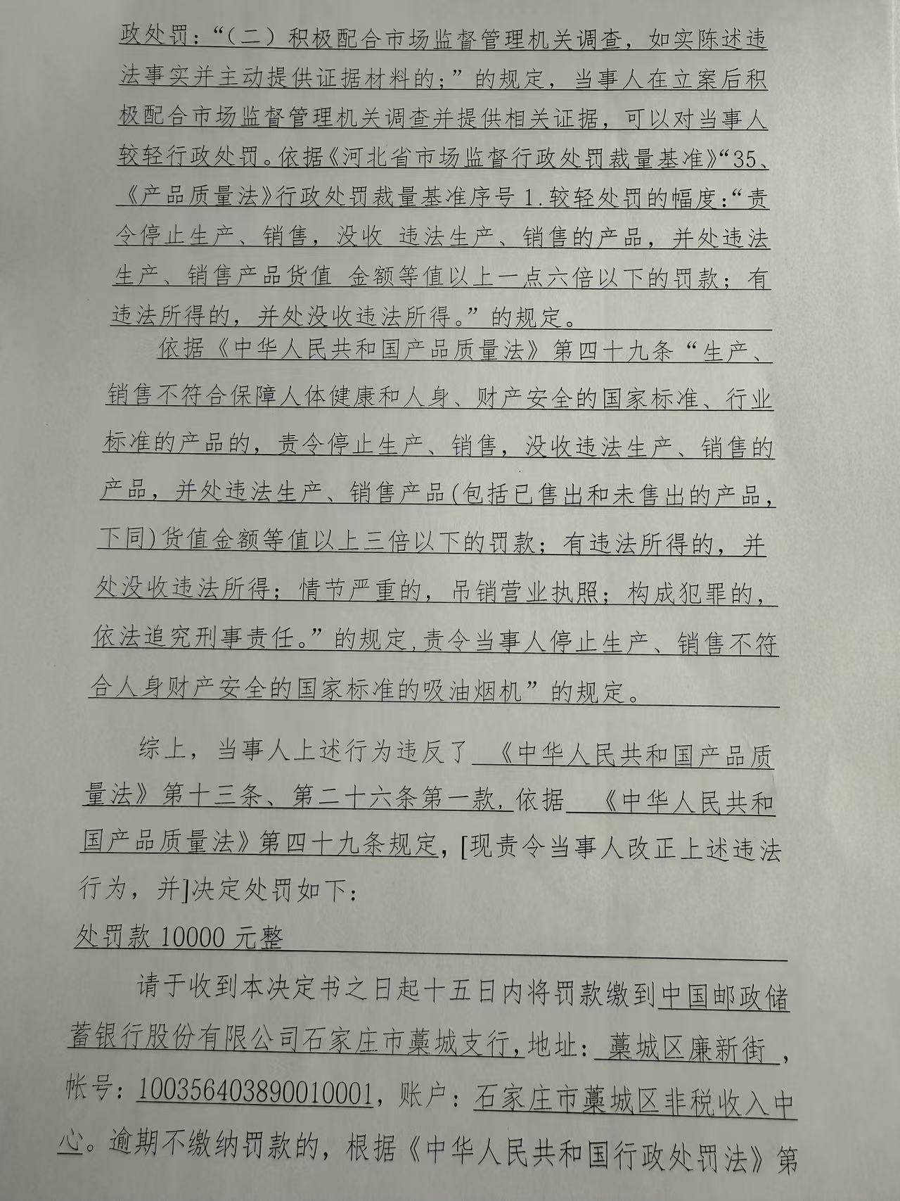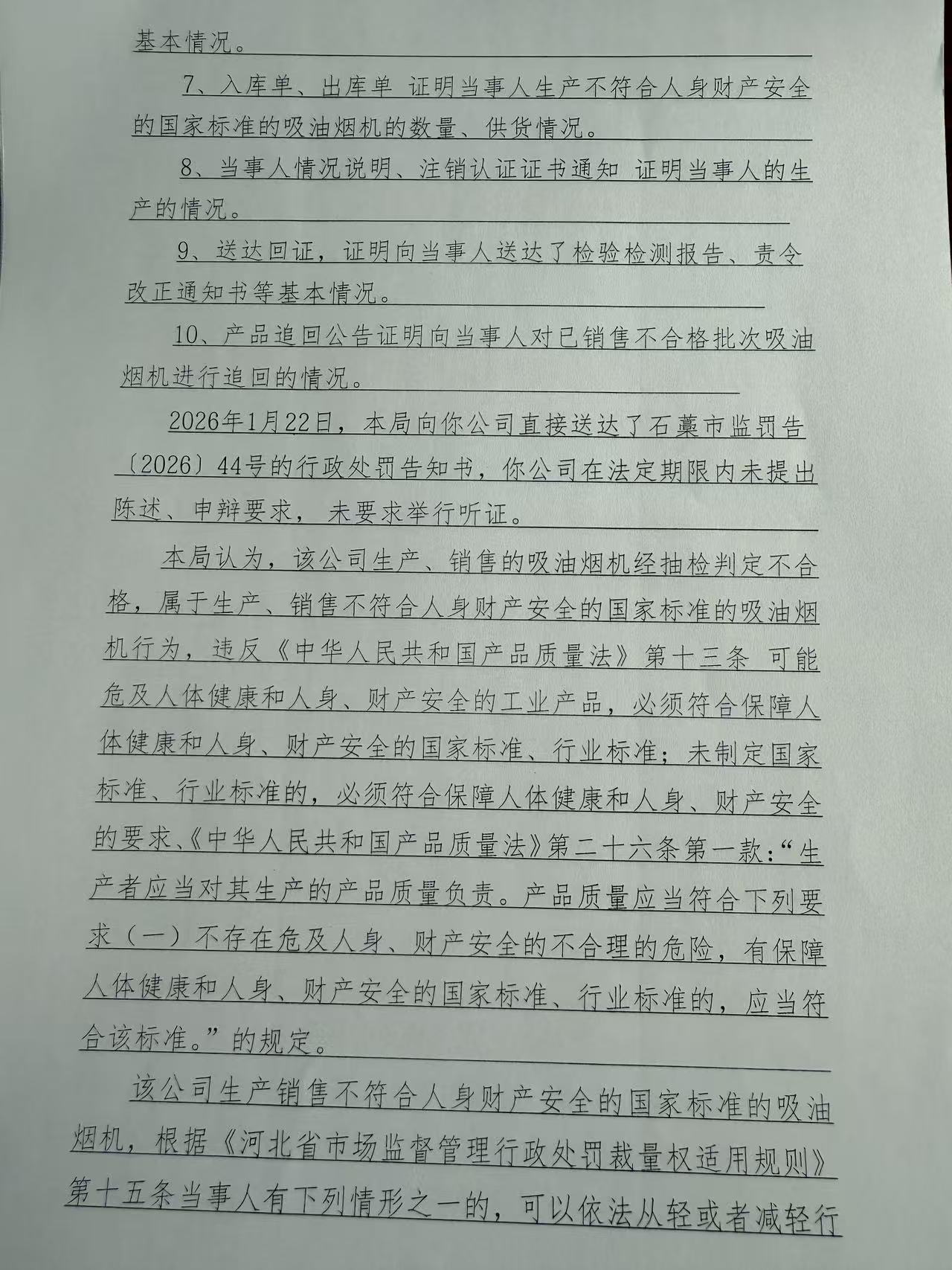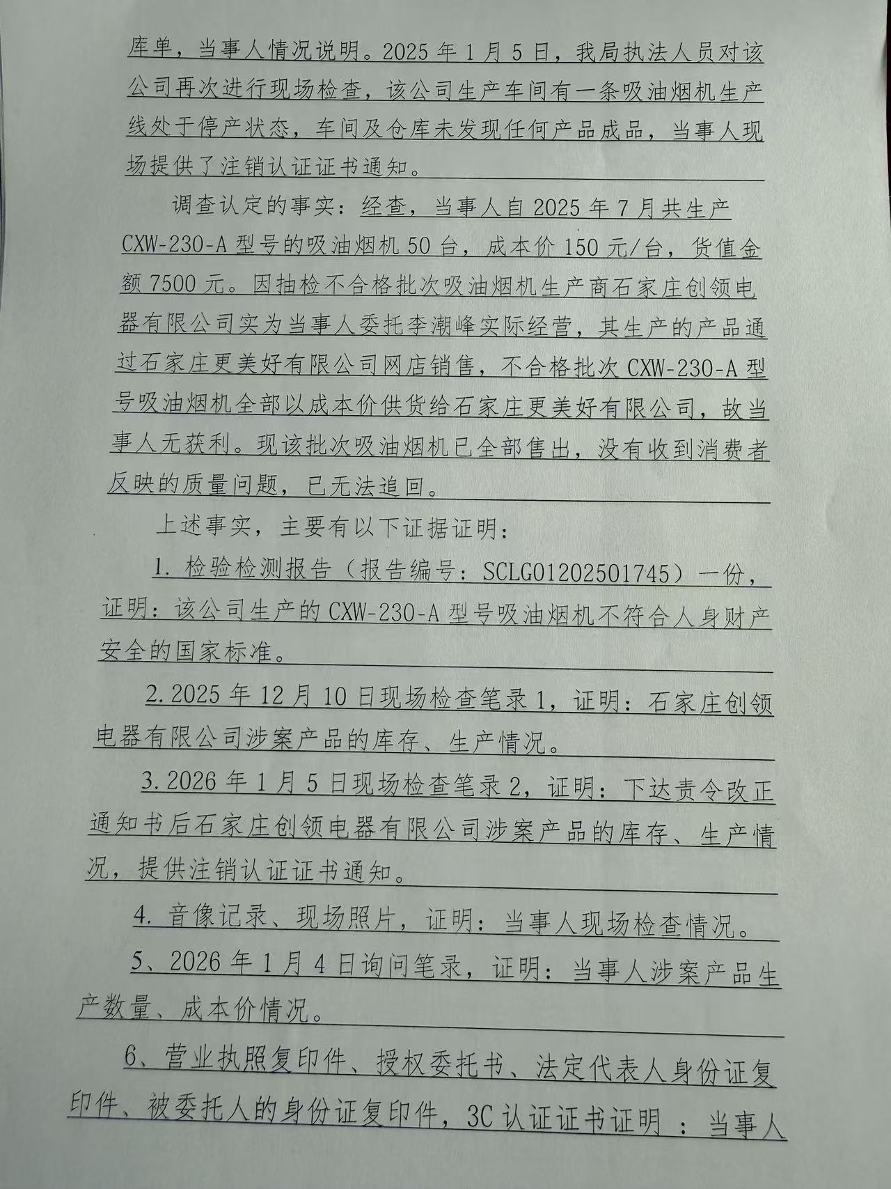 石家庄创领电器有限公司生产、销售不符合人身财产安全的国家标准的吸油烟机案 石藁市监处罚[2026] 44号