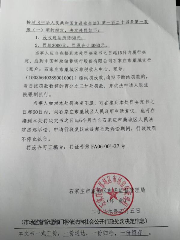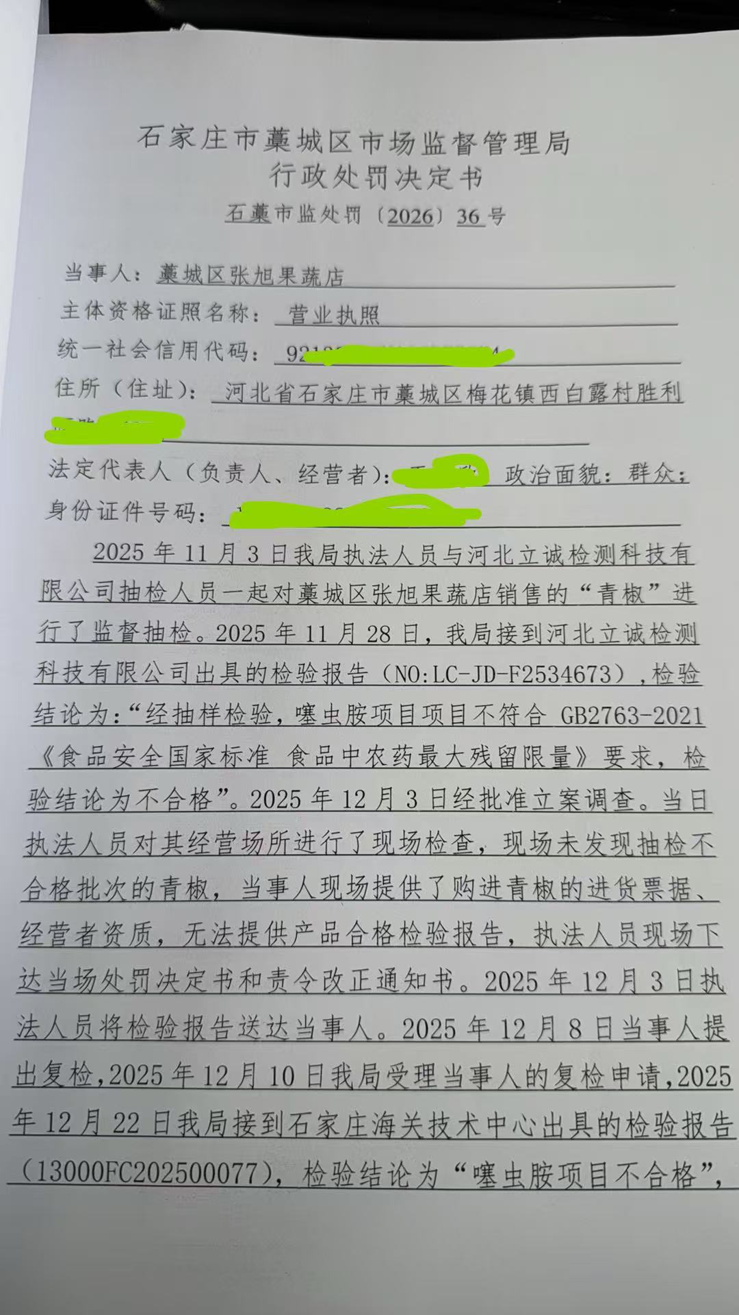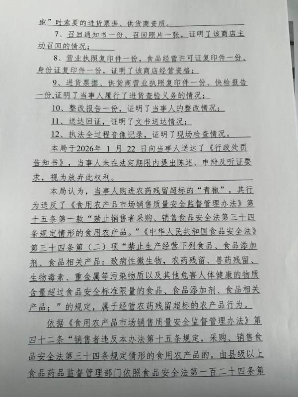 藁城区张旭果蔬店(王欣欣)销售农药残留超标的“青椒”案 石藁市监处罚〔2026〕36号