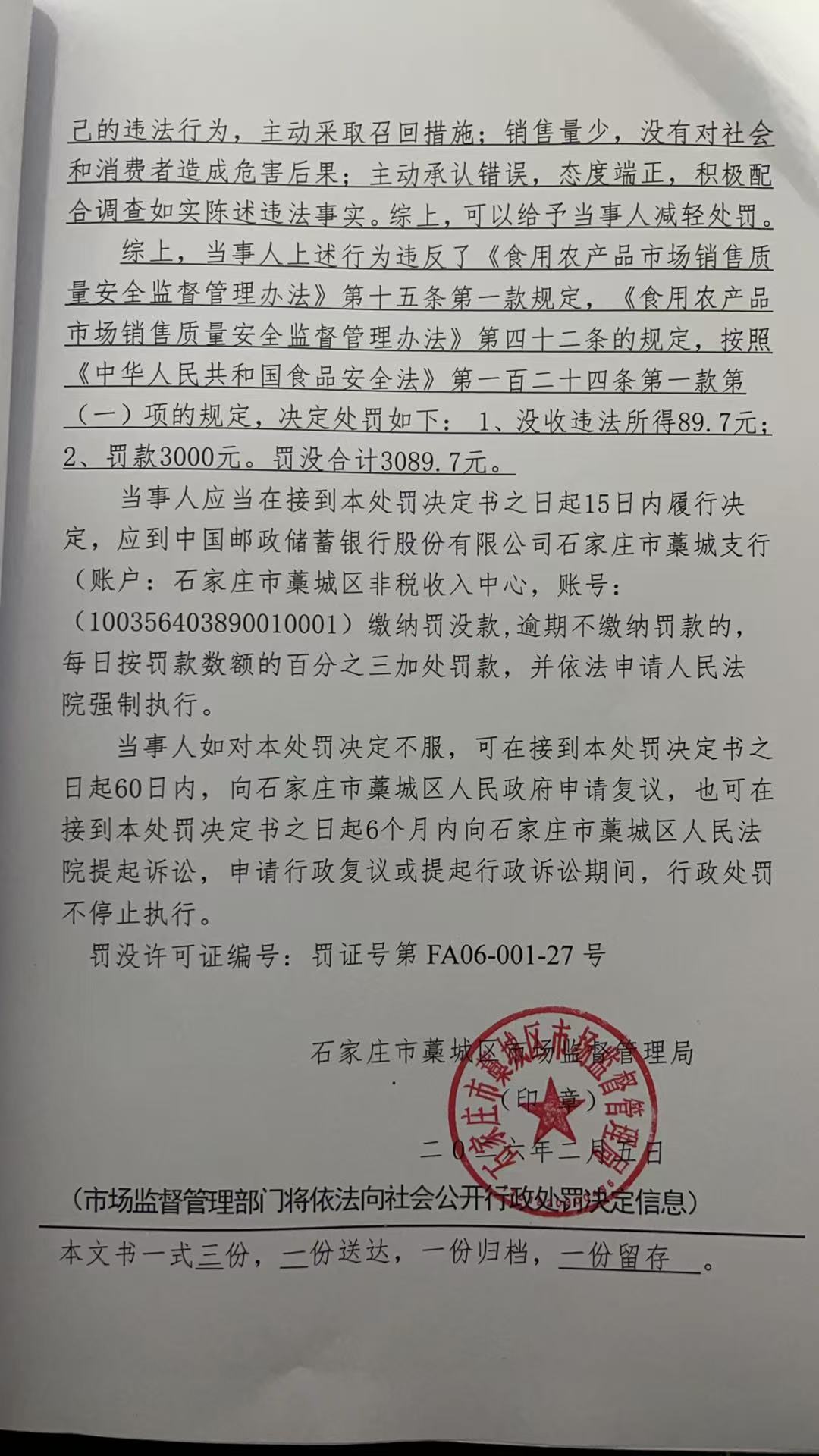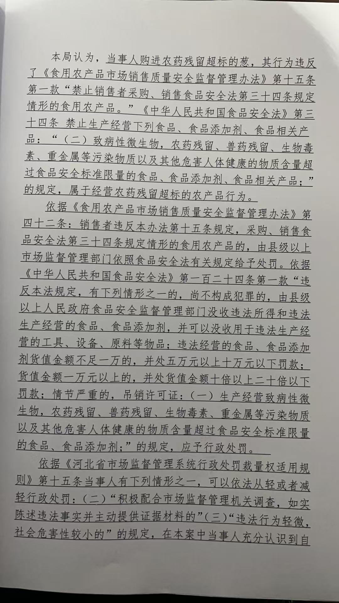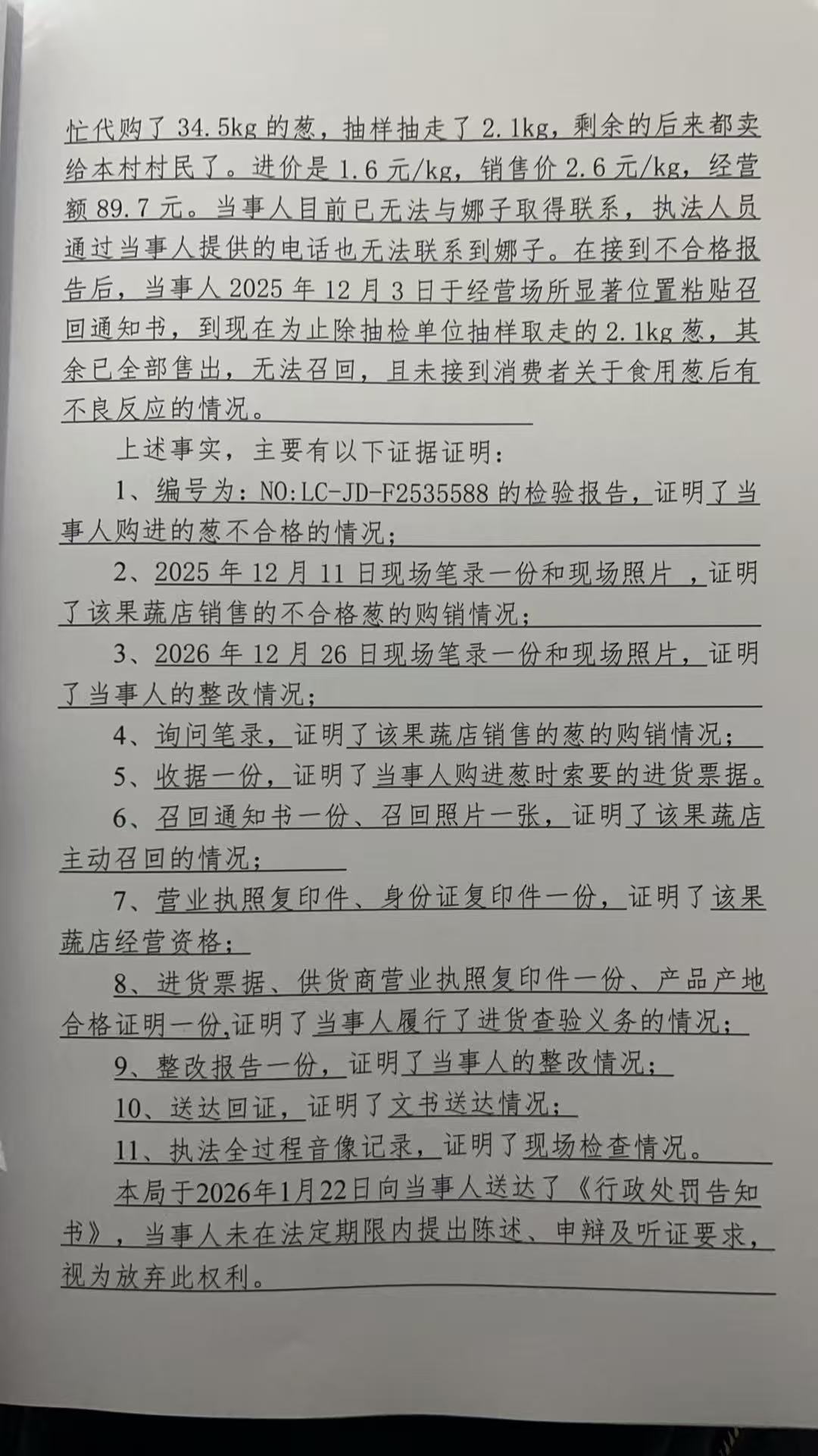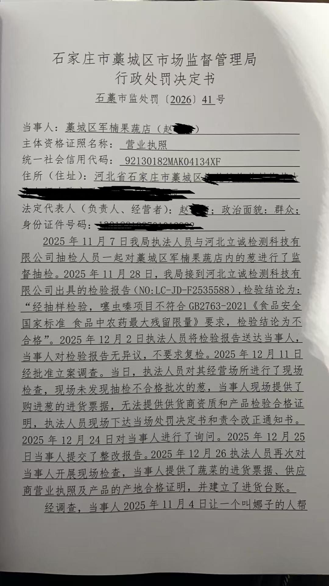 藁城区军楠果蔬店(赵军南)涉嫌销售农药残留超标的“葱”案 石藁市监处罚〔2026〕41号