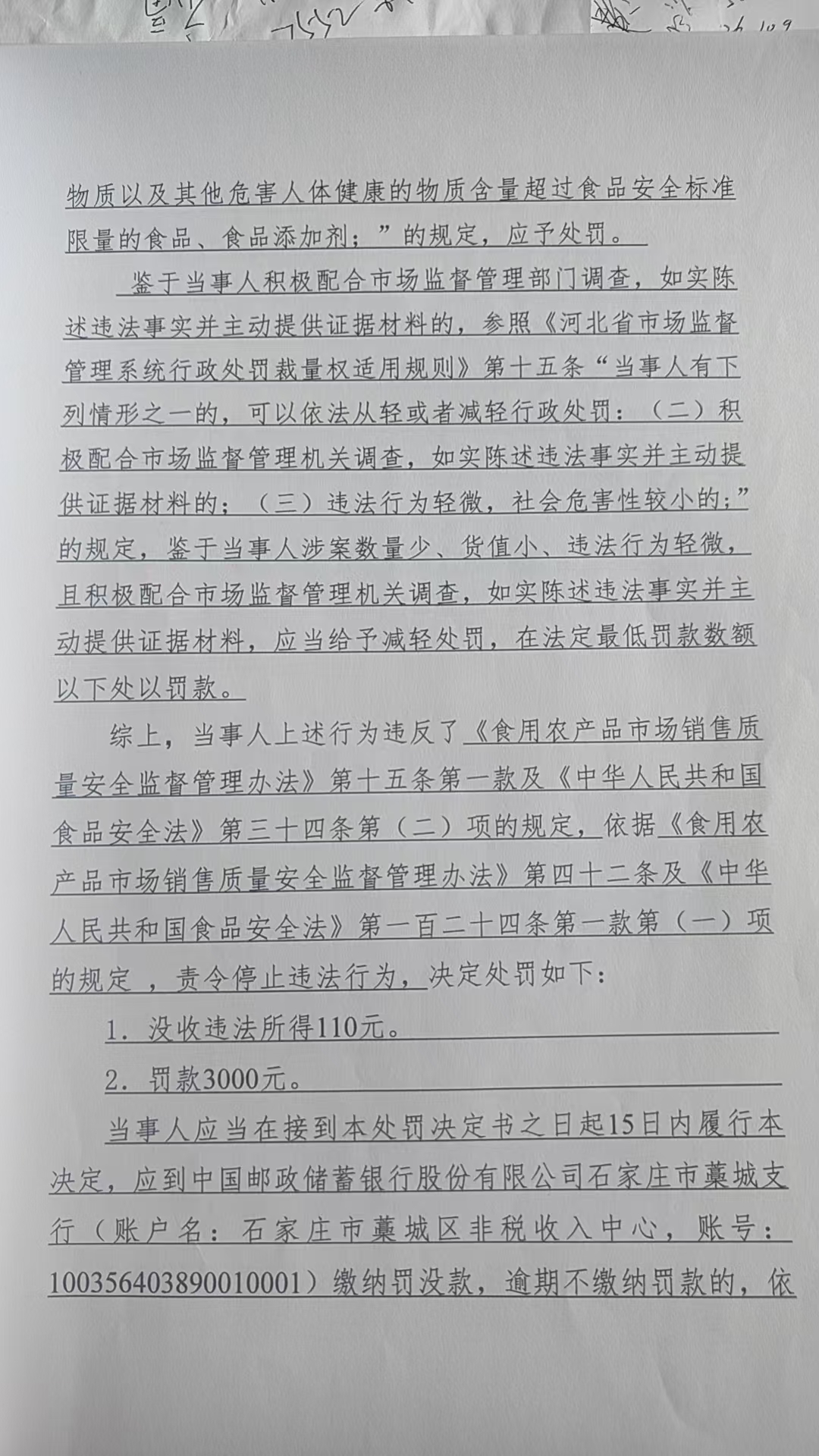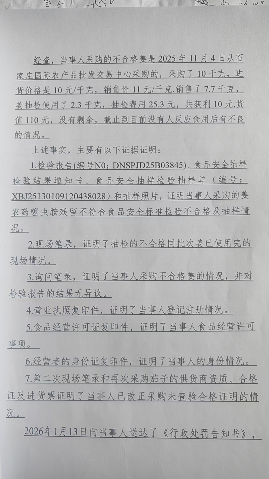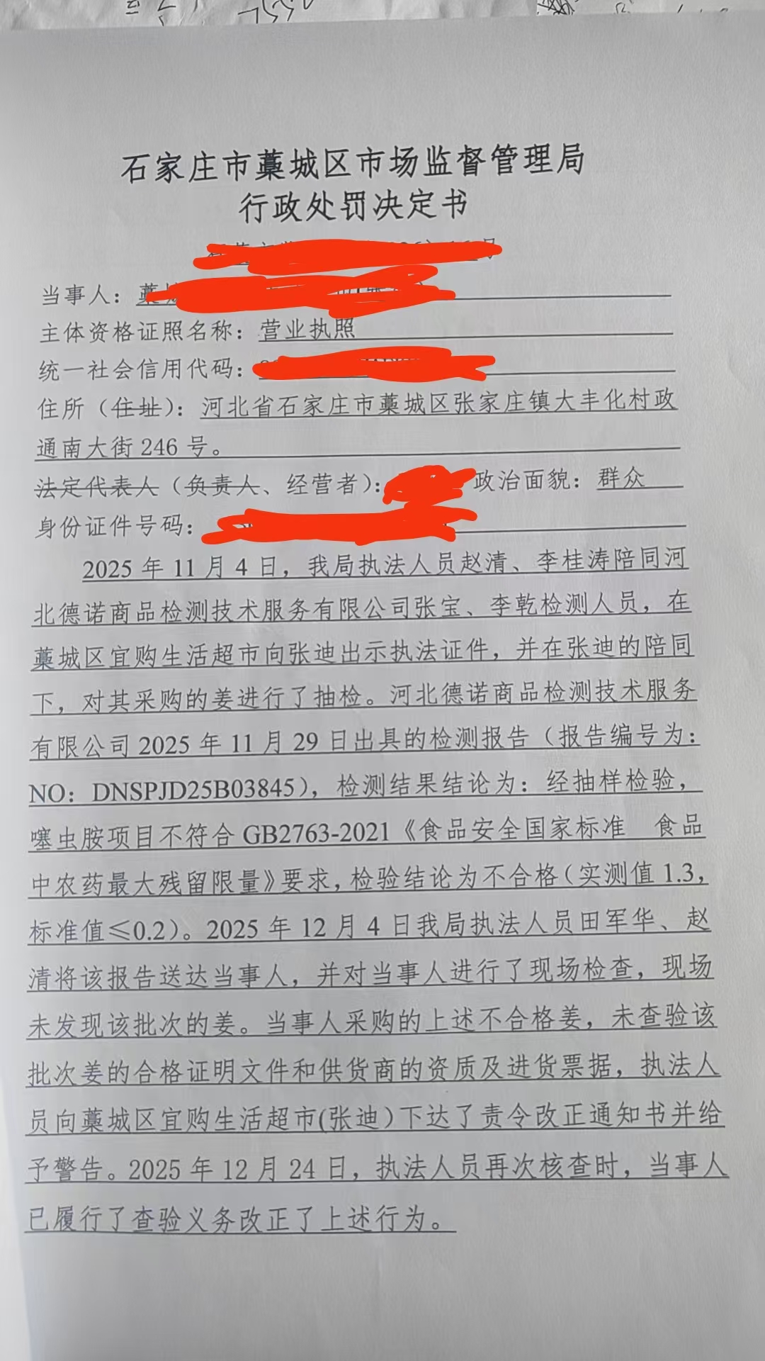 藁城区宜购生活超市销售噻虫胺农药残留量超过食品安全标准限量的姜案