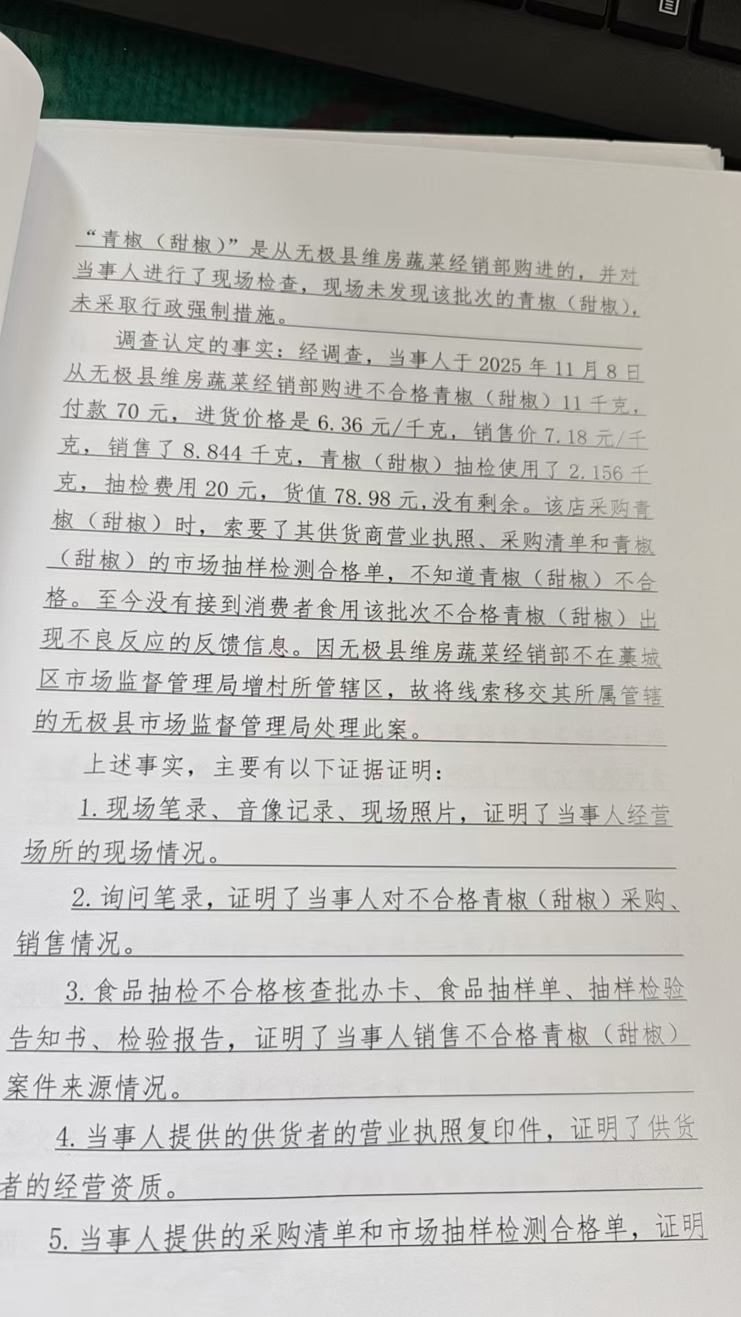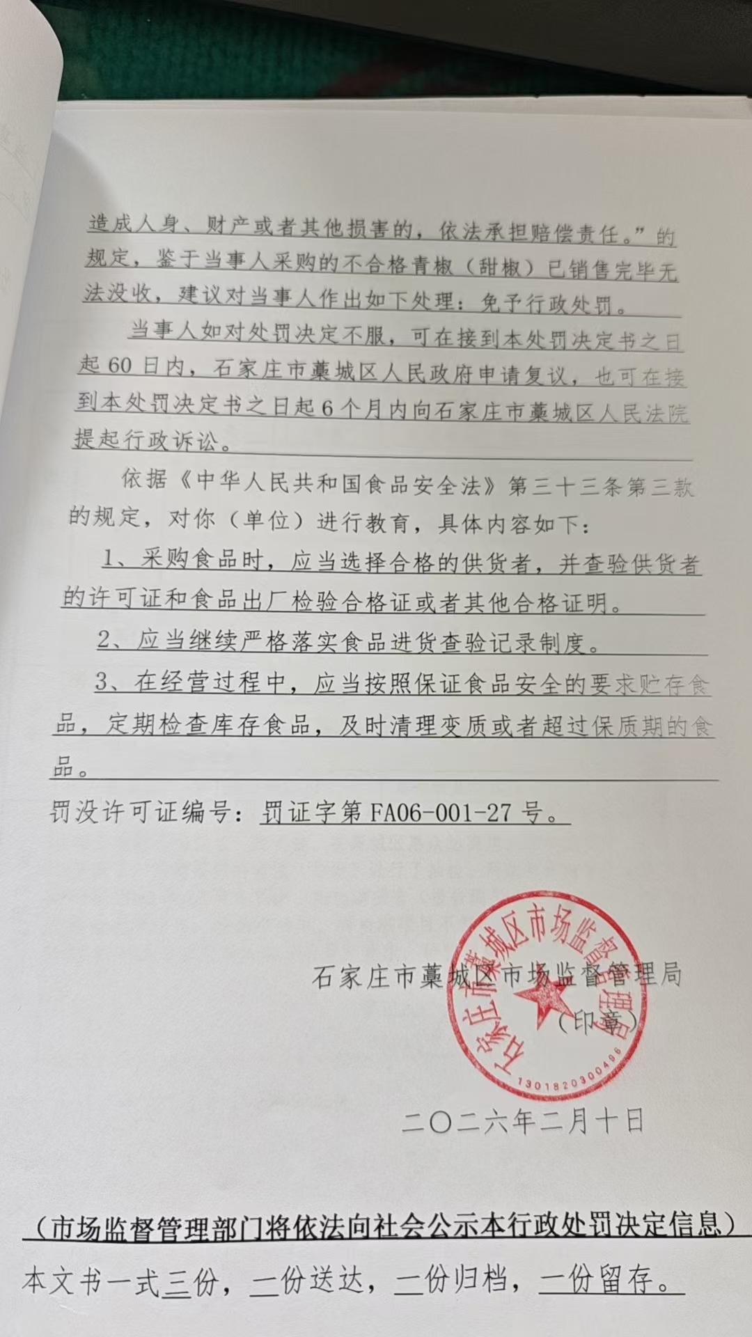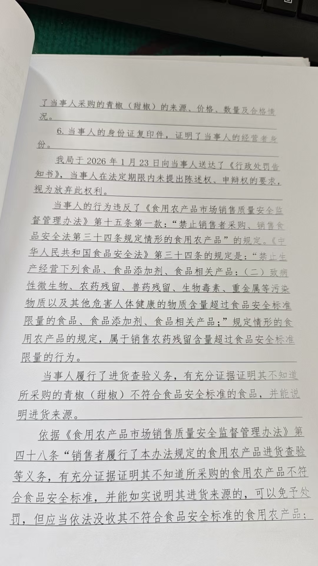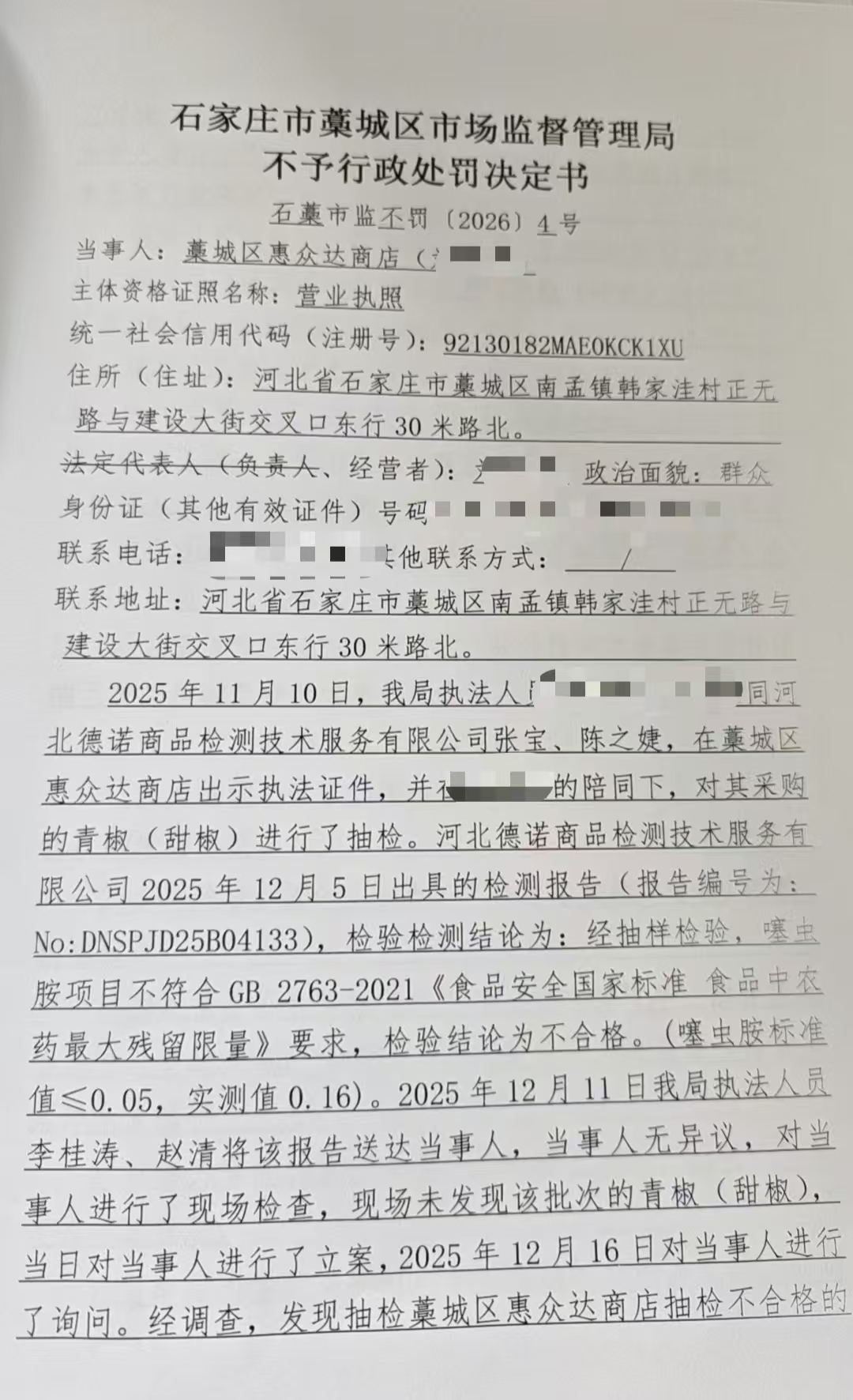 藁城区惠众达商店(刘月金)销售噻虫胺农药残留量超过食品安全标准限量的青椒(甜椒)案