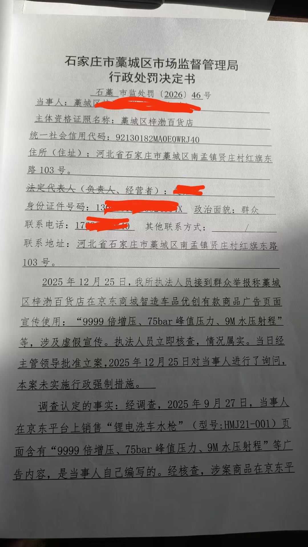 藁城区梓渤百货店(赵红连)涉嫌在京东平台发布虚假广告案