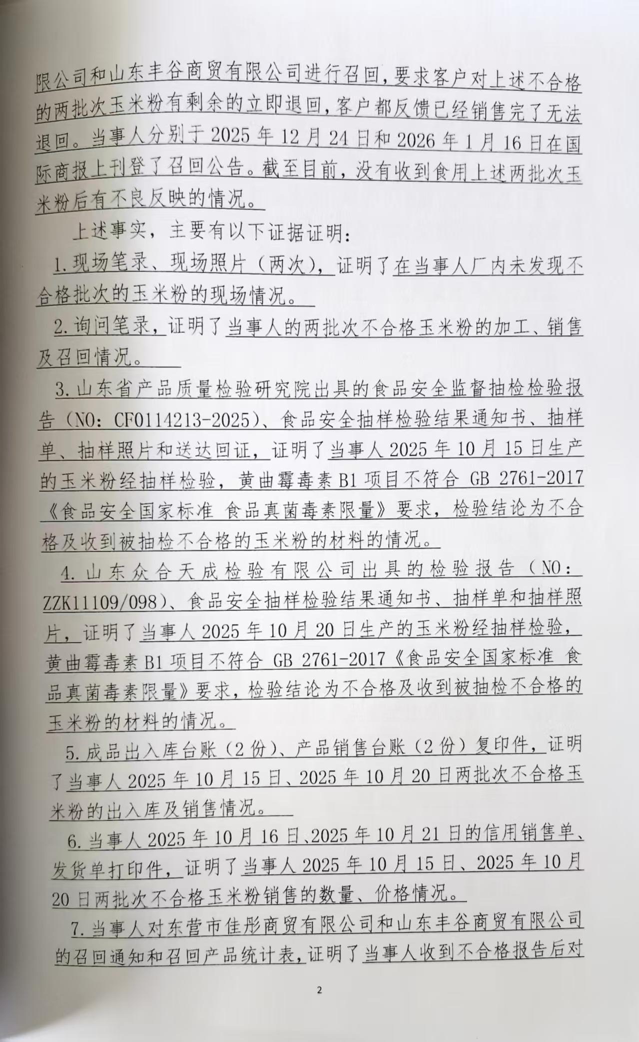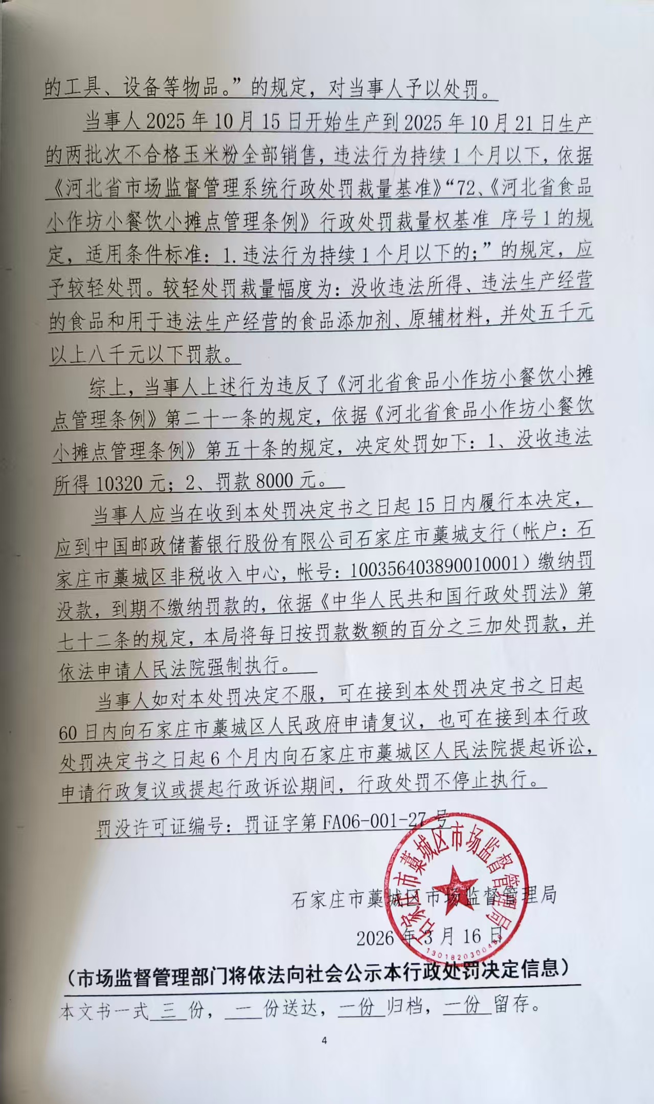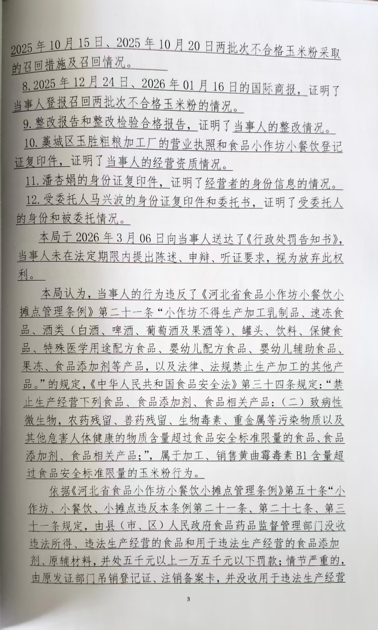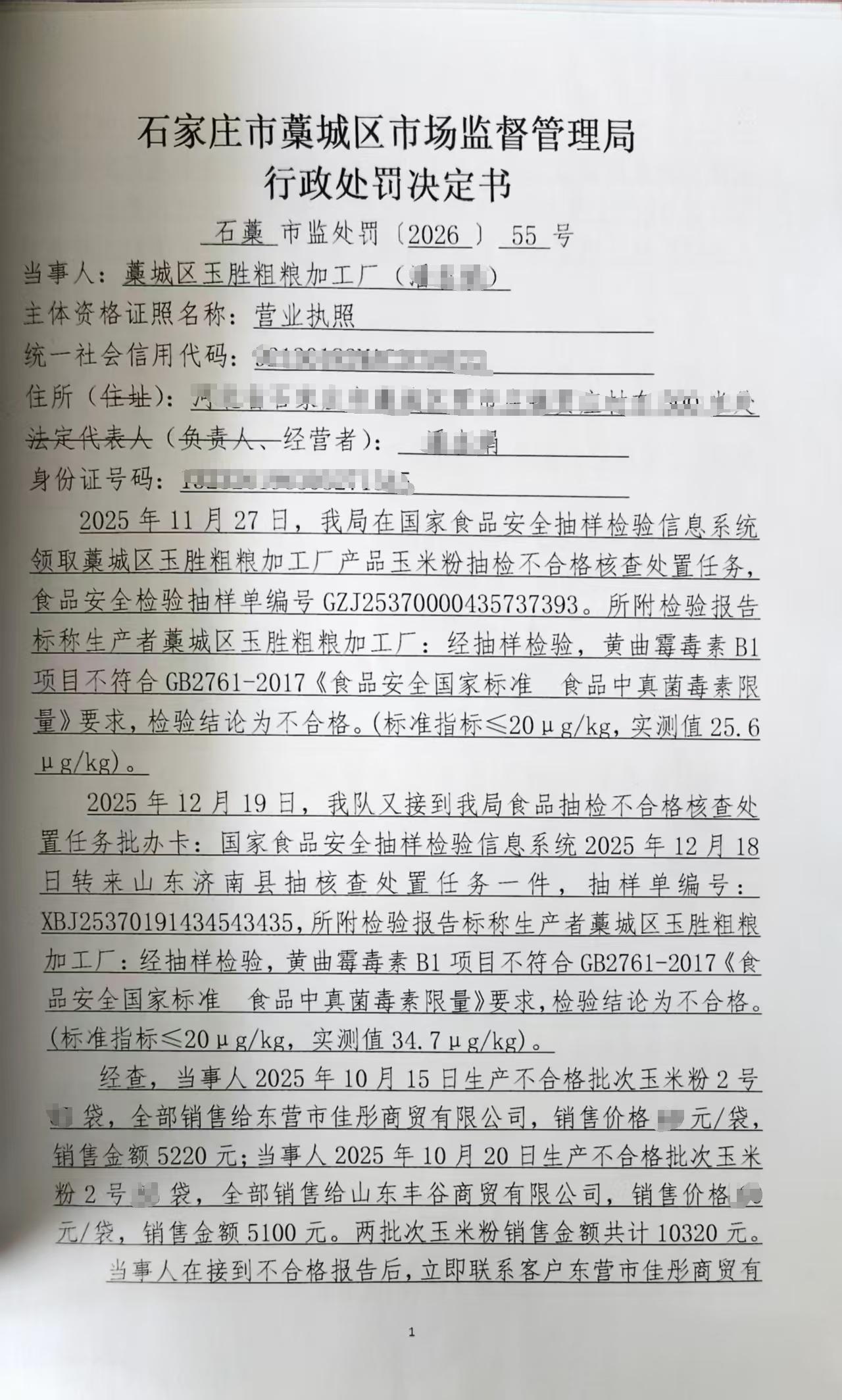 城区玉胜粗粮加工厂(潘杏娟)加工销售黄曲霉毒素B1含量超过食品安全标准限量的玉米粉案 石藁市监处罚〔2026〕55号