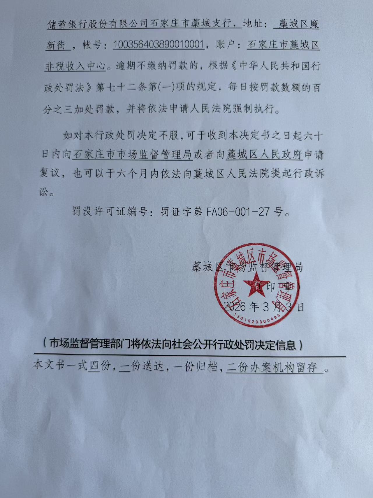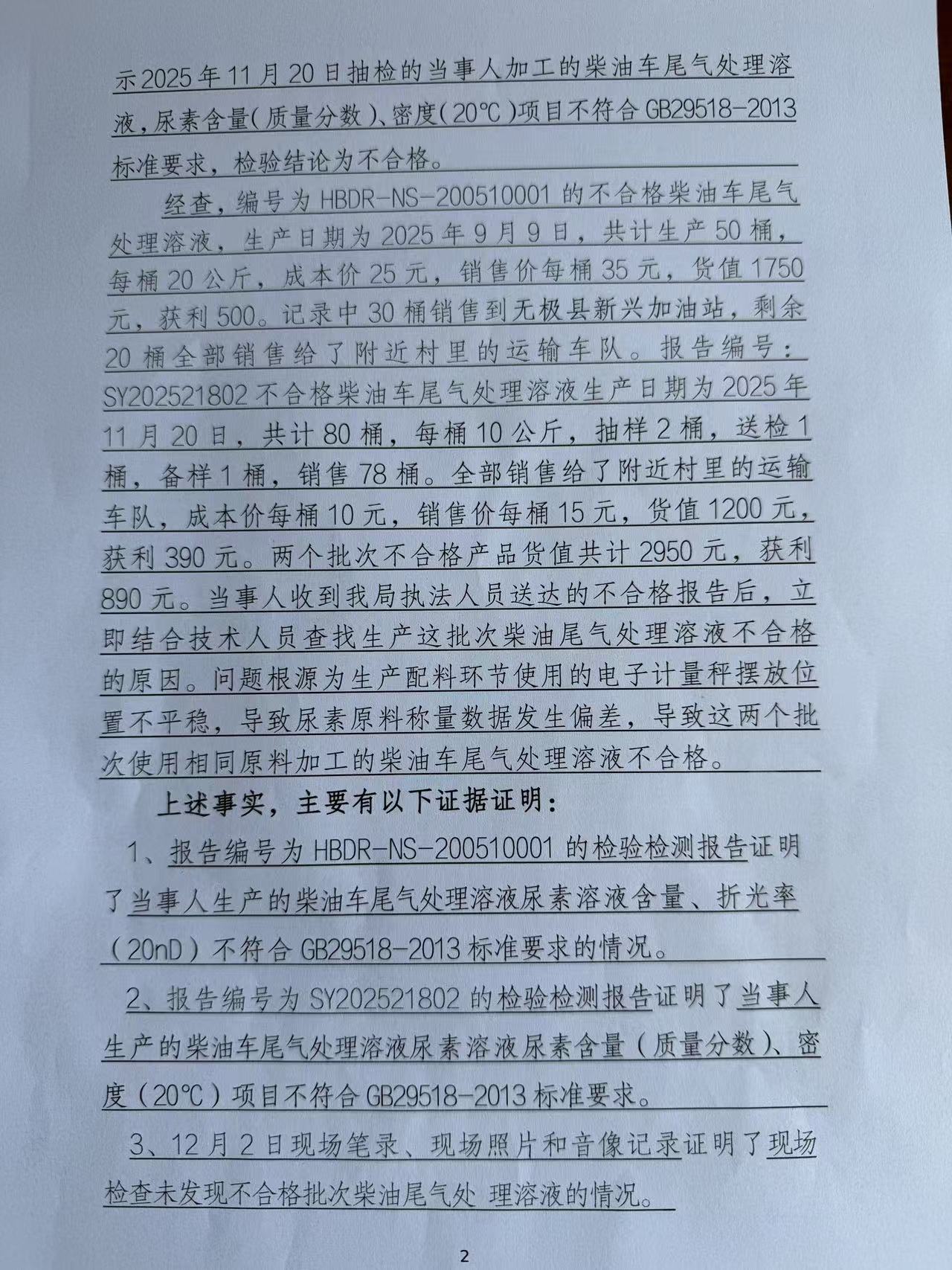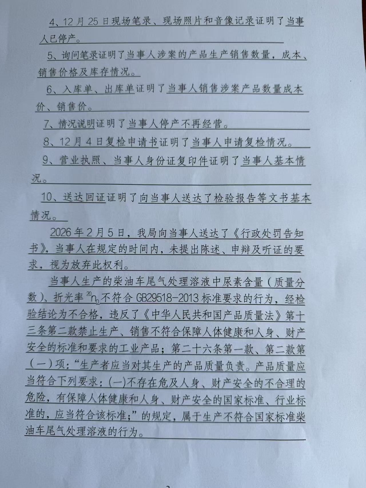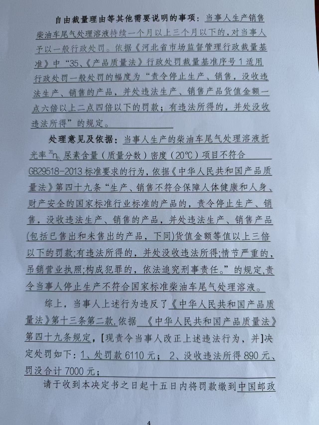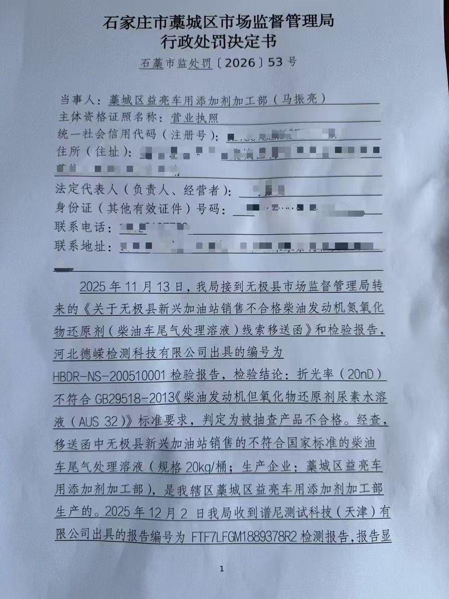 藁城区益亮车用添加剂加工部生产销售不符合标准柴油车尾气处理溶液案 石藁市监处罚〔2026〕53号