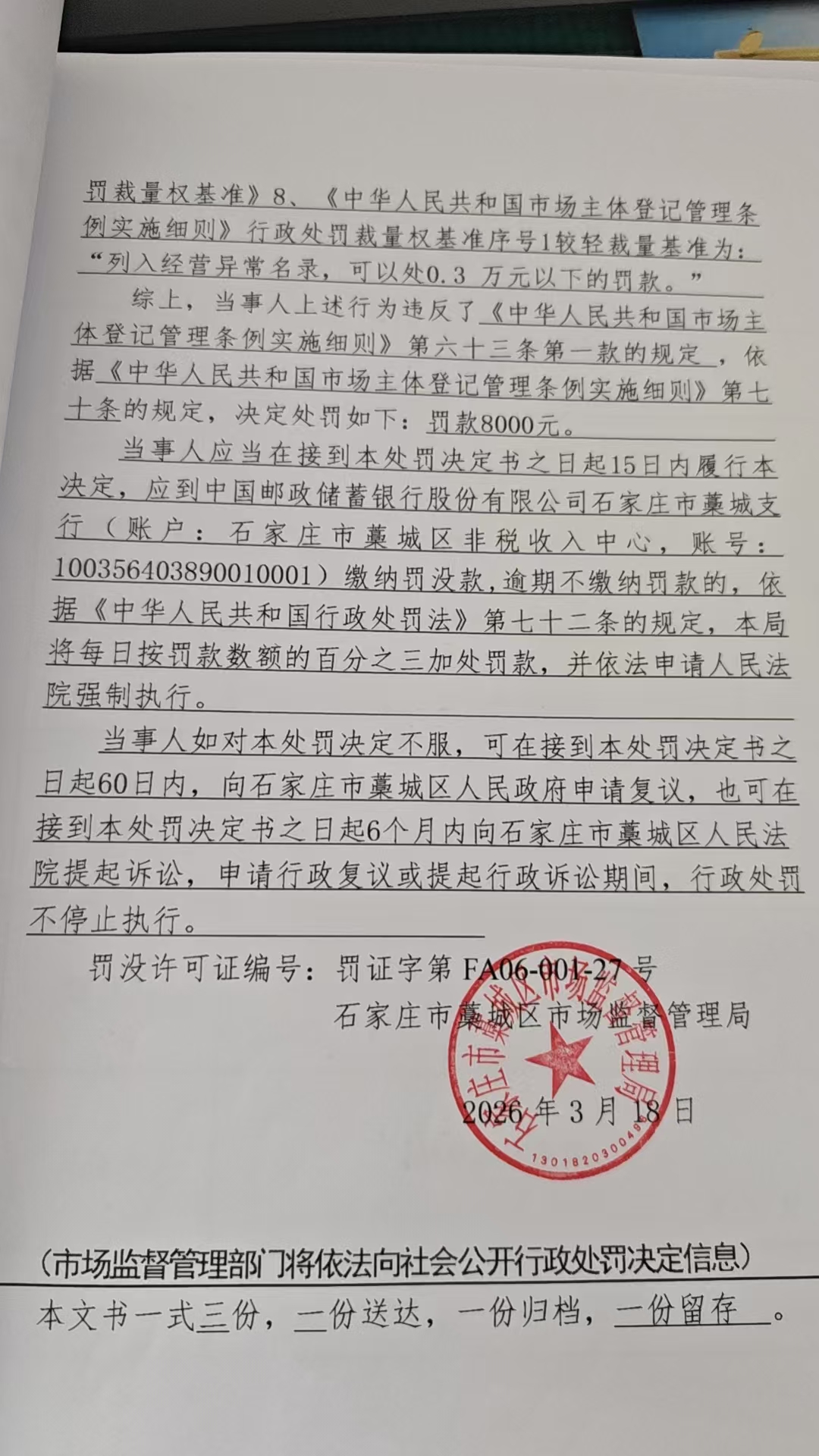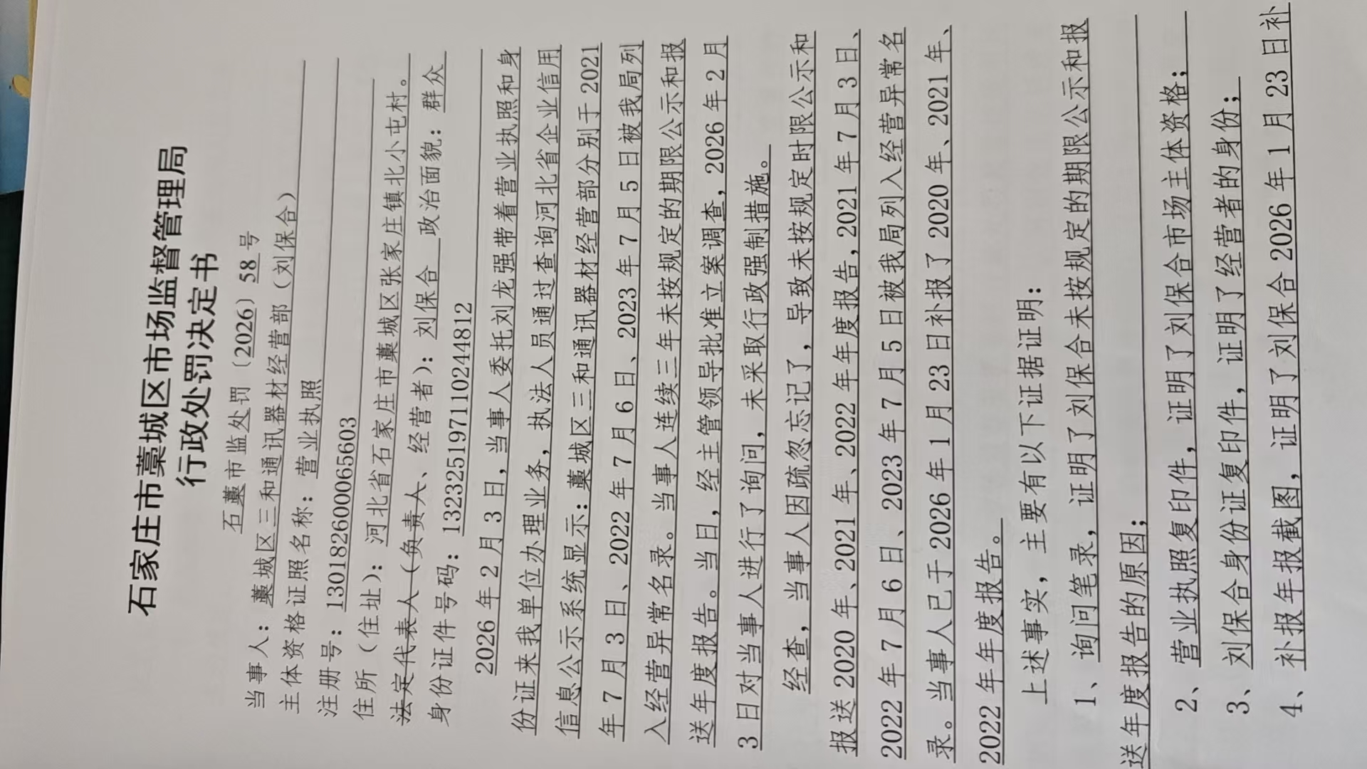 藁城区三和通讯器材经营部(刘保合)未按规定的期限公示和报送年度报告案