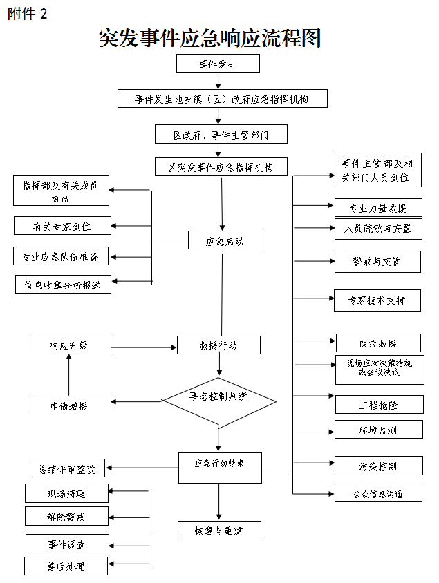 发生一般及以上级别突发事件,应急响应也可以分为两级:基本应急响应和扩大应急响应。基本应急响应有由区政府主管负责同志决定启动并组织指挥,处置本区发生的一般级别突发事件;扩大应急响应由区政府主要负责同志决定启动并组织指挥,协助上级政府处置超出本区处置能力的较大及以上级别的突发事件。